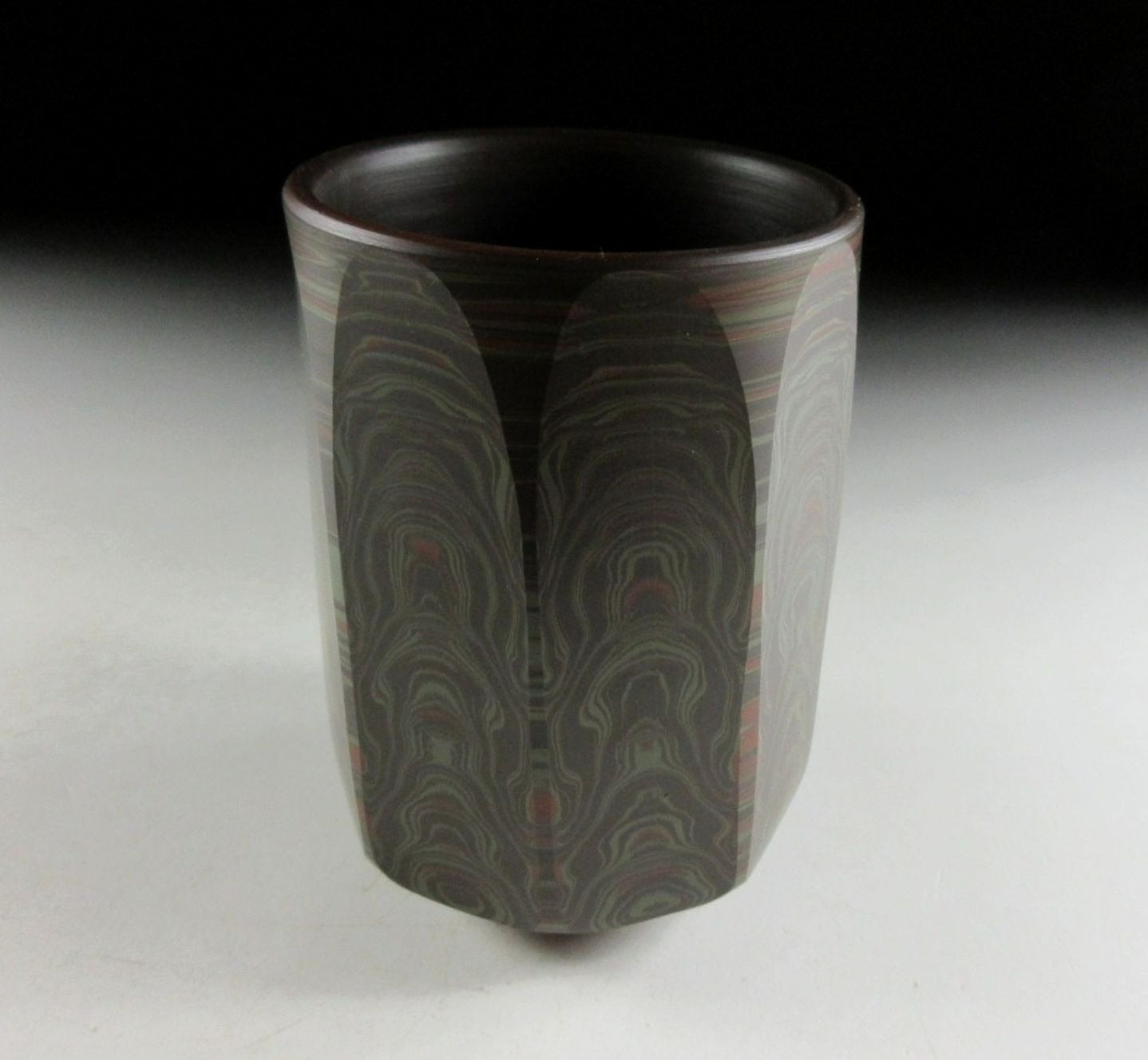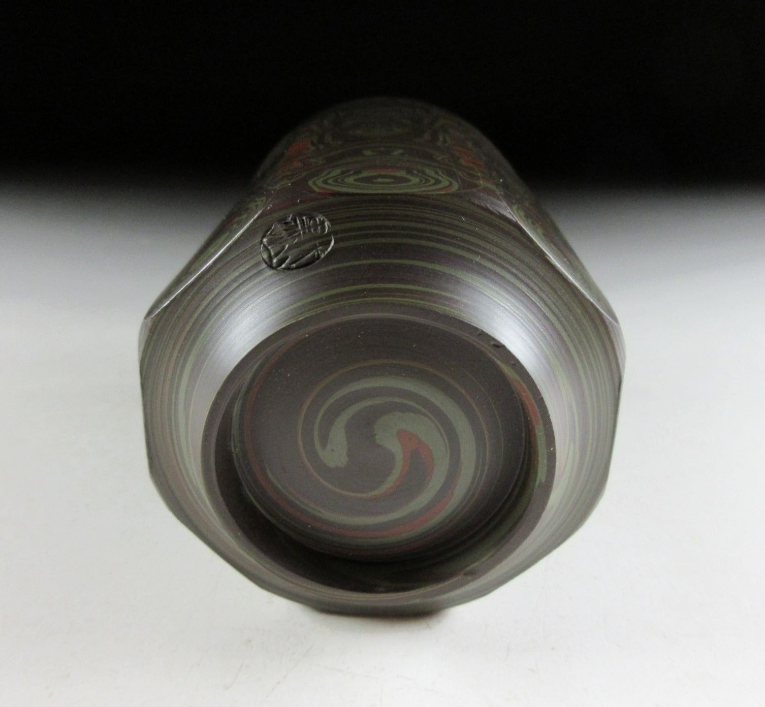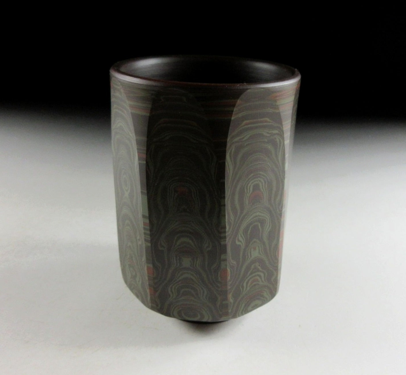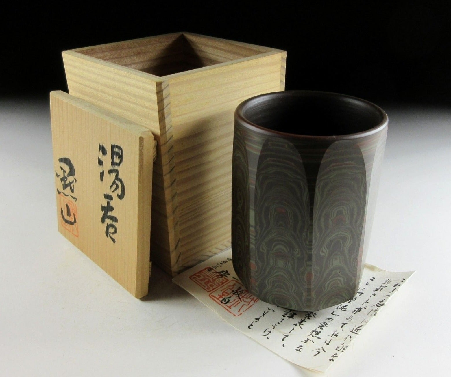 This listing is for a beautiful Tokoname-ware yunomi made around 45 years ago by Tanigawa Mokudo. It is wheel-thrown and feature what is known as the neriage technique. Neriage refers to the technique of marbling of clays of contrasting colour when wheel throwing. In this case several colours of clay have been mixed together and the surface has been incised with vertical grooves revealing beautiful circular patterns in the clay below. The stamp of the potter can be found on the bottom, and it comes with its original signed wooden storage box. It also comes with a Japanese language profile paper.