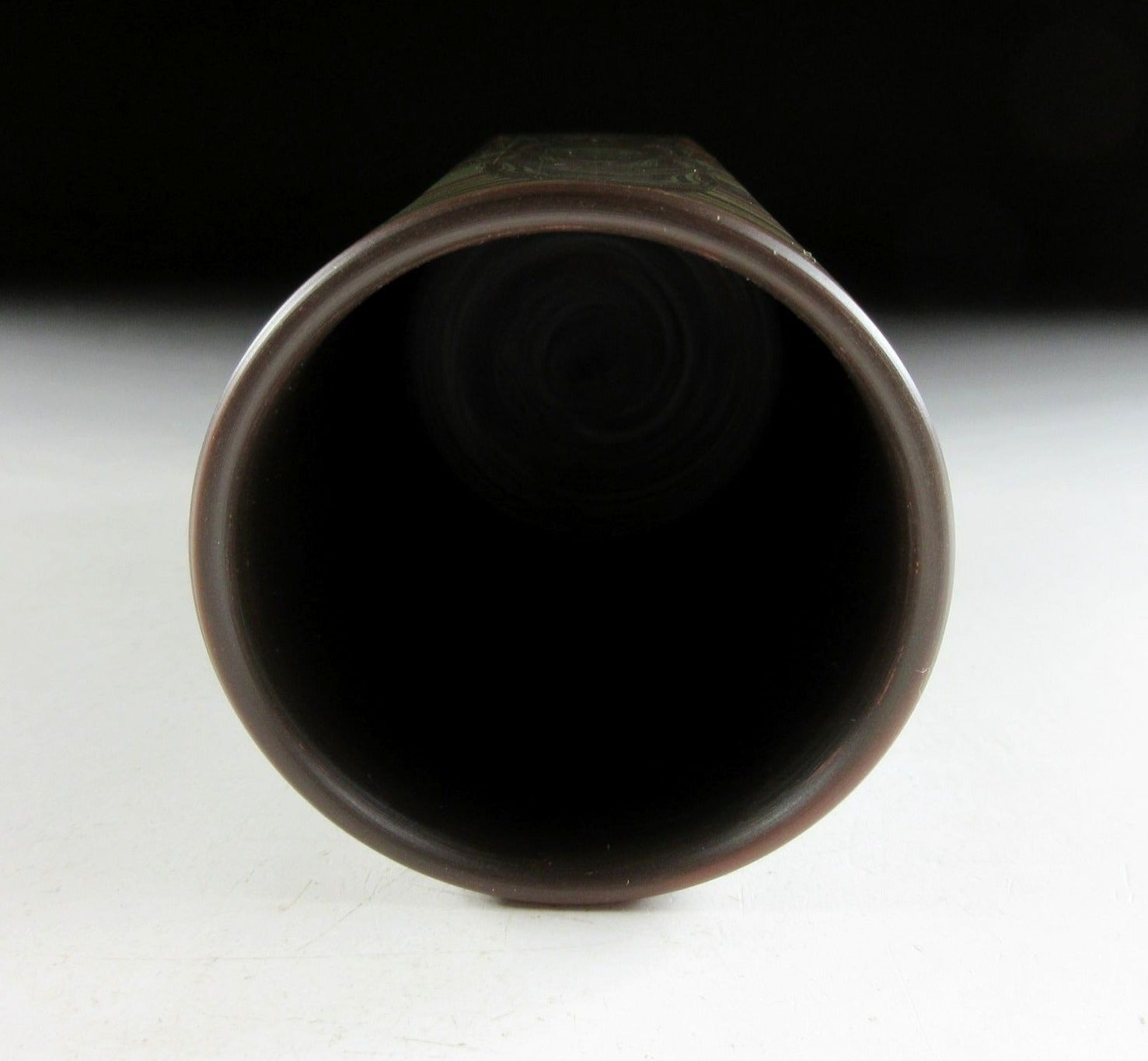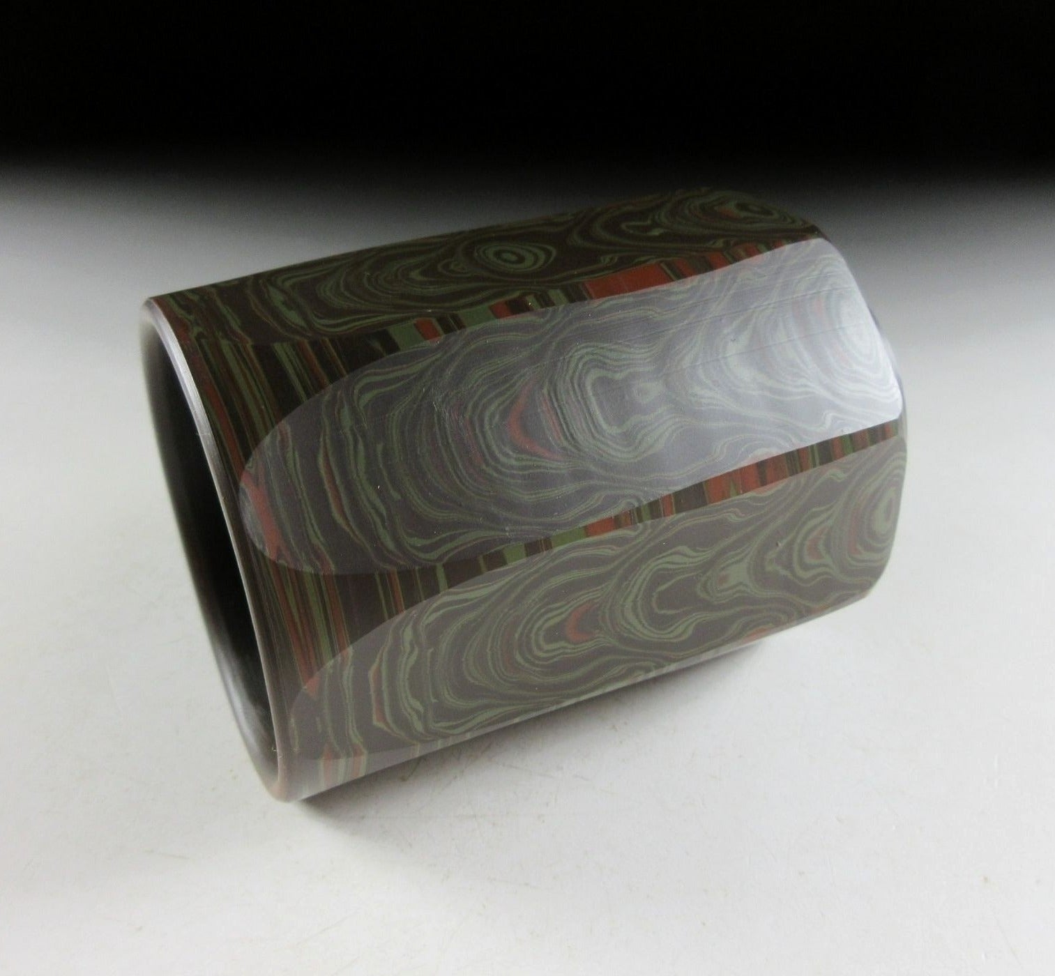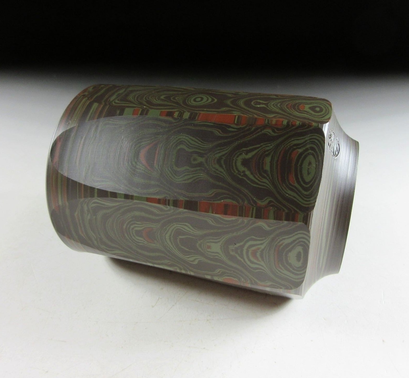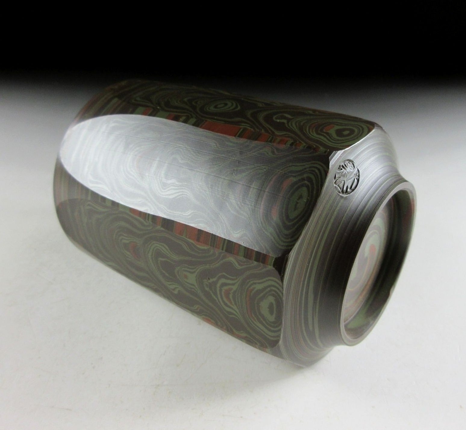 This listing is for a beautiful Tokoname-ware yunomi made around 45 years ago by Tanigawa Mokudo. It is wheel-thrown and feature what is known as the neriage technique. Neriage refers to the technique of marbling of clays of contrasting colour when wheel throwing. In this case several colours of clay have been mixed together and the surface has been incised with vertical grooves revealing beautiful circular patterns in the clay below. The stamp of the potter can be found on the bottom, and it comes with its original signed wooden storage box. It also comes with a Japanese language profile paper.