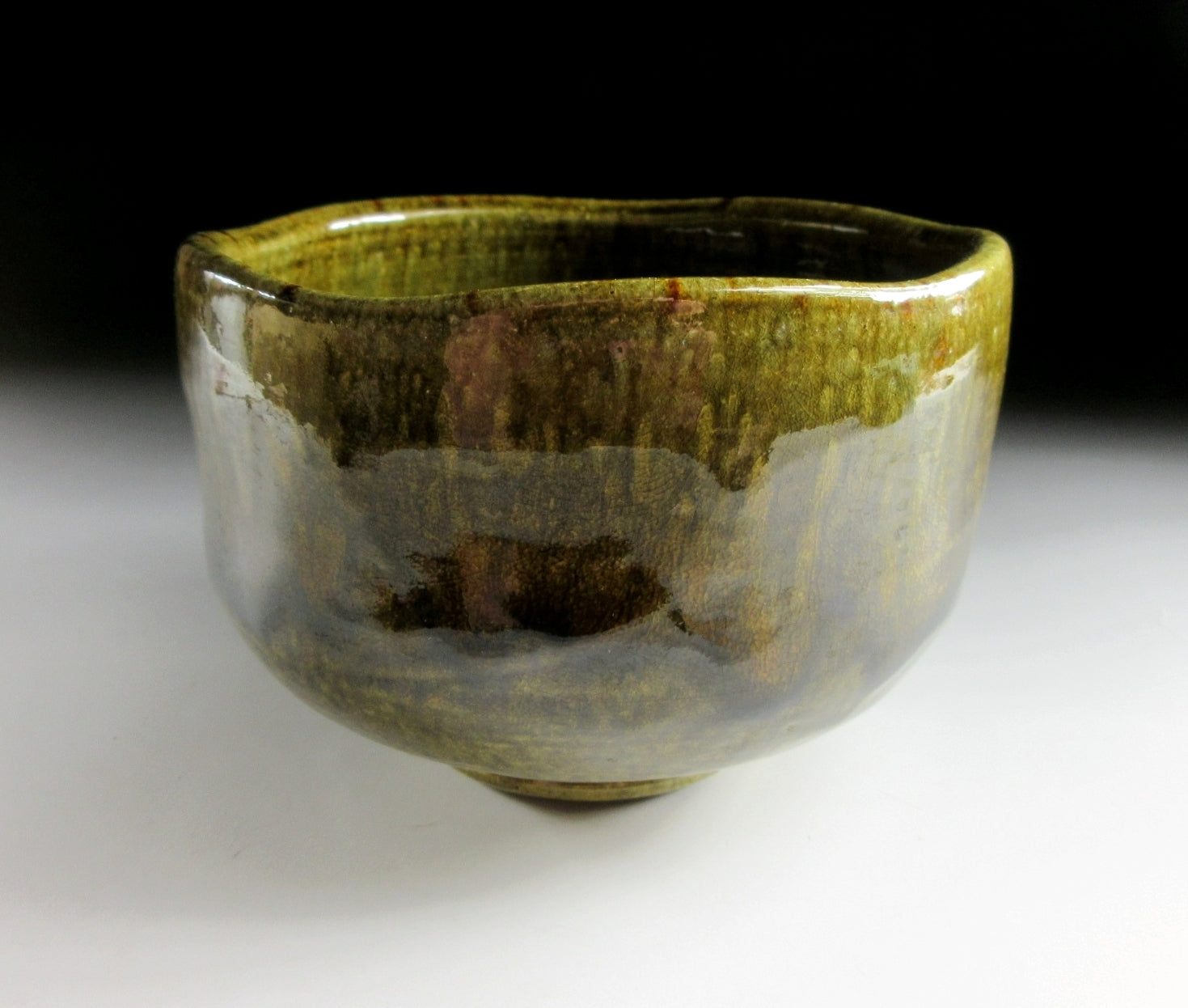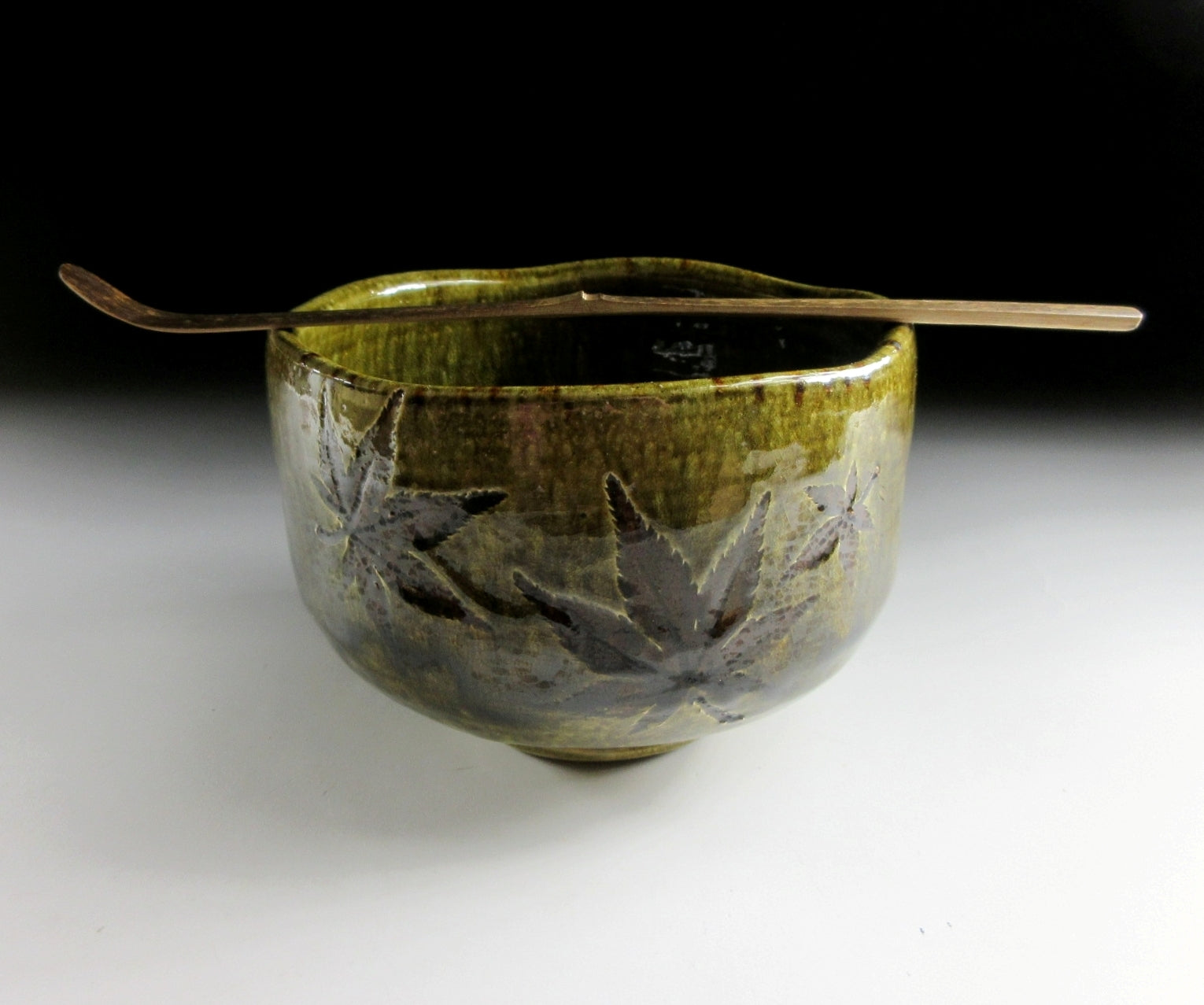 This listing is for a very seasonal Kankake-ware chawan tea bowl made by noted potter, Tanimoto Shuko. It is hand-turned and features transparent golden-green transparent glaze over a low-fired base. The front also features imprints of momiji maple leaves trimmed with brown glaze. This is a lovely piece for the cooler months. The stamp and signature of the potter can be found on the bottom, and it comes with its original signed wooden storage box. It also comes with a stamped orange wrapping cloth for when the item is not in use, as well as a Japanese language profile paper about Kankake-ware. *PLEASE NOTE THAT THE CHASHAKU TEA SCOOP IS NOT INCLUDED.