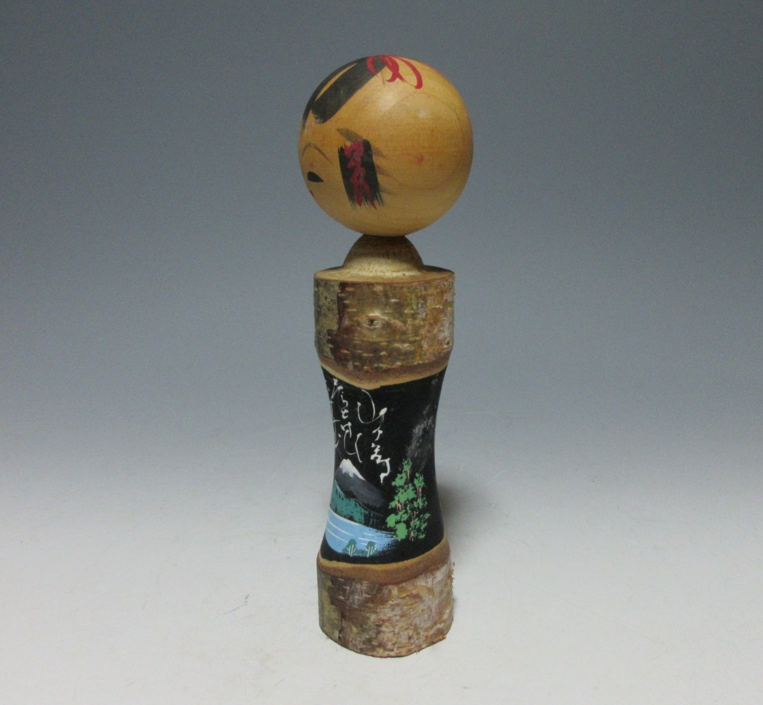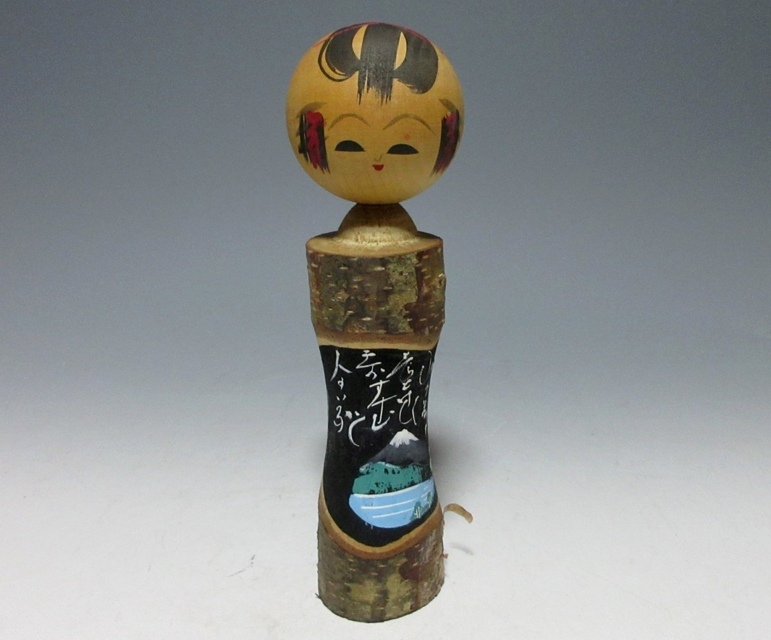This listing is for a vintage kokeshi doll made around 20 years ago and signed ‘Nakayama’. It is made of shirakaba white birch, and the front features Mt. Fuji and part of a tanka poem written by Wakayama Bokusai (1885-1928). Bokusai worshipped Mt. Fuji’s beauty as the seasons changed, and he was particularly fond of the view from Senbon Matsubara pine forest in Numazu, Shizuoka Prefecture. He often spoke of the views of the evergreen pines, set against a snow-capped Mt. Fuji dyed red by the setting sun over Suruga Bay. Bokusui composed tanka about sadness, loneliness, solitude, and sorrow. In one of his poems he wrote, “If we cross many mountains and rivers, we'll travel to a country filled with loneliness again today”, and this was perhaps in reference to Mt. Fuji’s solitary presence.