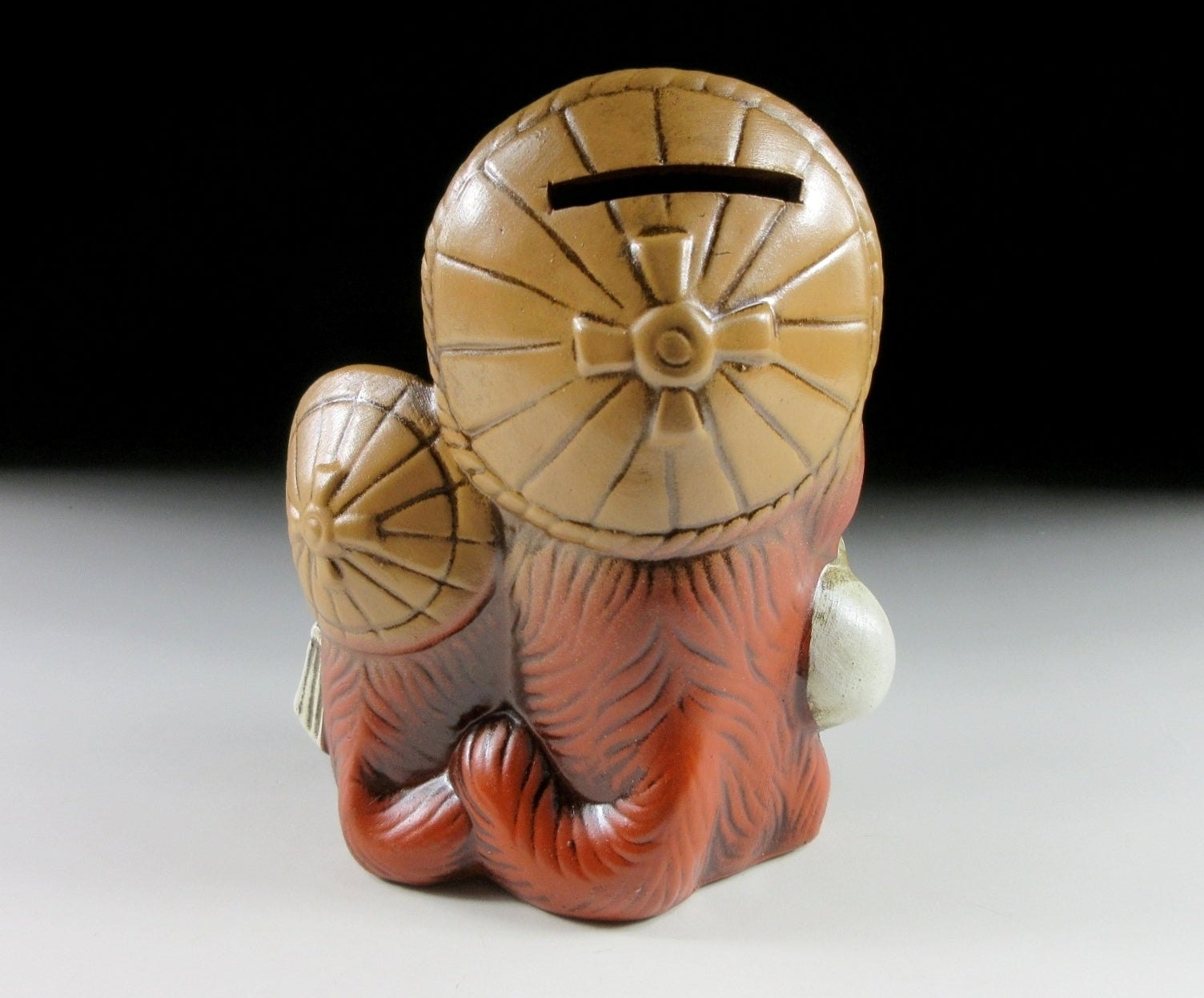 This listing is for a whimsical earthenware moneybox with paper storage box. It is made of low fired earthenware and is moulded to resemble a pair of tanuki. There’s a coin slot in the back but it does not come with a rubber stopper in the bottom. This piece was made using a slip mould, so there’s a small hole in the bottom covered with green felt.