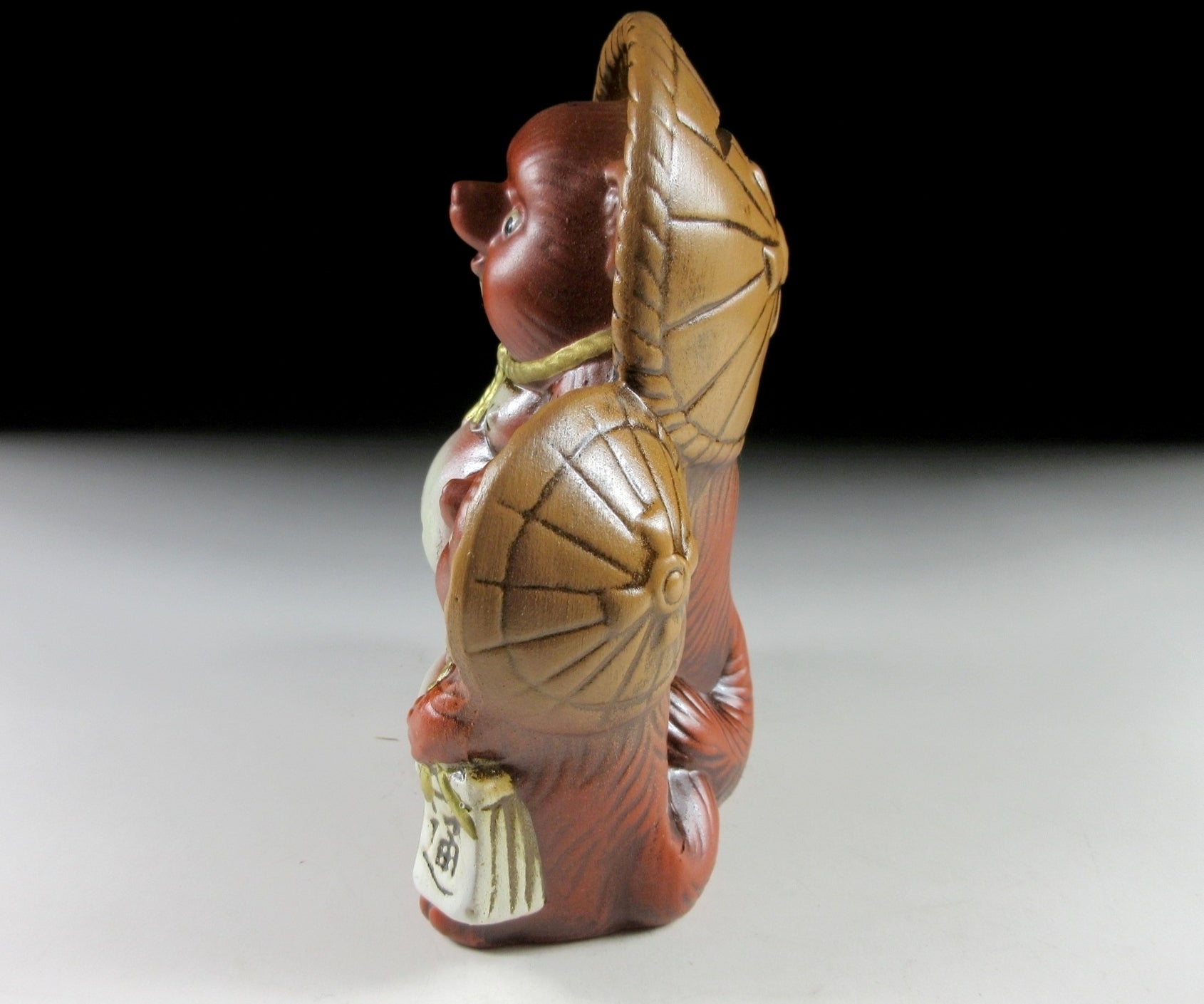 Tanuki are generally considered to bring good luck and are characterized as having eight traits. The straw hat protects against trouble, the big eyes are for surveying the environment and making good decisions, the sake bottle symbolizes virtue, the big tail provides stability and strength, the very large testicles symbolize financial luck and big sacks of money, the promissory note signifies trust, the large belly indicates the ability to make good decisions under pressure, and finally they are friendly with a warm smile.