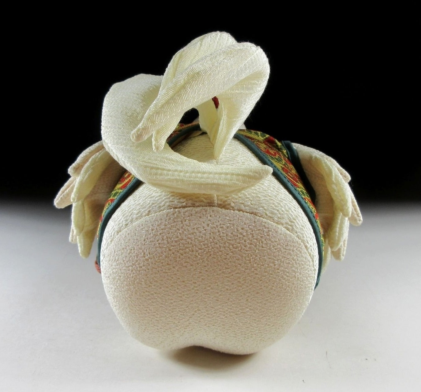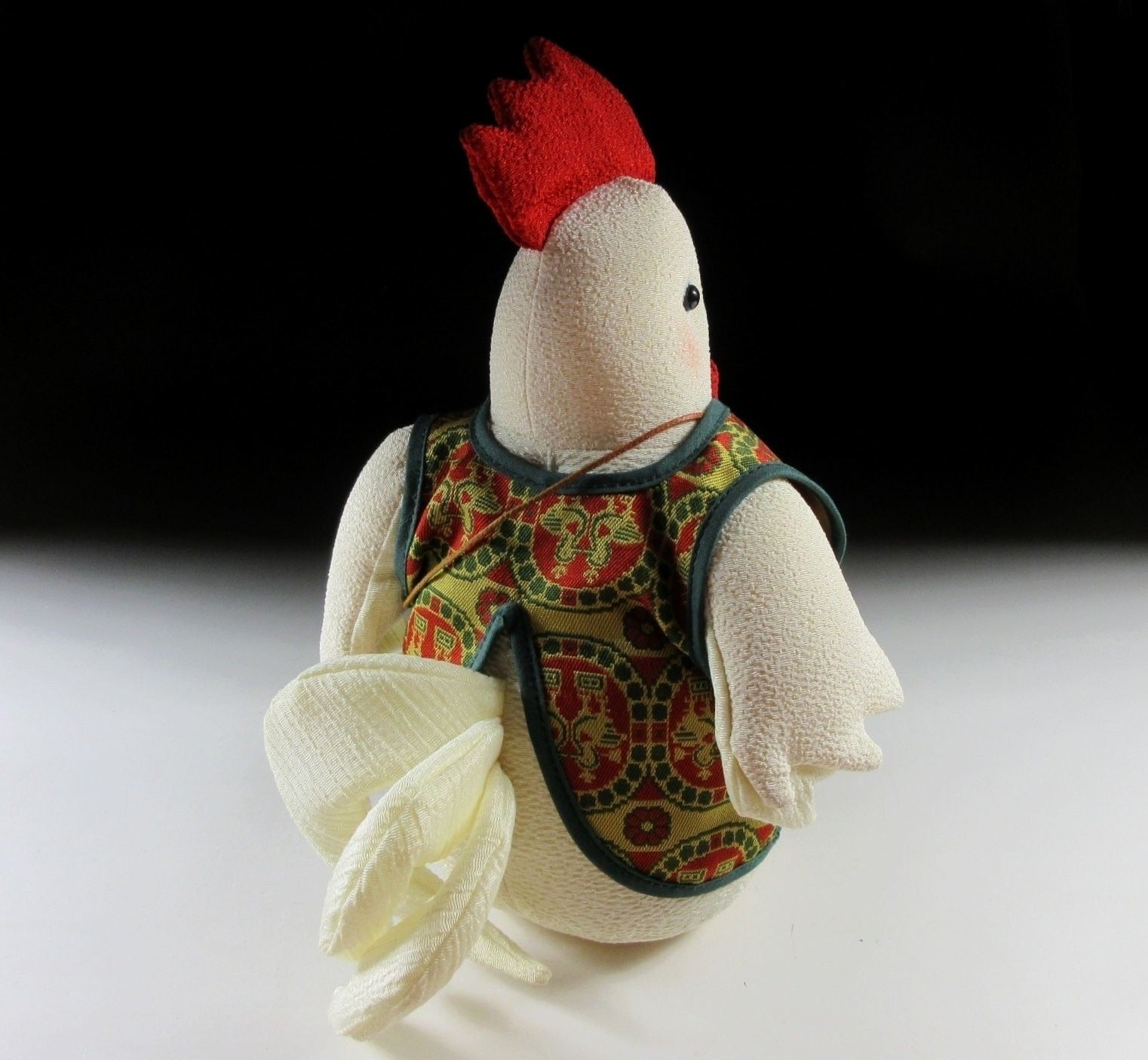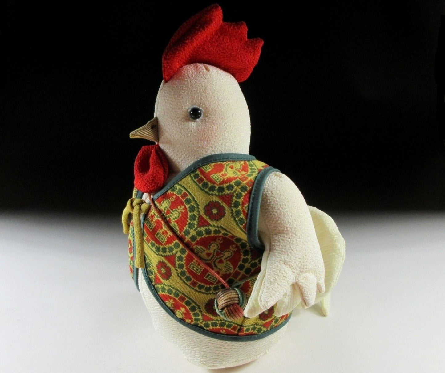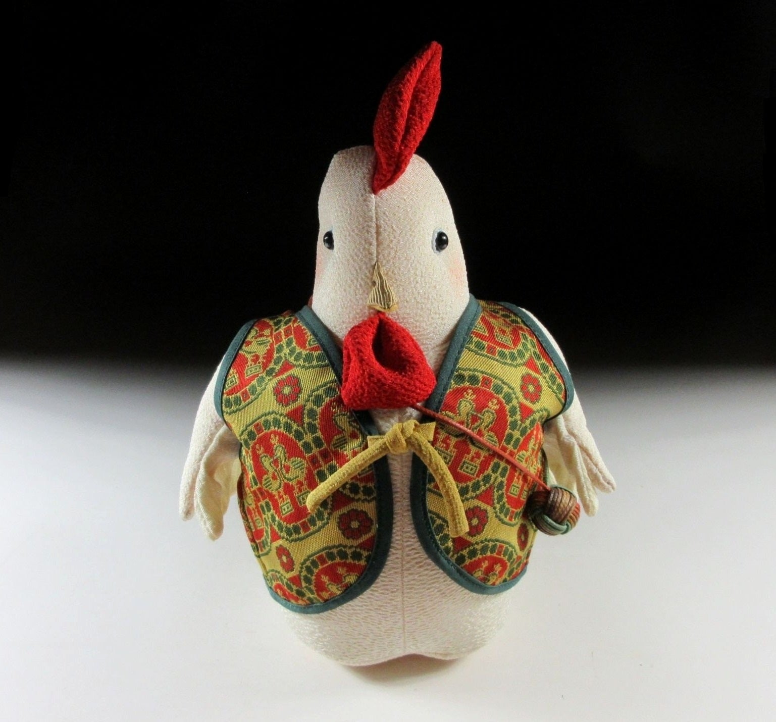 This listing is for a fabric rooster okimono made by Tatsumura Textile Co. The rooster is made of crepe fabric and features a brocade jacket. According to the description provided the pattern is based on a piece of fabric dating back to the Tang dynasty. It is Islamic in style and consists of two confronted birds inside a floral circle. Tatsumura has reworked this design in red, green and yellow and added a string on front to fasten the jacket. This rooster was most likely made to commemorate the Year of the Rooster back in 1993.