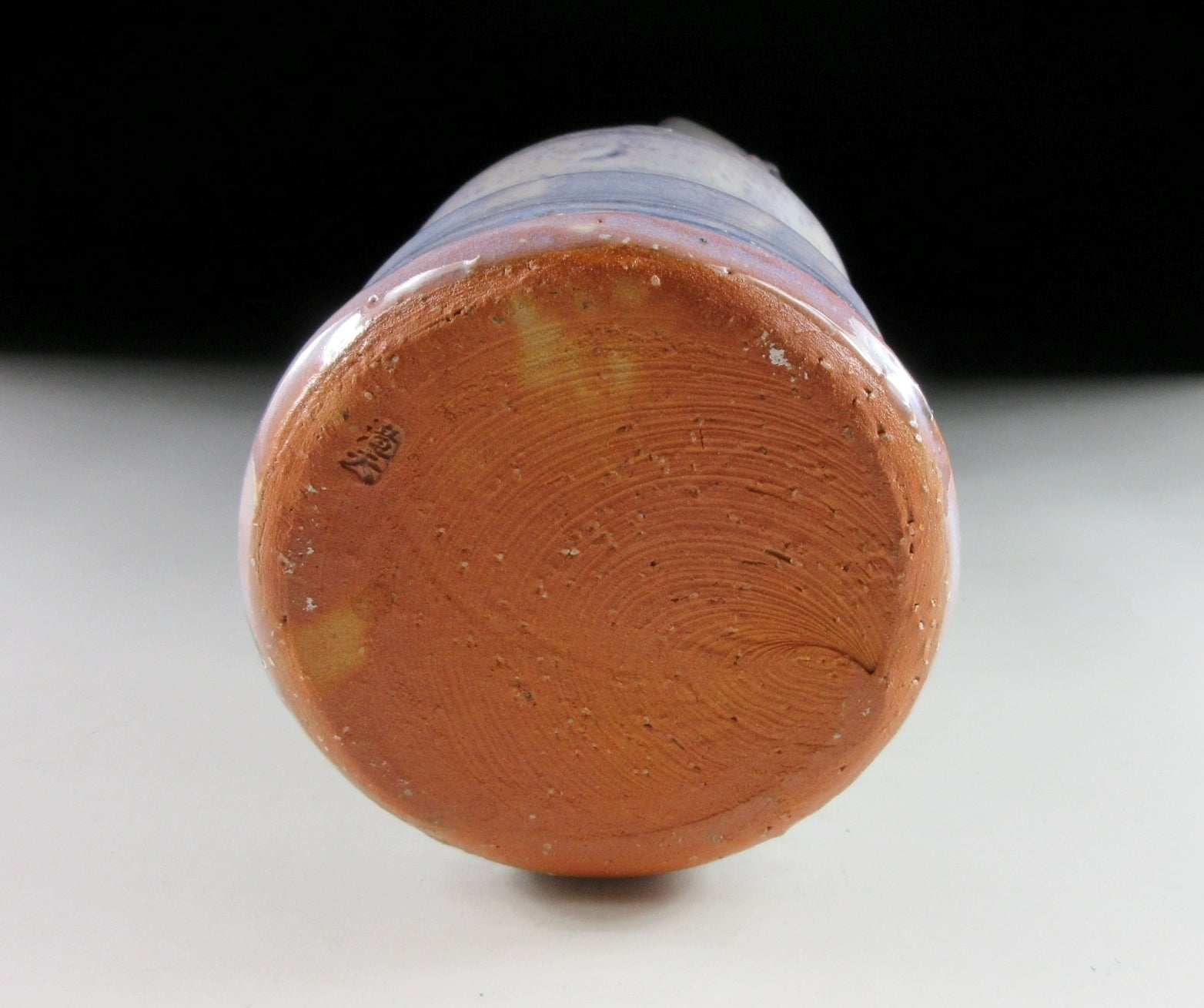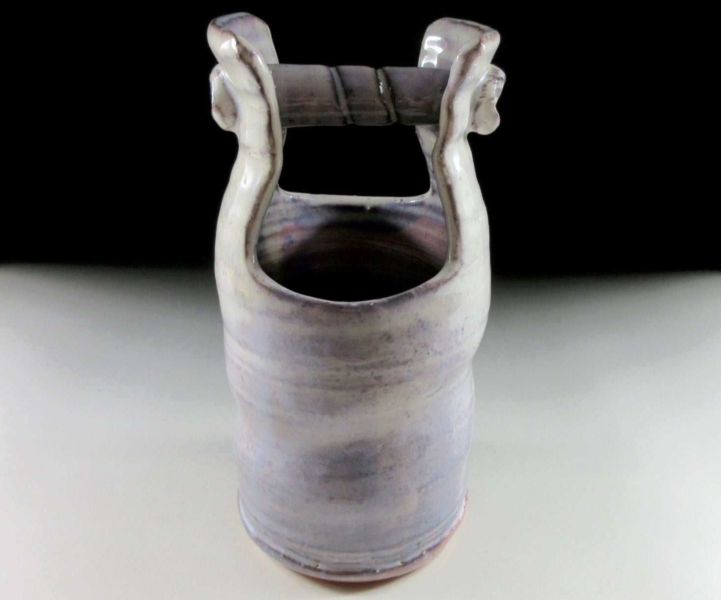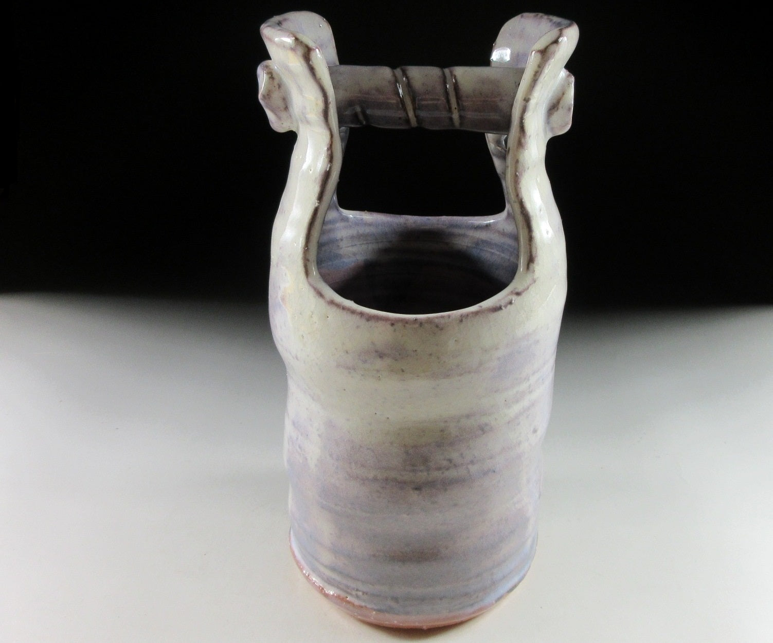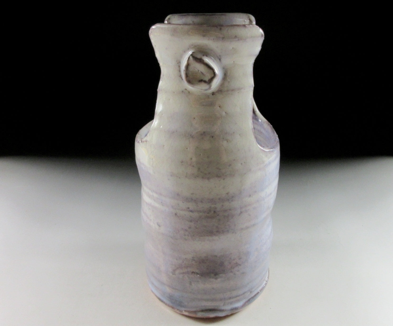 This listing is for a reasonably large Hagi-ware vase made around 5-10 years ago and signed ‘Mitsuo’. It is wheel-thrown and has a pale purple appearance, although it’s actually coated in two layers of semi-transparent white glaze. The clay base underneath combined with the white colour of the glaze is what gives it its slightly purple appearance. This type of vase is called a teoke, which is the ‘water pail’ type. It has a round coil-made handle, and the vase is glazed on the interior. The stamp of the potter can be found on the bottom, sorry but no box for this one.