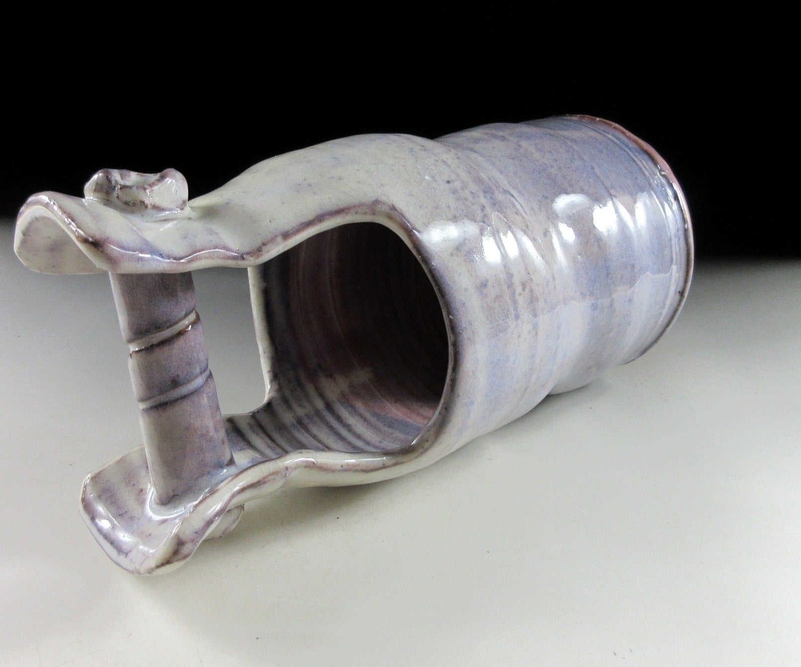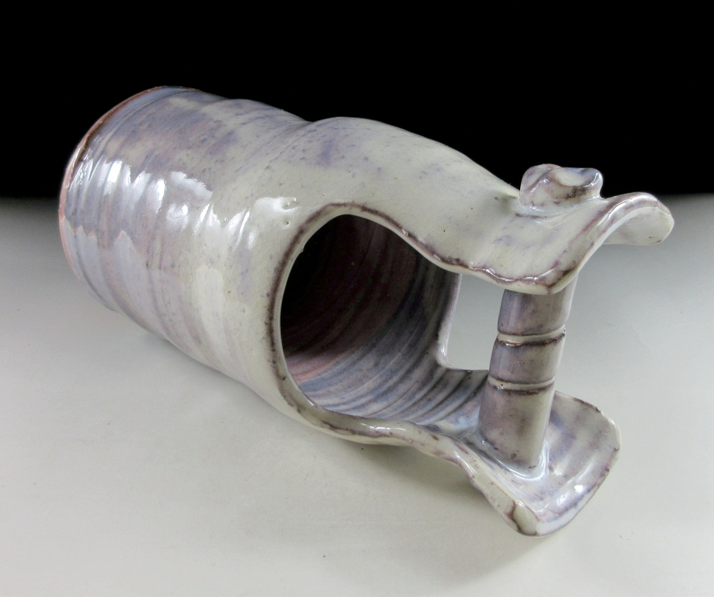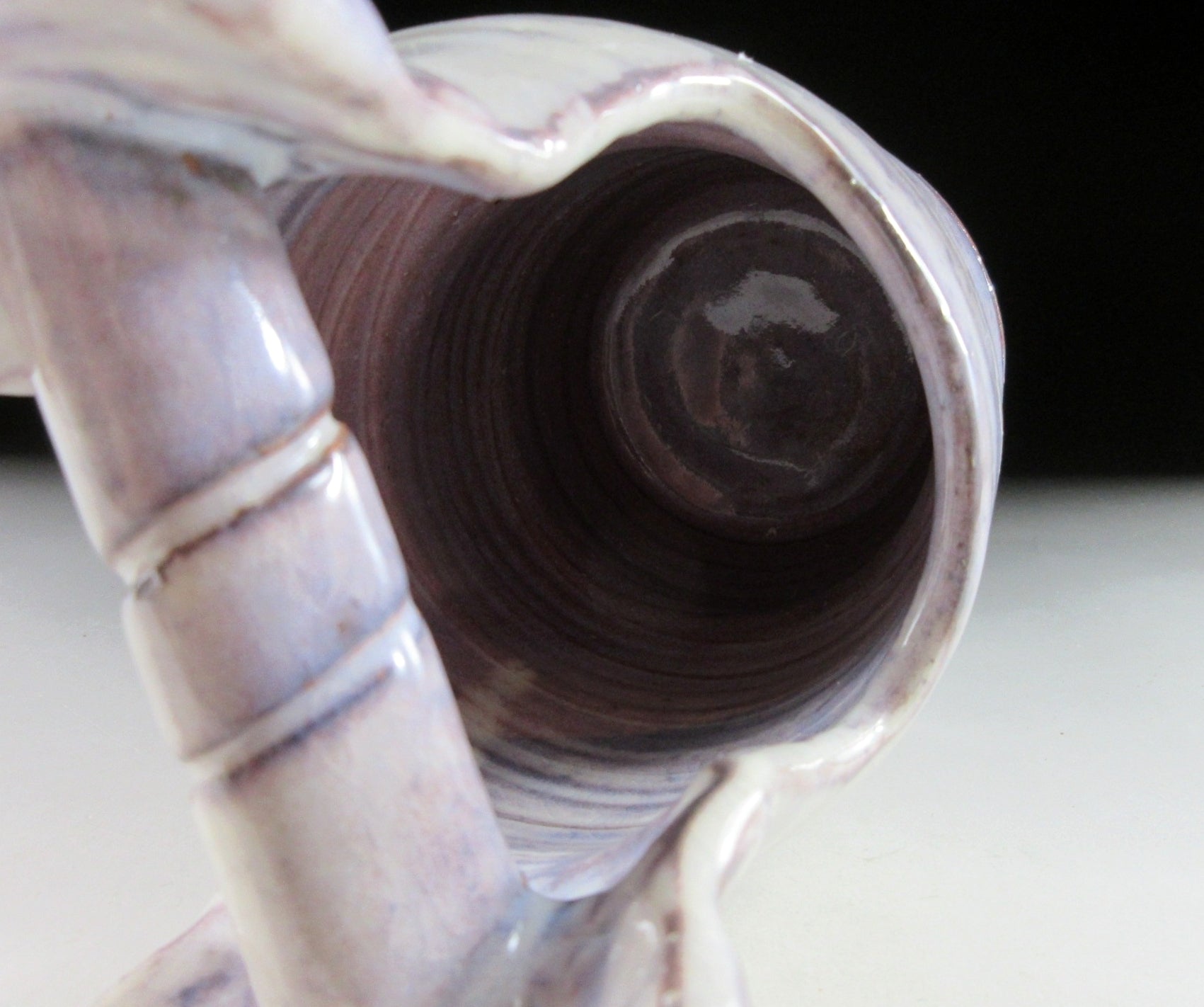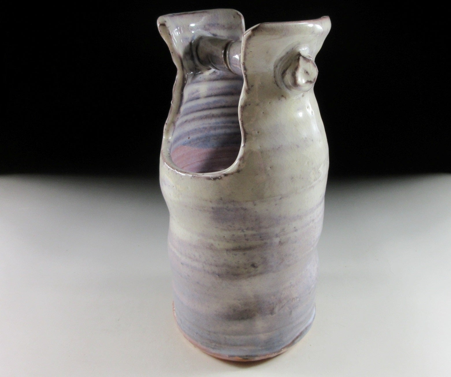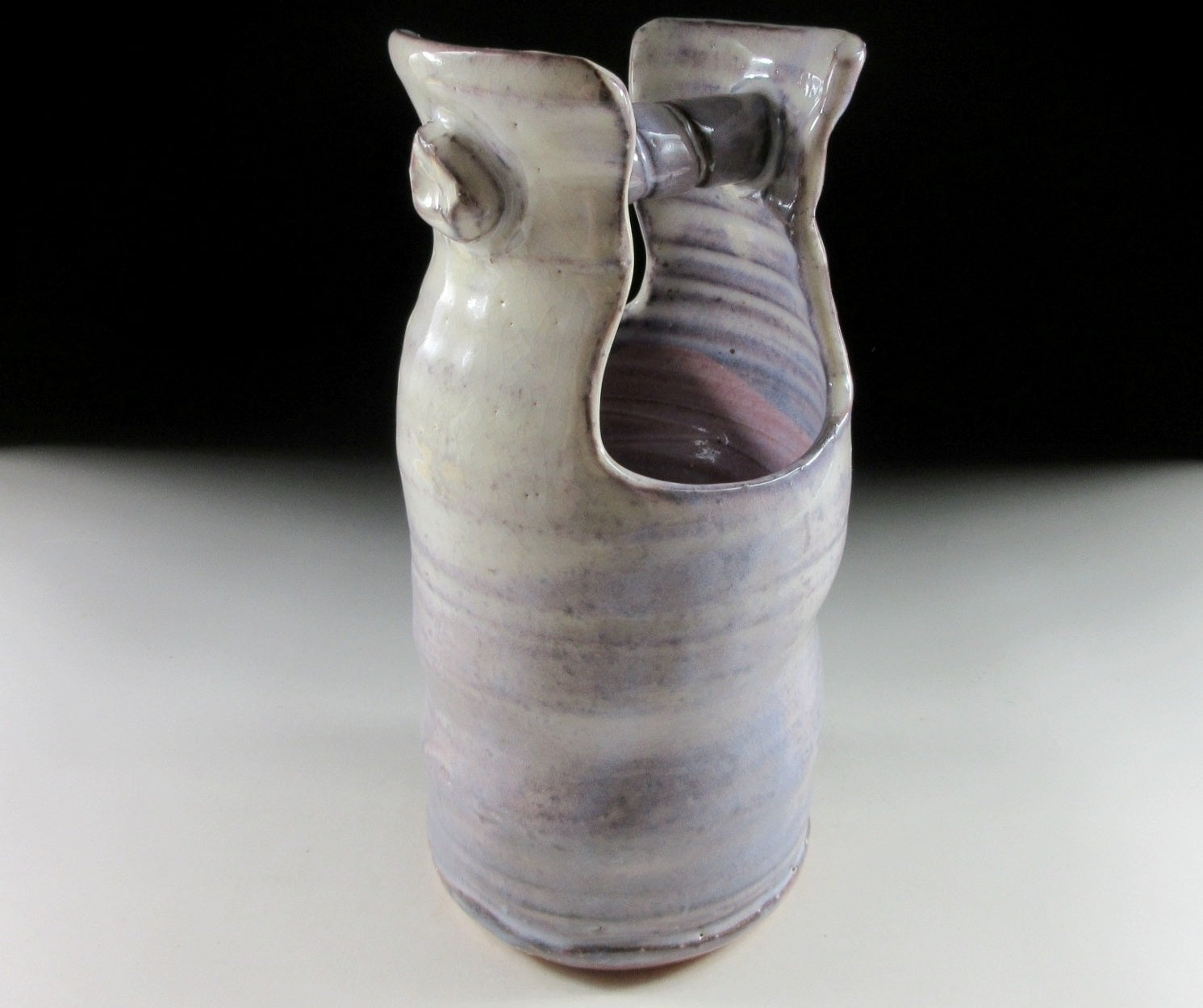 This listing is for a reasonably large Hagi-ware vase made around 5-10 years ago and signed ‘Mitsuo’. It is wheel-thrown and has a pale purple appearance, although it’s actually coated in two layers of semi-transparent white glaze. The clay base underneath combined with the white colour of the glaze is what gives it its slightly purple appearance. This type of vase is called a teoke, which is the ‘water pail’ type. It has a round coil-made handle, and the vase is glazed on the interior. The stamp of the potter can be found on the bottom, sorry but no box for this one.