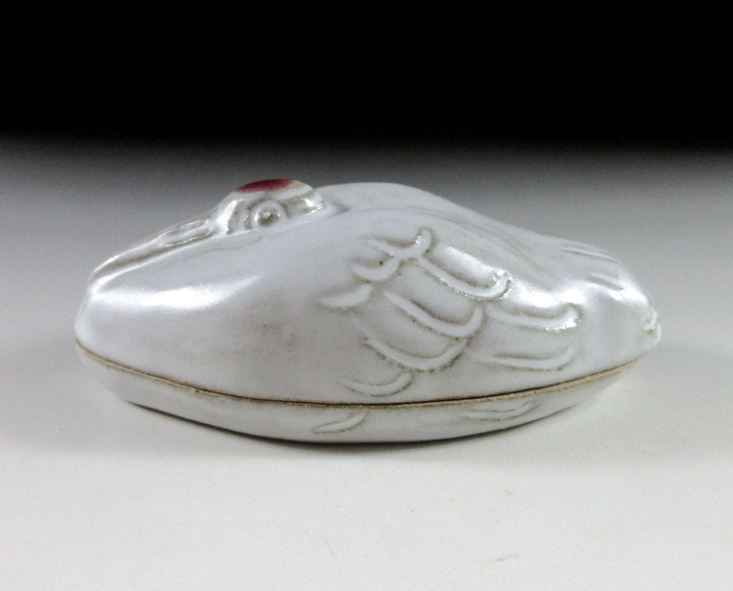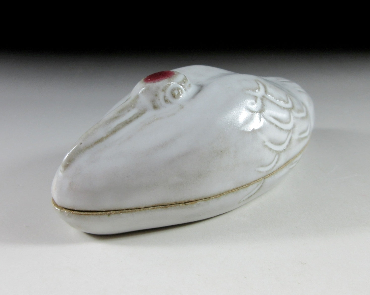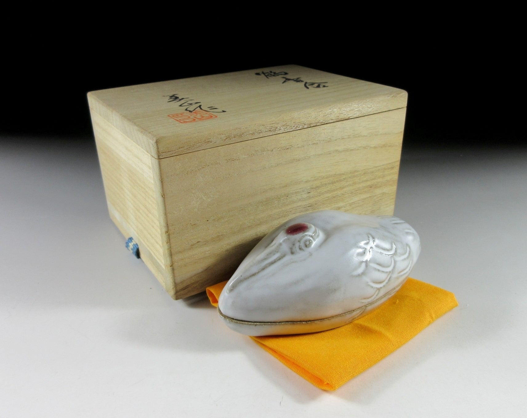 This listing is for an attractive Mino-ware crane kogo made around 20 years ago by noted potter, Terada Bizan III. It is made of stoneware and moulded to resemble a crane. Cranes are thought to live for 1000 years, so they are regarded as an auspicious character symbolizing longevity. They are commonly used to decorate teaware during New Year to bring year round fortune. Its size and shape is suitable for both woodchip and kneaded incense, although pottery kogo are typically used for kneaded incense during the cooler months. This piece is ample in size and it appears unused. The stamp of the potter can be found on the bottom, and it comes with its original signed storage box. It also comes with a stamped turmeric coloured wrapping cloth for when the item is not in use.