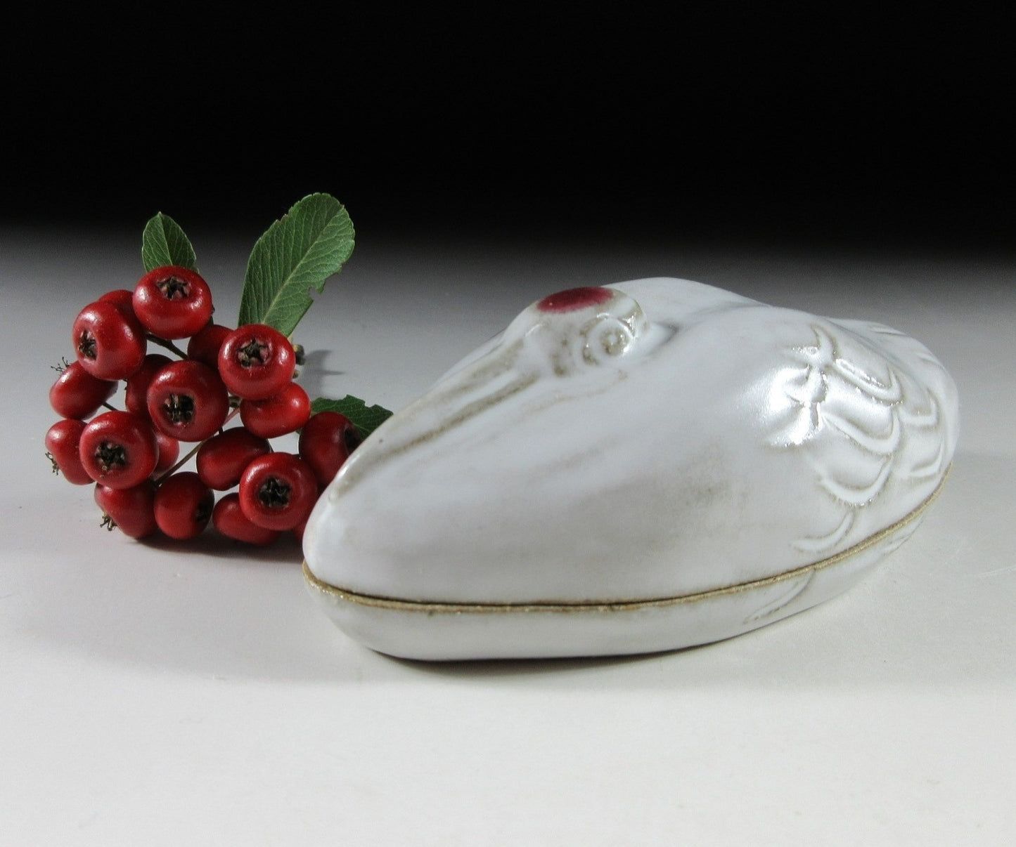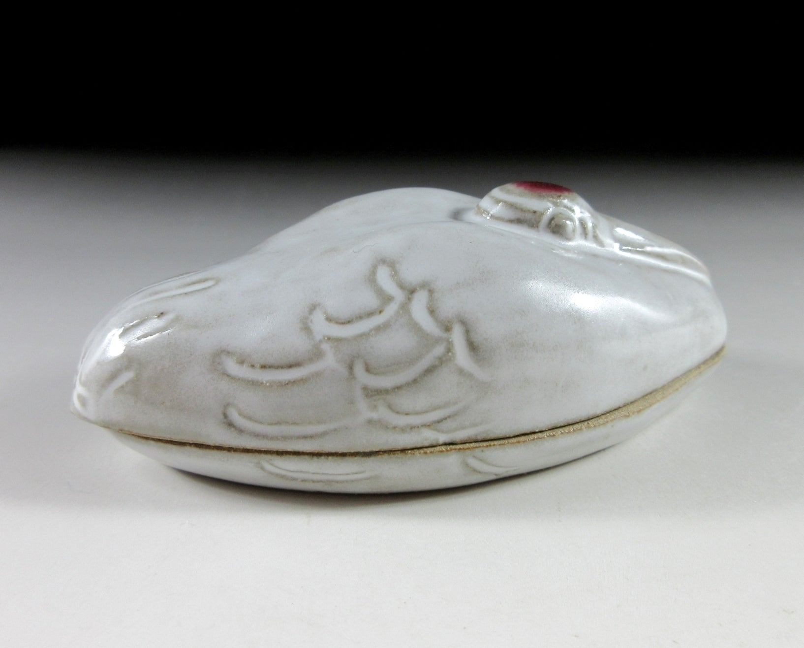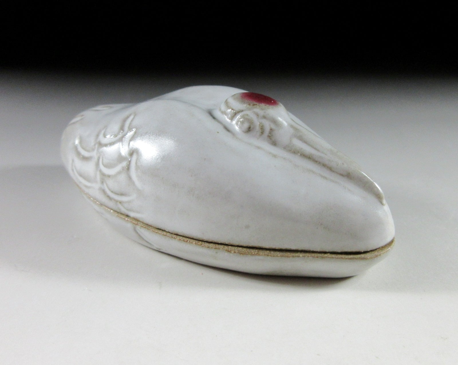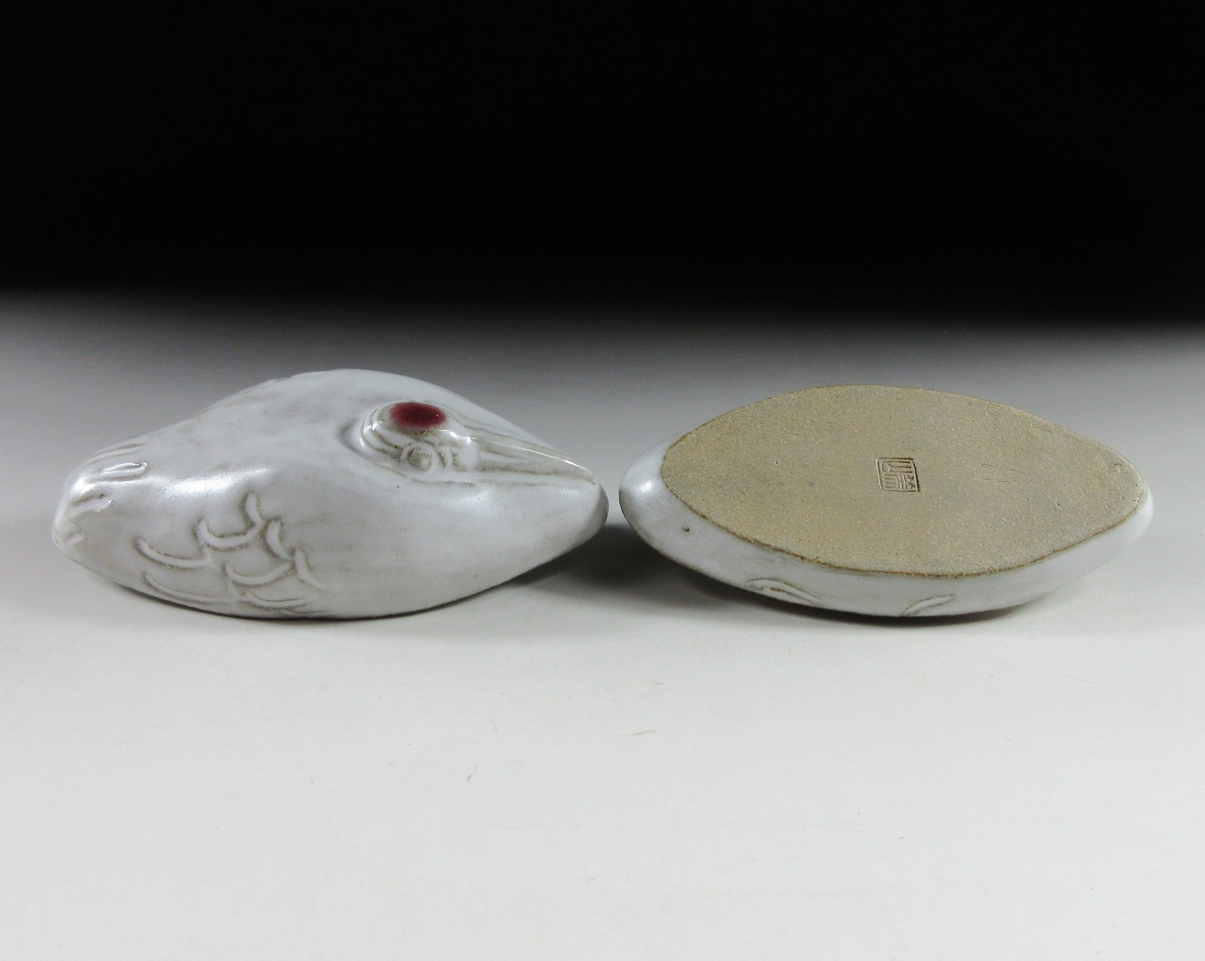 This listing is for an attractive Mino-ware crane kogo made around 20 years ago by noted potter, Terada Bizan III. It is made of stoneware and moulded to resemble a crane. Cranes are thought to live for 1000 years, so they are regarded as an auspicious character symbolizing longevity. They are commonly used to decorate teaware during New Year to bring year round fortune. Its size and shape is suitable for both woodchip and kneaded incense, although pottery kogo are typically used for kneaded incense during the cooler months. This piece is ample in size and it appears unused. The stamp of the potter can be found on the bottom, and it comes with its original signed storage box. It also comes with a stamped turmeric coloured wrapping cloth for when the item is not in use.