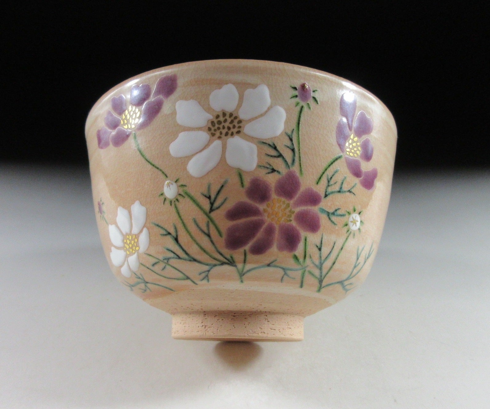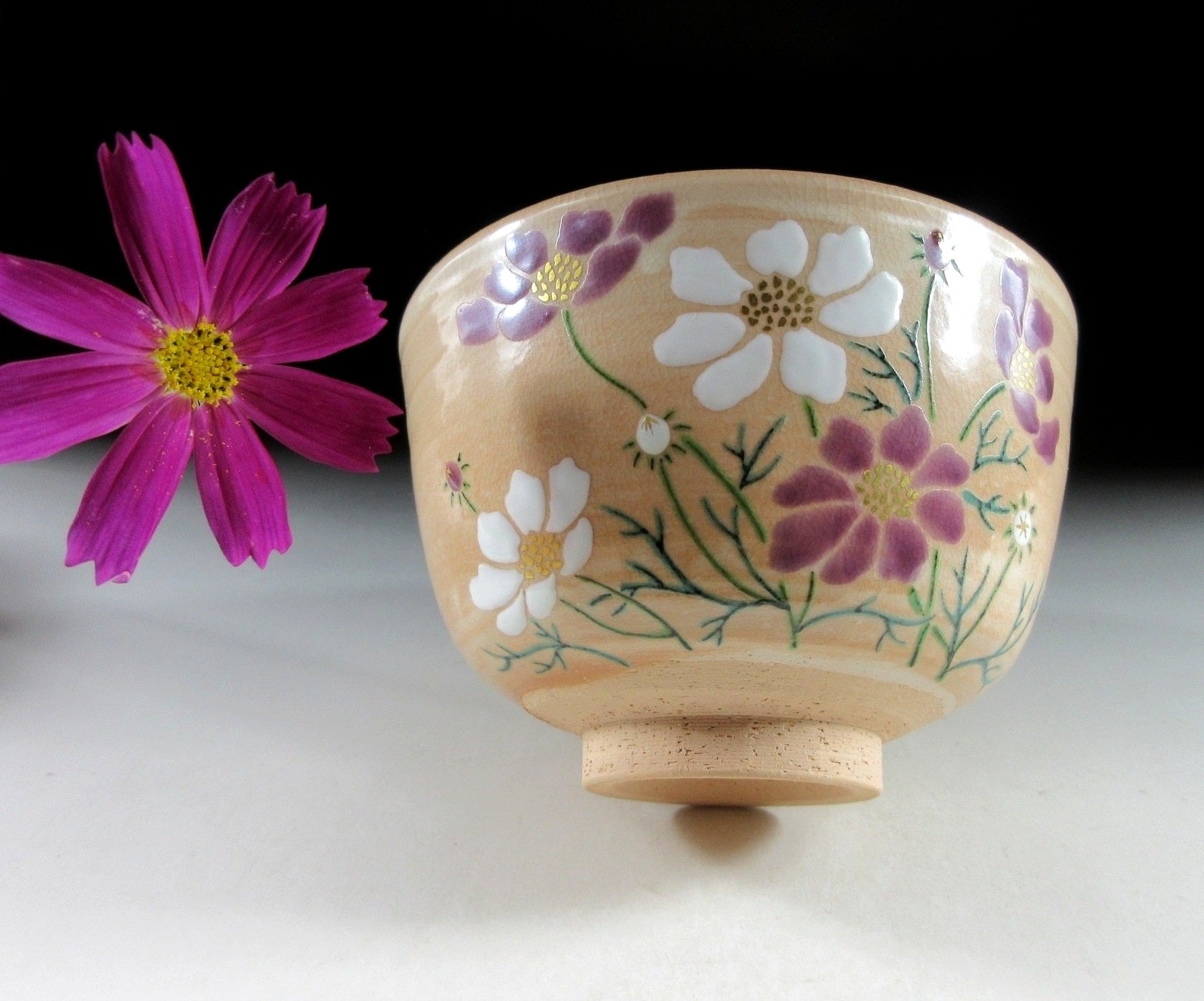 This listing is for a delightful Kyo-ware chawan made around 10-20 years ago by noted potter, Tezuka Toho. It is wheel-thrown and the front and interior is decorated with purple and white cosmos flowers. In Japan cosmos are known as ‘akizakura’, which means ‘autumn cherry blossoms’. This piece is ideal for late summer/early autumn and it has a nice deep shape for whisking. The stamp of the potter can be found on the bottom, and it comes with its original signed wooden storage box.
