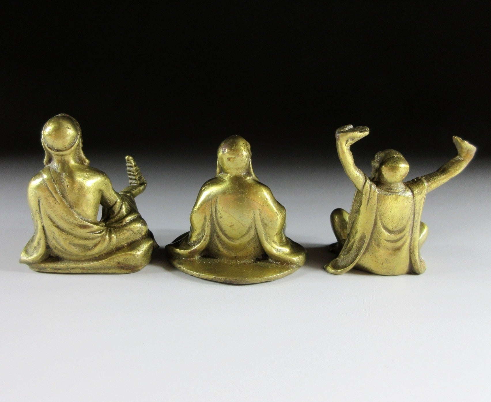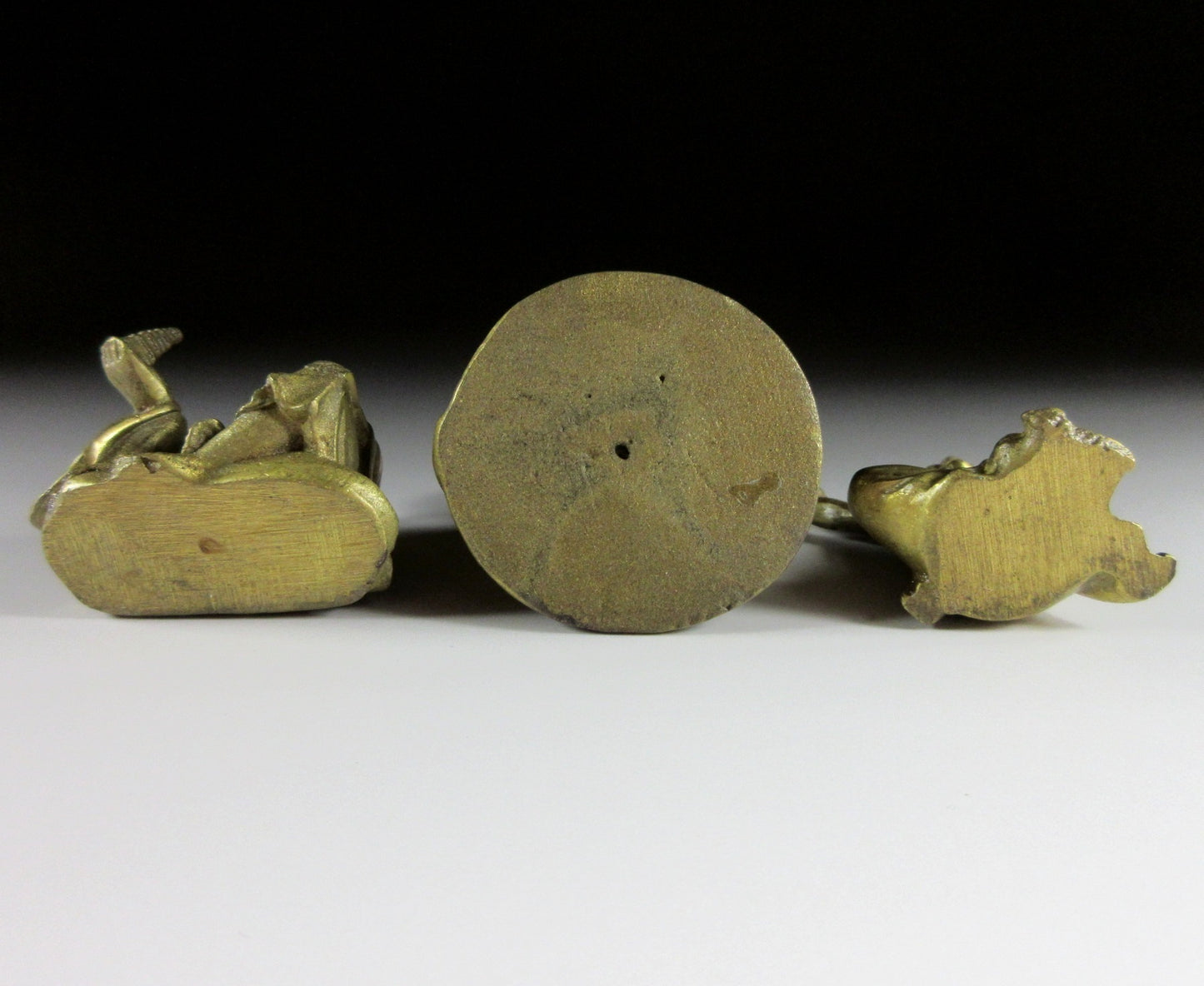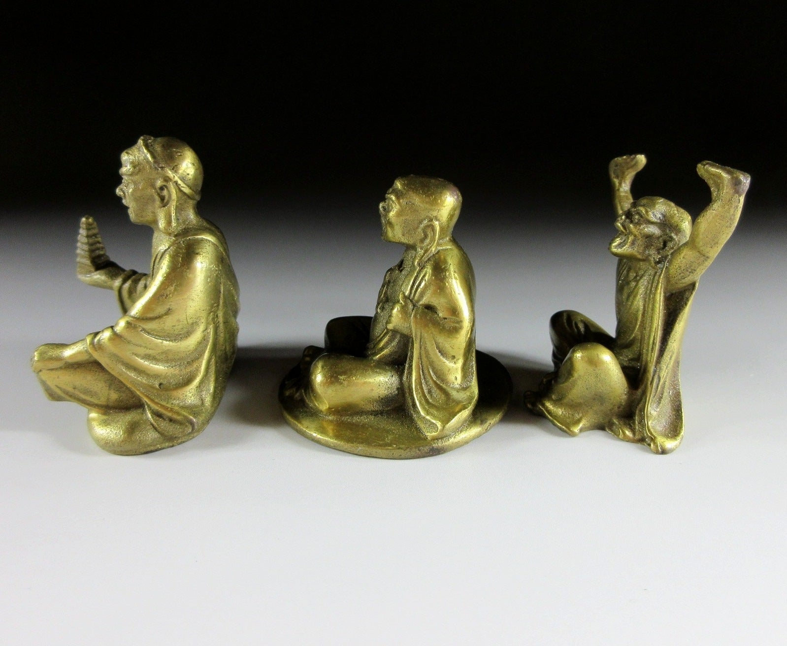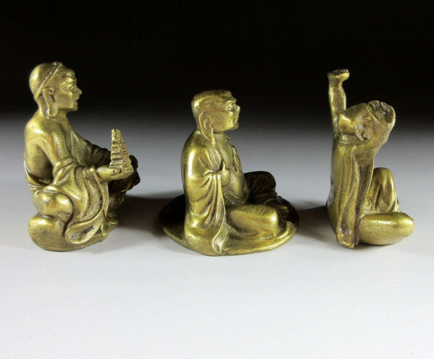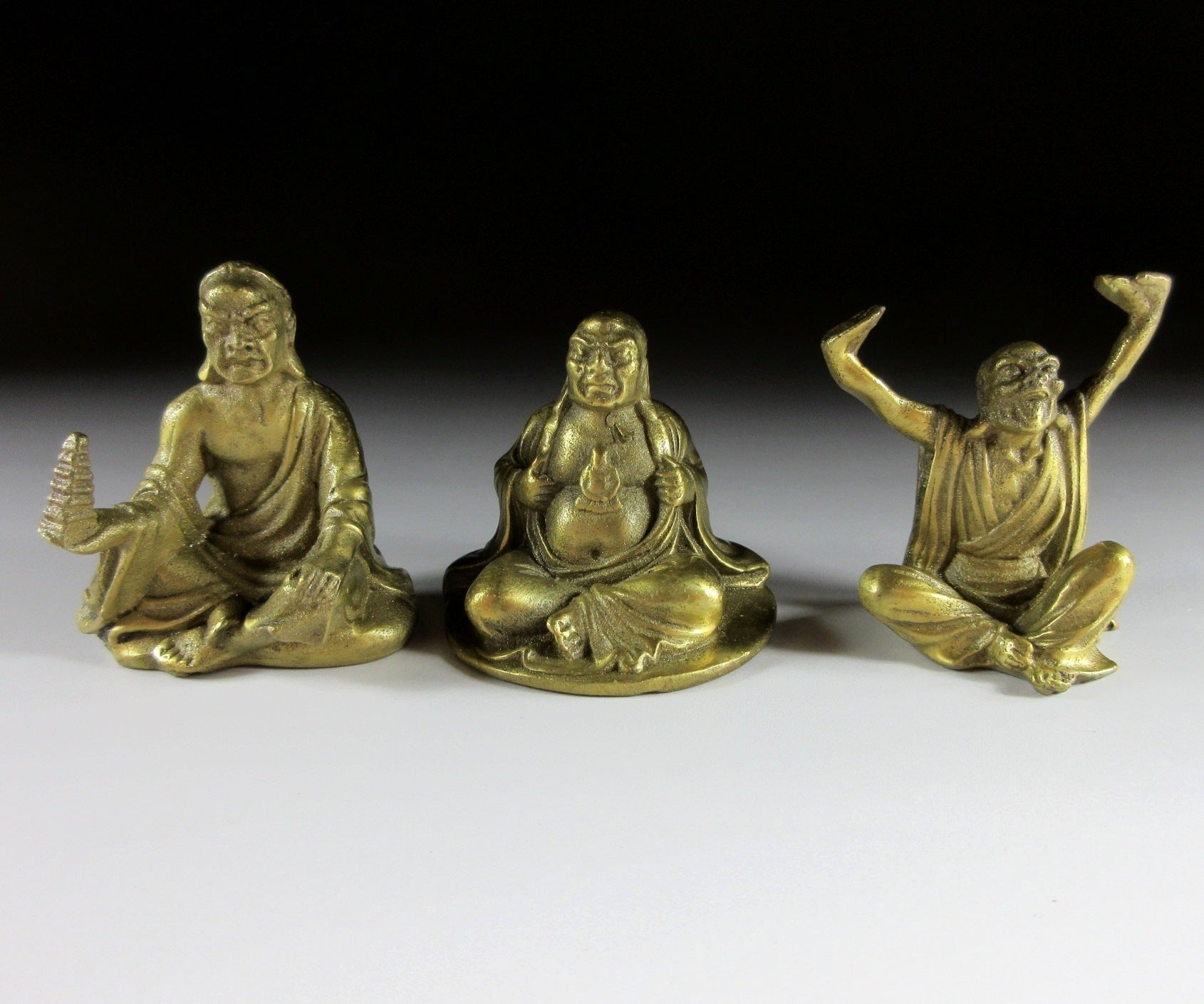 This listing is for three very small bunchin paperweights made around 30-40 years ago. These three characters are enlightened disciples of Buddha known as ‘rakan’ in Japanese. Rakan translates as ‘the worthy’, and they are generally depicted as a group of sixteen or eighteen, however some temples such as Kitain in Kawagoe have groups as large as 500. Each rakan has reached enlightenment, but is yet to attain the higher state of nirvana. The rakan on the left is said to be the last disciple of Buddha. He is depicted carrying a pagoda signifying that Buddha is always here, forever and ever. According to legend, the middle disciple was a prince from a minor kingdom in India. When he was crowned prince, his younger brother was said to have started a rebellion. The prince told his brother that his true desire was to become a monk, and he revealed his chest to prove that there was a Buddha in his heart. His younger brother called off the rebellion, and the prince became a monk. The disciple on the right was another prince from a small kingdom in India. He also became a monk and liked to meditate in the half-lotus style. Upon waking up, he would raise his hands and let out a deep breath. This particular disciple was said to be contented with his own lot and is always depicted as yawning and stretching. This is a fine set of paperweights suitable for calligraphy or just for display.