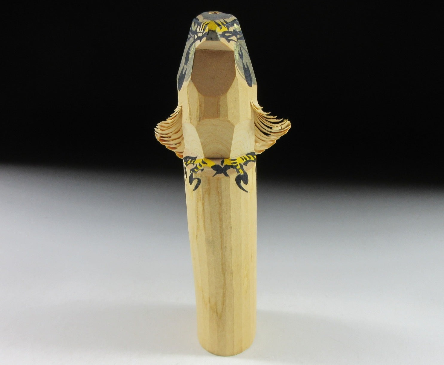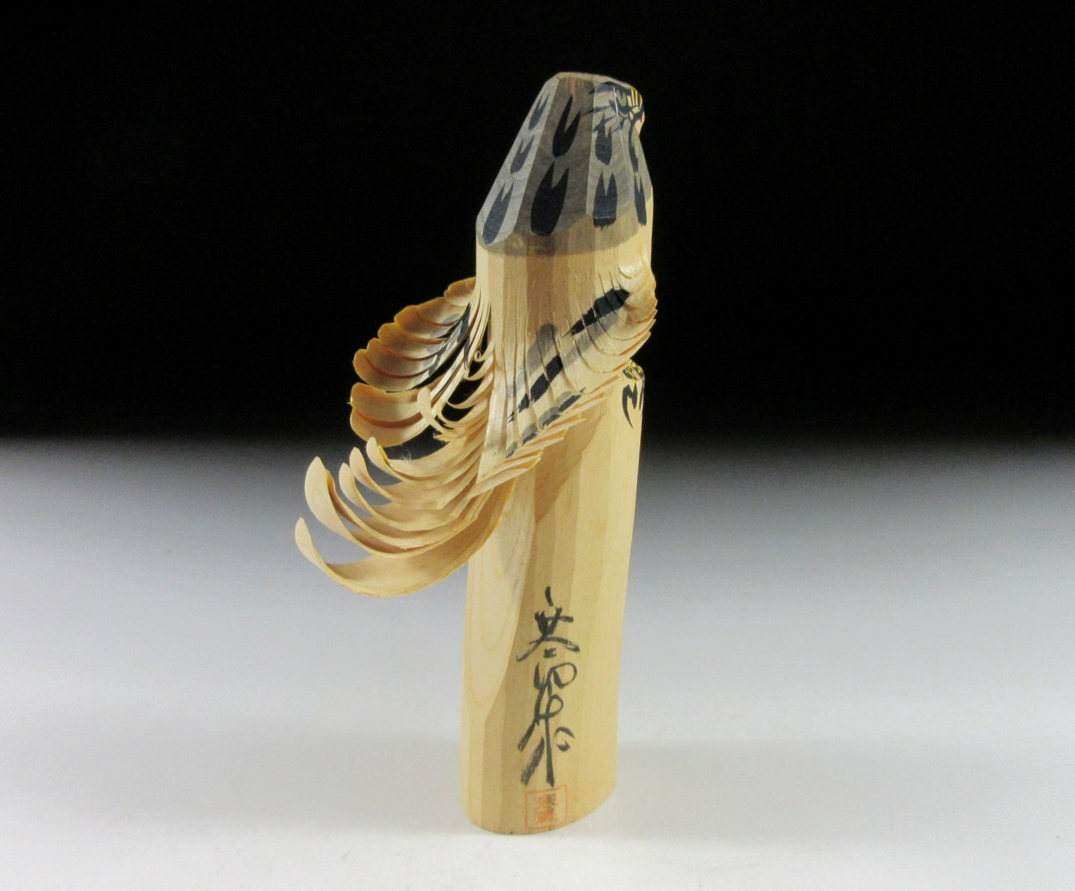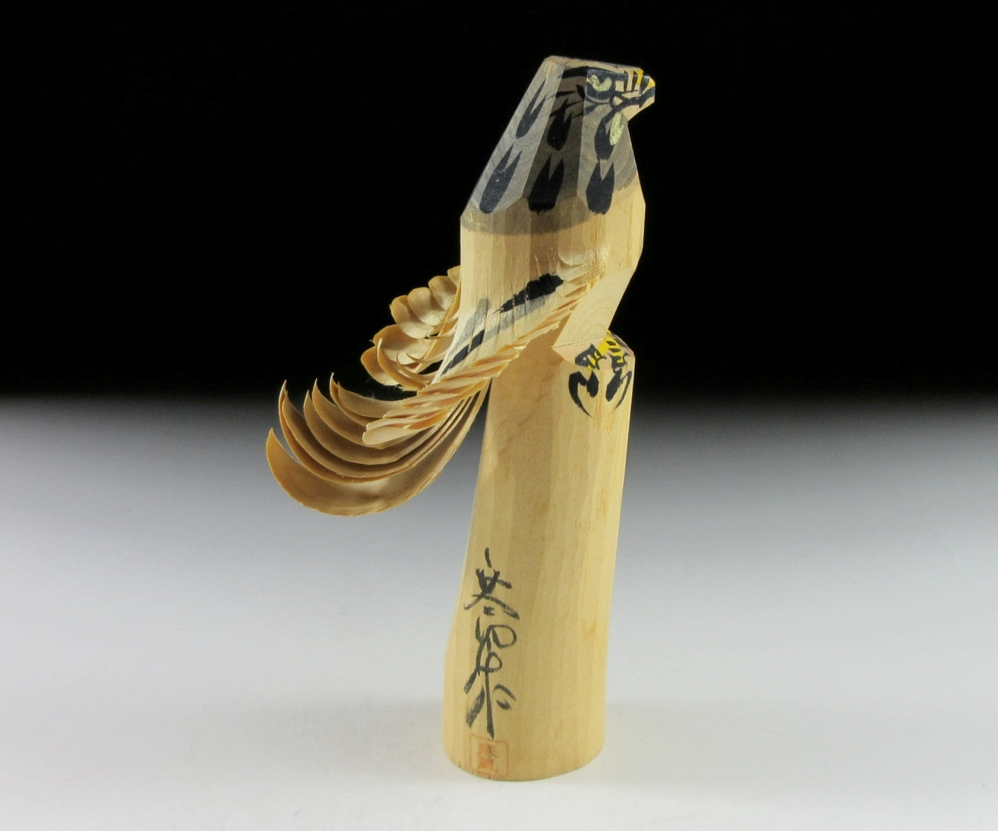 This listing is for a SMALL sasano ittobori ‘otaka poppo’ woodcarving of a hawk made around 20 years ago by Toda Kanpu VI. The word ‘poppo’ comes from the Ainu word for toy, and ‘otaka’, meaning hawk, refers to Uesugi Yozan (1751-1822), a famous daimyo of Yonezawa. It is fashioned from a single piece of wood and is entirely hand-painted. The signature of the craftsperson can be found near the base.