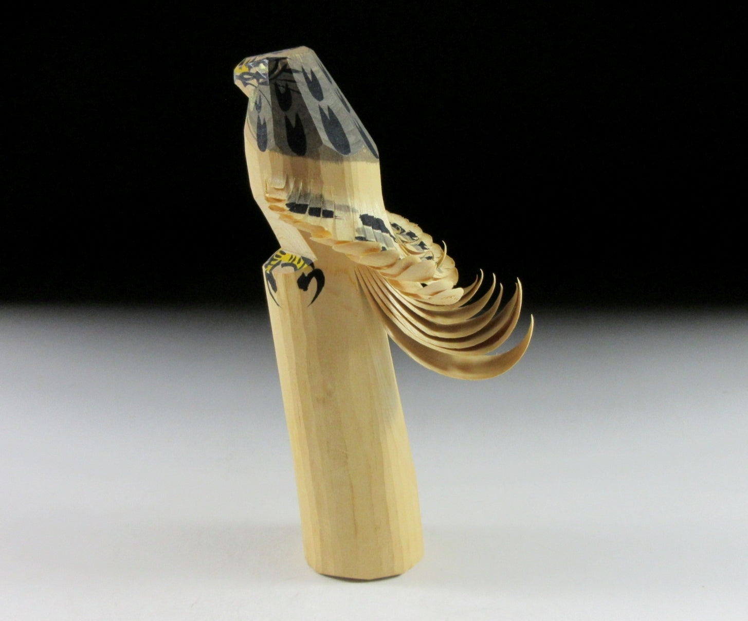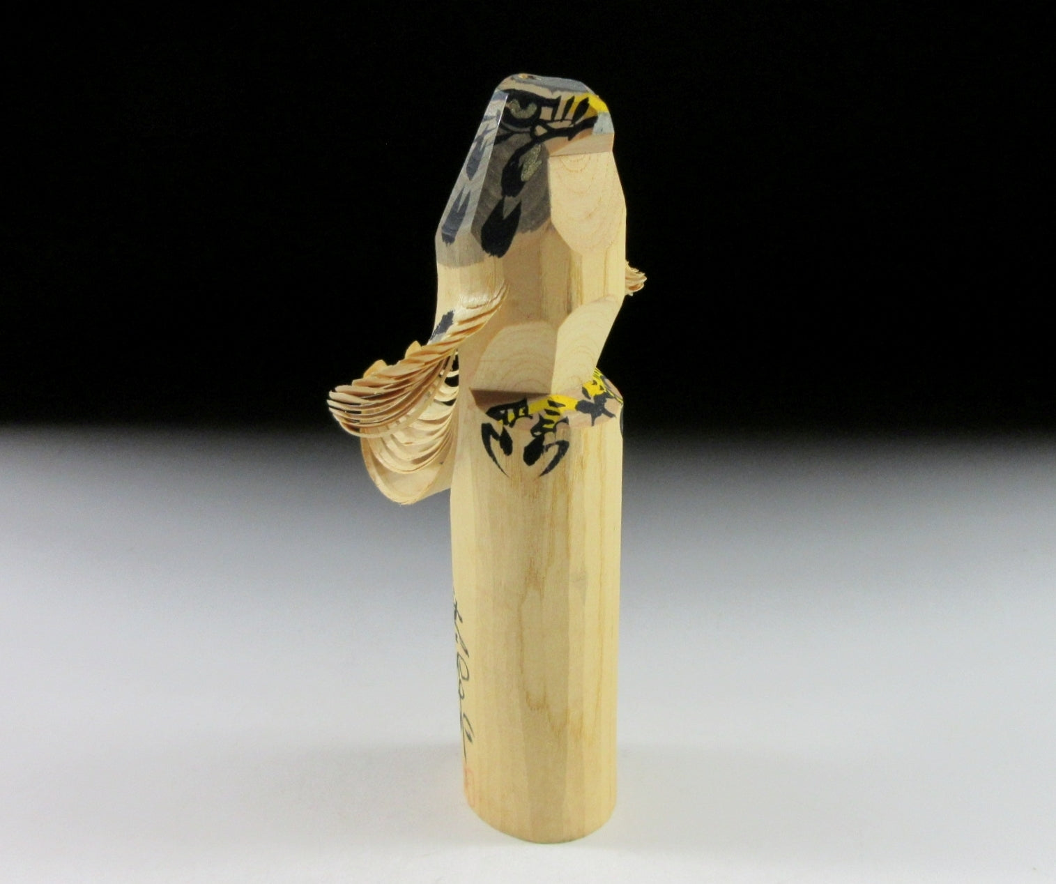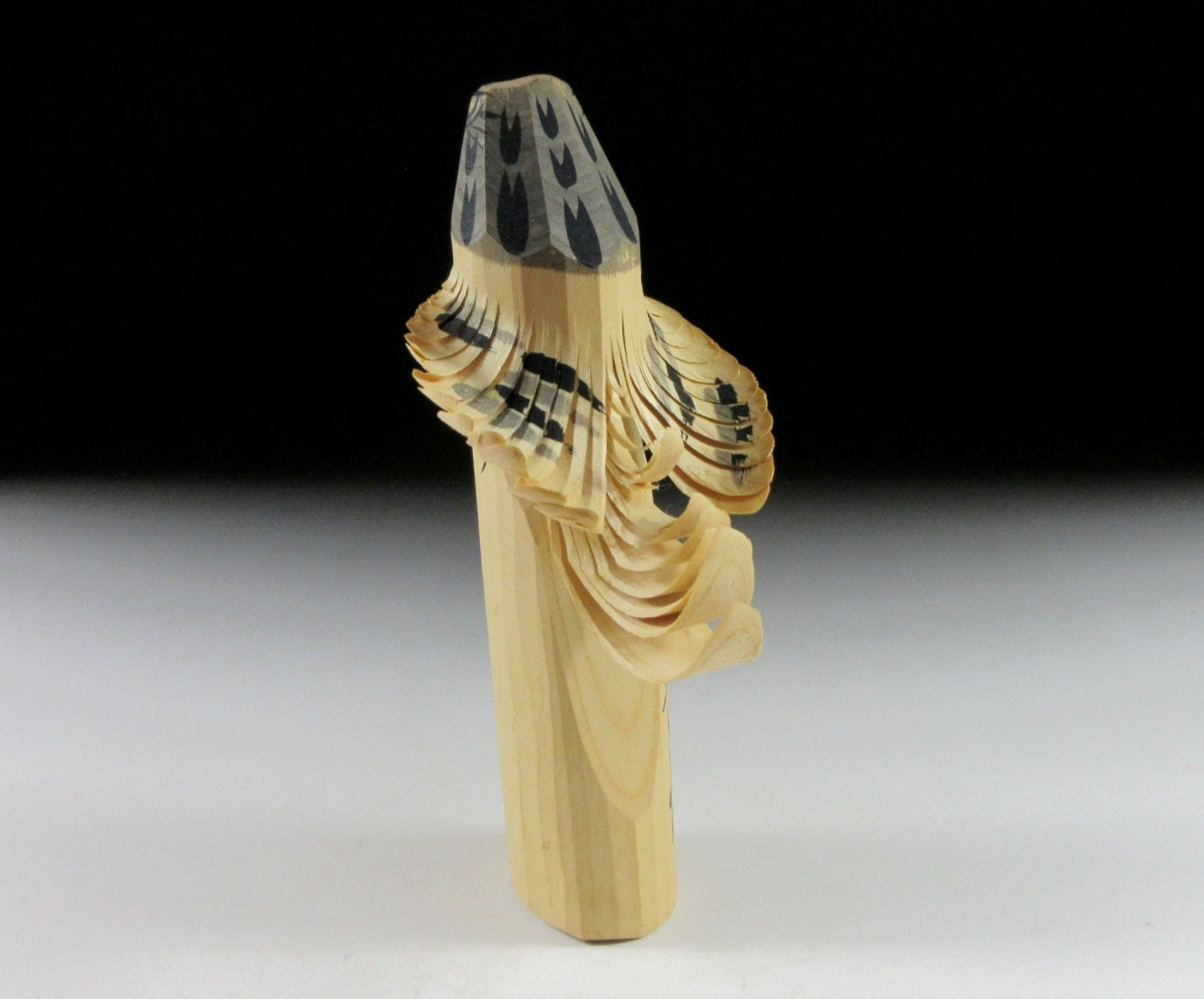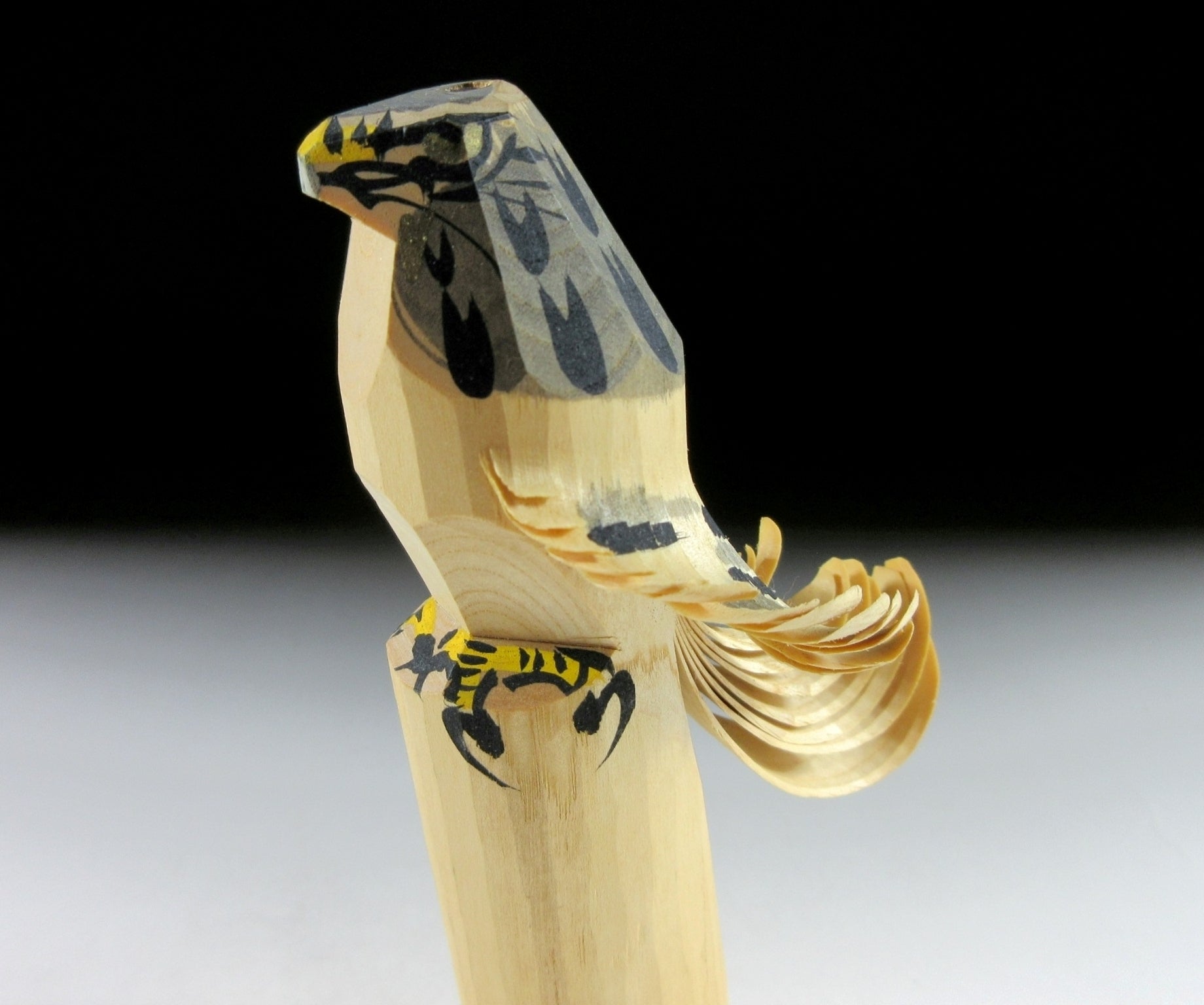 This listing is for a SMALL sasano ittobori ‘otaka poppo’ woodcarving of a hawk made around 20 years ago by Toda Kanpu VI. The word ‘poppo’ comes from the Ainu word for toy, and ‘otaka’, meaning hawk, refers to Uesugi Yozan (1751-1822), a famous daimyo of Yonezawa. It is fashioned from a single piece of wood and is entirely hand-painted. The signature of the craftsperson can be found near the base.