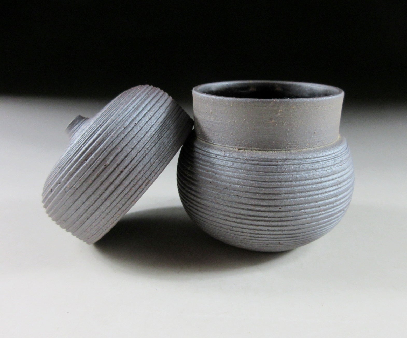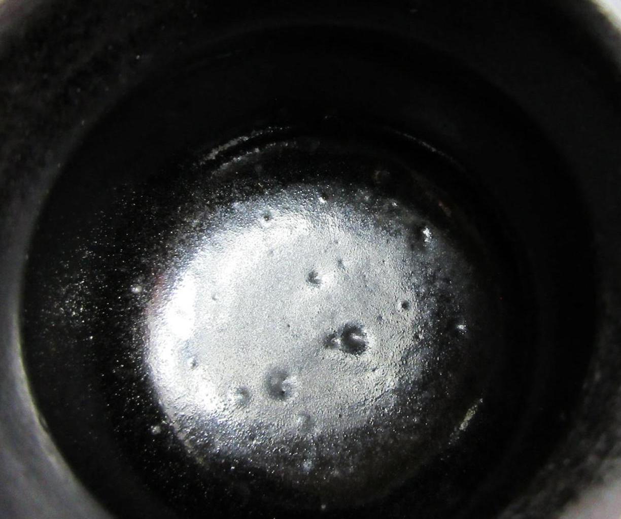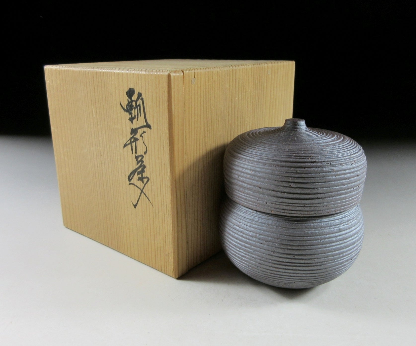 This listing is for an ‘itome sensuji’ Kyo-ware chaire made around 20 years ago for ‘Tokodo’in Tokyo. It is made of high-fired stoneware and features a ’thousand lines’ thread pattern. Both the interior and exterior are coated in iron-based glaze, however the exterior has more of a matte finish. The stamp of the kiln/potter can be found on the bottom, and it comes with its original signed wooden storage box.