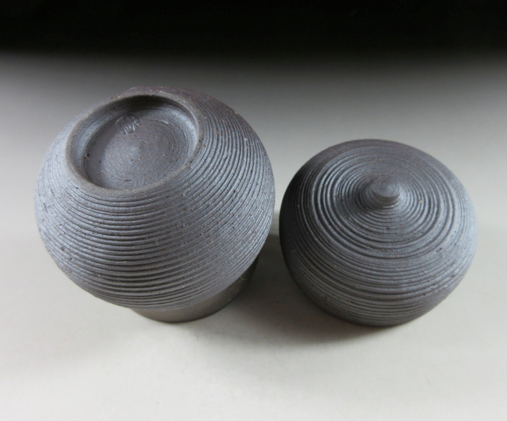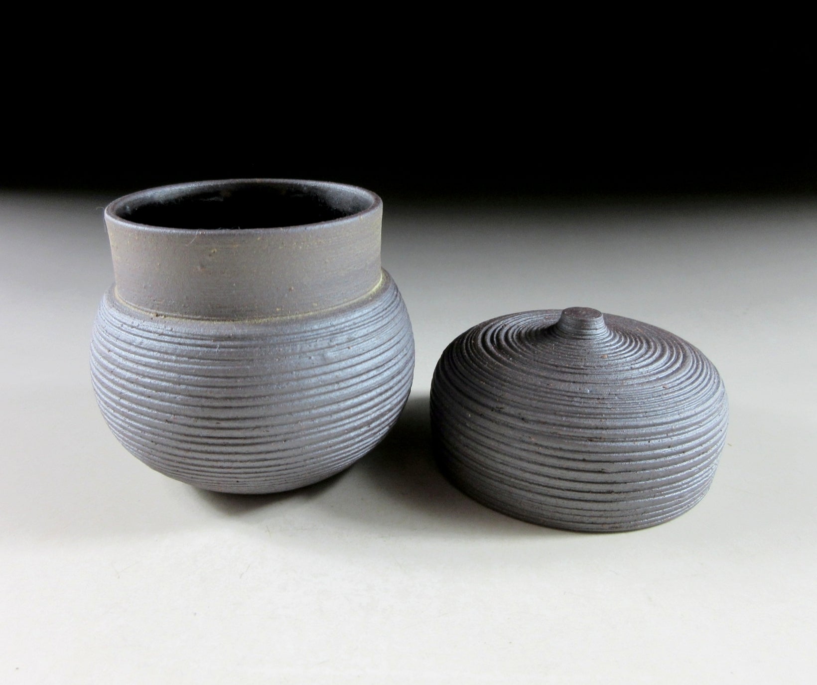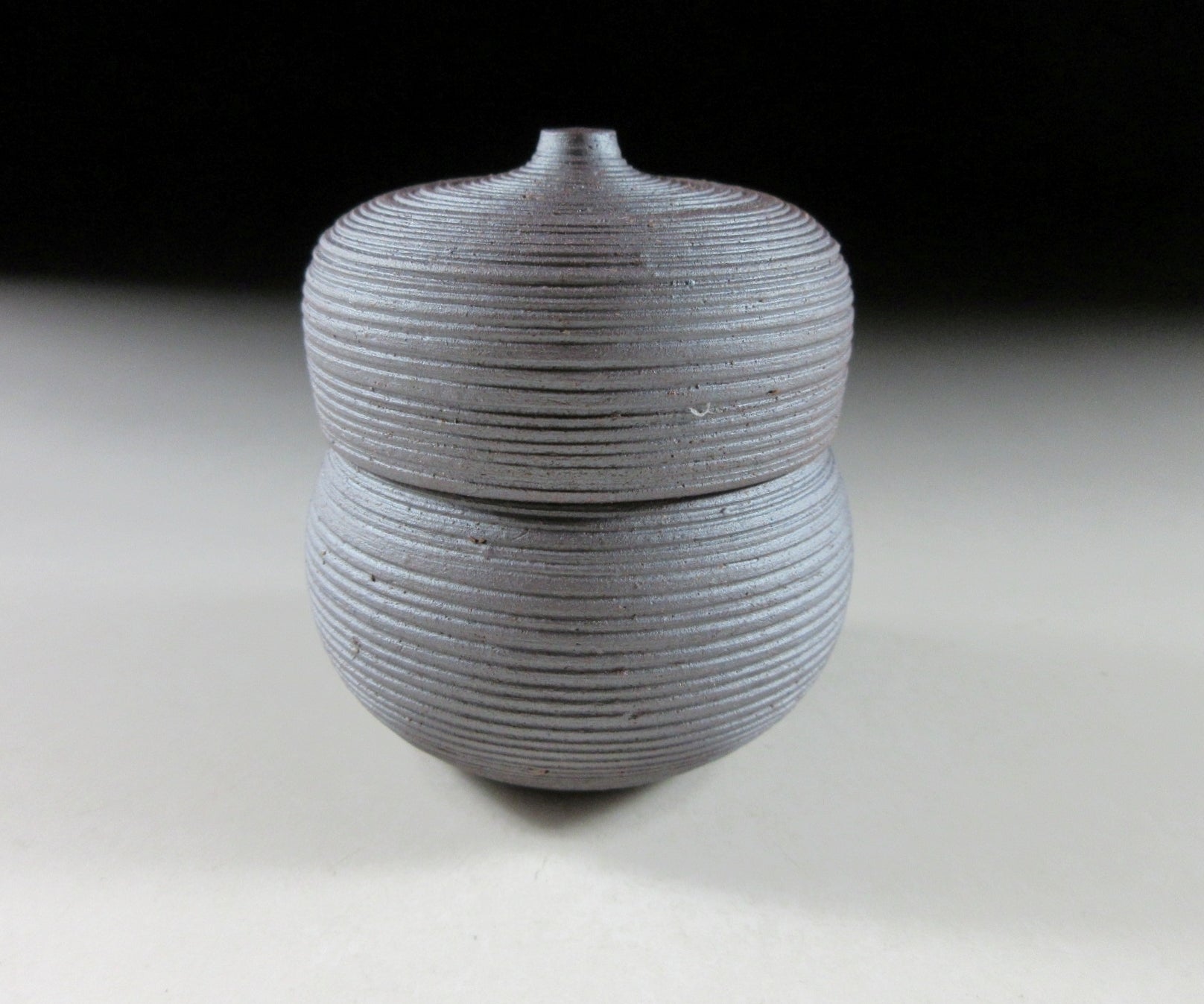 This listing is for an ‘itome sensuji’ Kyo-ware chaire made around 20 years ago for ‘Tokodo’in Tokyo. It is made of high-fired stoneware and features a ’thousand lines’ thread pattern. Both the interior and exterior are coated in iron-based glaze, however the exterior has more of a matte finish. The stamp of the kiln/potter can be found on the bottom, and it comes with its original signed wooden storage box.