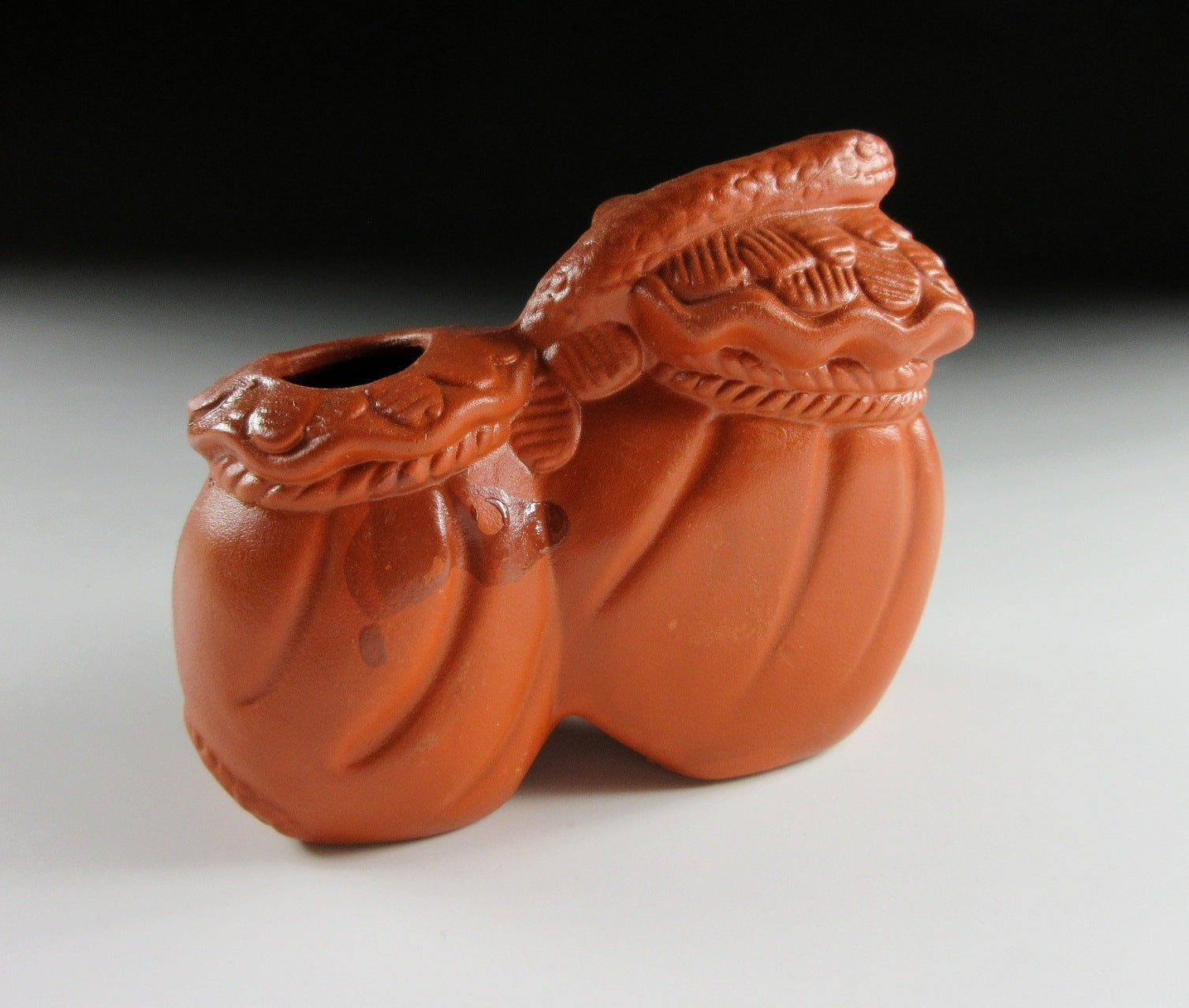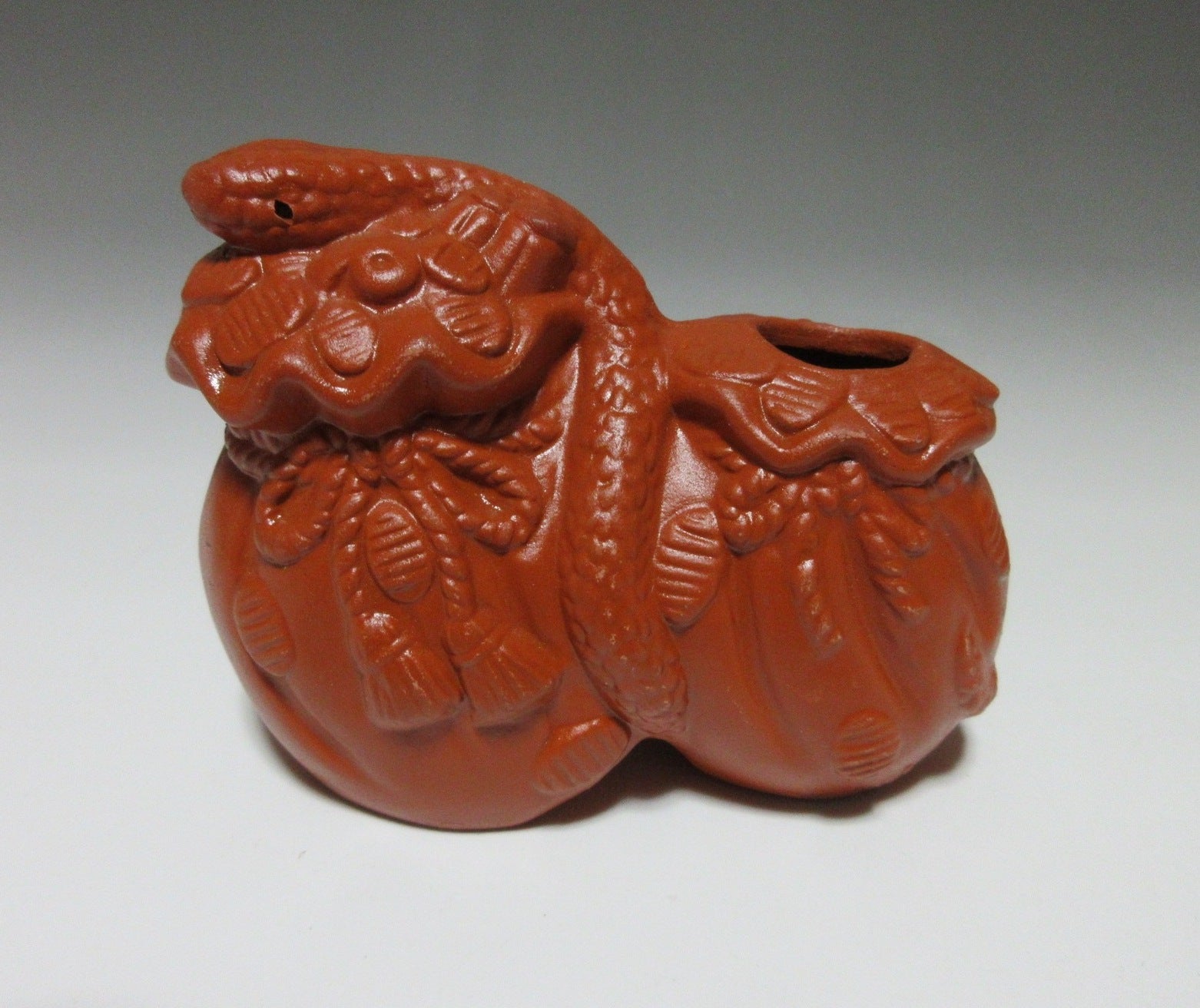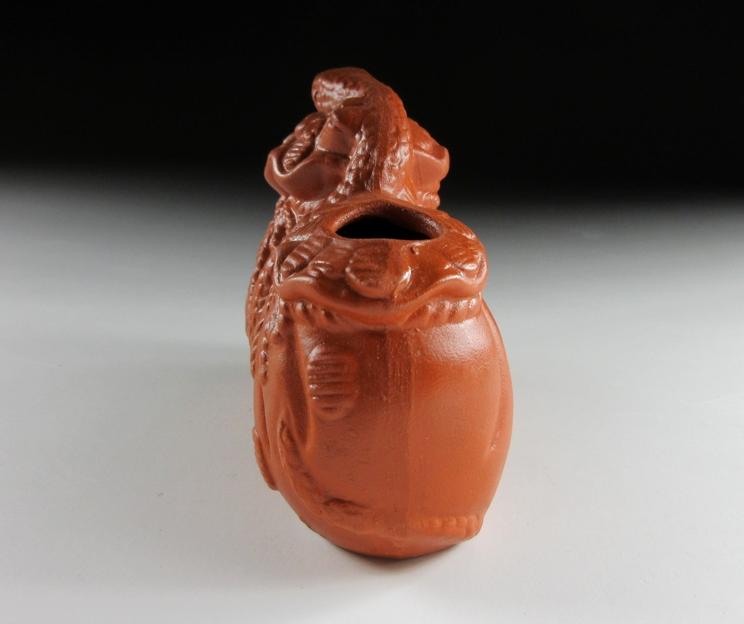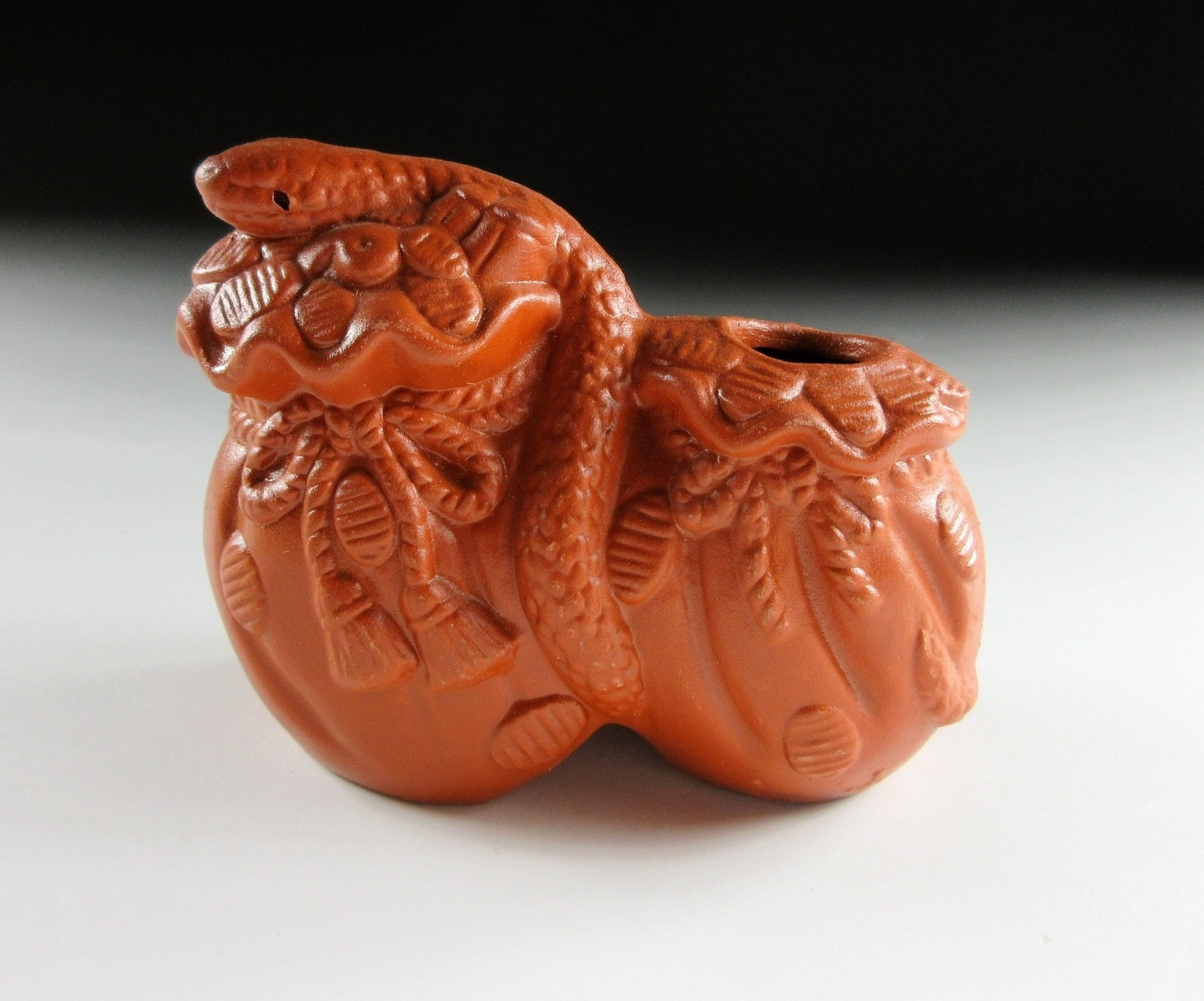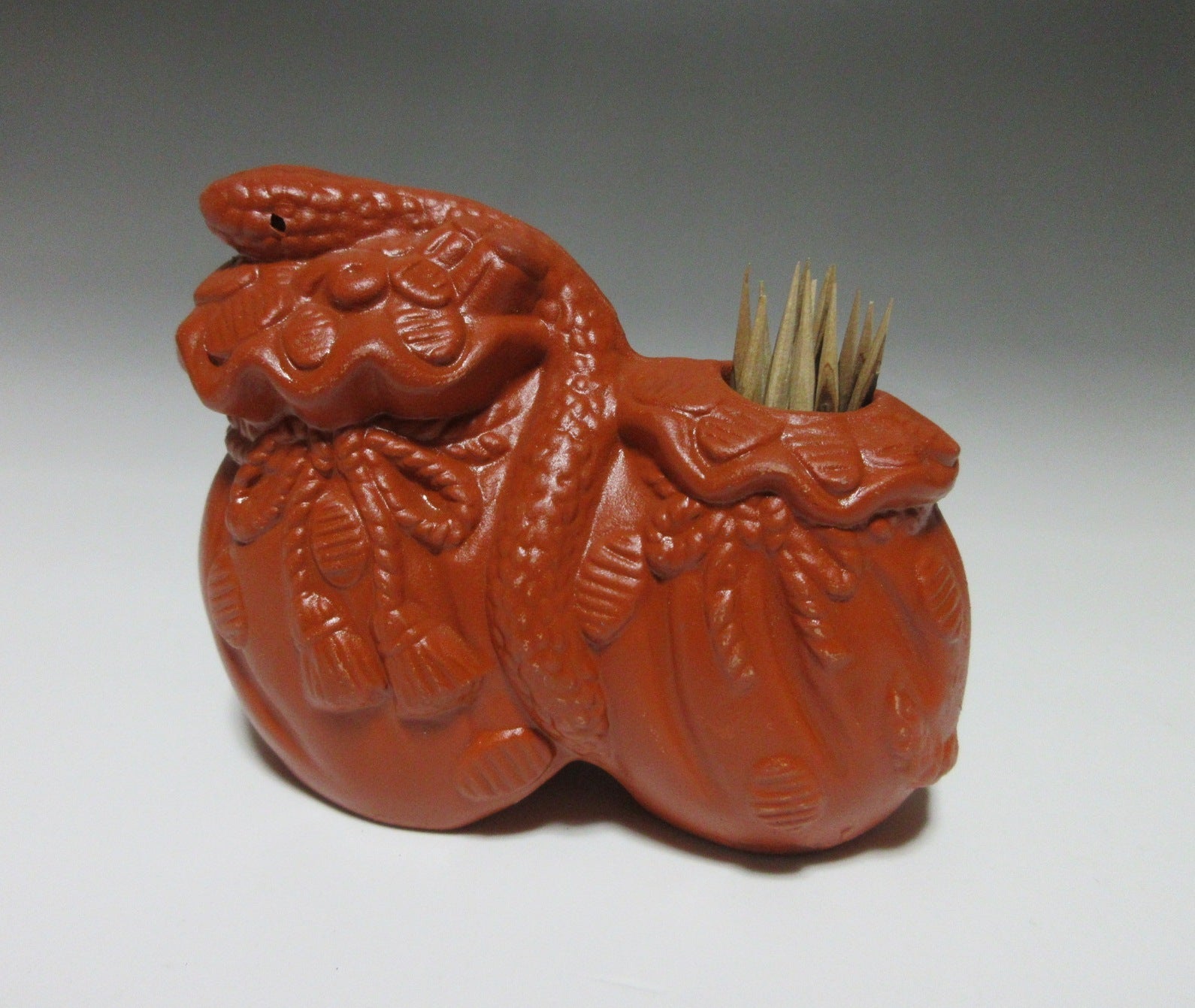 This listing is for a vintage Tokoname-ware toothpick holder possibly made to commemorate the Year of the Snake back in 2001. It has been made using a press mould and coated with red slip. The opening for toothpicks can be found in the money sack closer to the tail of the snake. Toothpick holders are also ideal for growing small air plants.