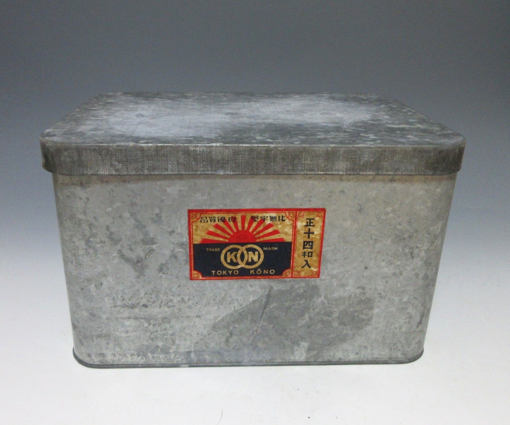 This listing is for a Showa retro tinplate box made around 50-60 years ago by Kono Copper and Steel Co.,Ltd. Kono Copper and Steel is located in Hitachinaka city in Ibaraki Prefecture, and during the Showa period they produced tinplate items branded as Tokyo Kono. This particular item is multi-purpose and would make a great collector’s item. The handles on the side work as they should, and the original Tokyo Kono label is still attached to the front.