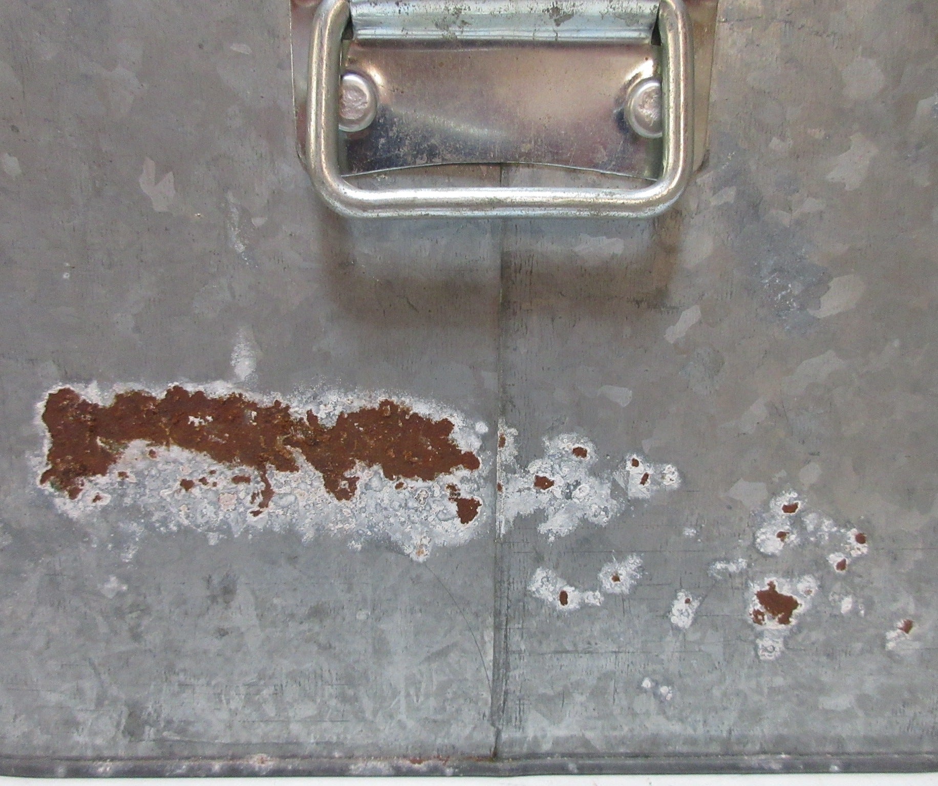 There are very small spots of surface rust on the interior and exterior, one larger patch can be found on the side (pictured). There’s a faint circle mark on the lid, no dents or bent parts.