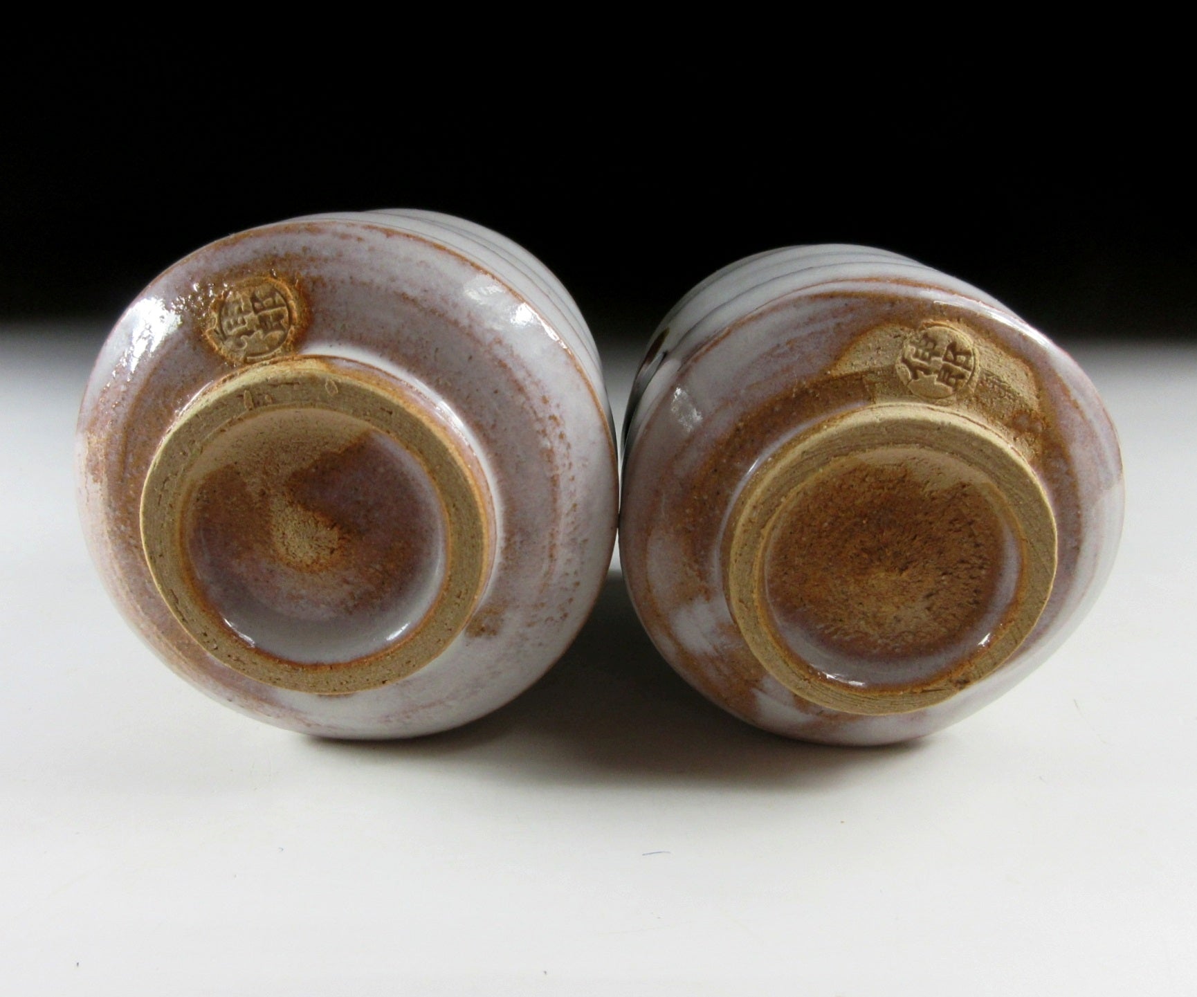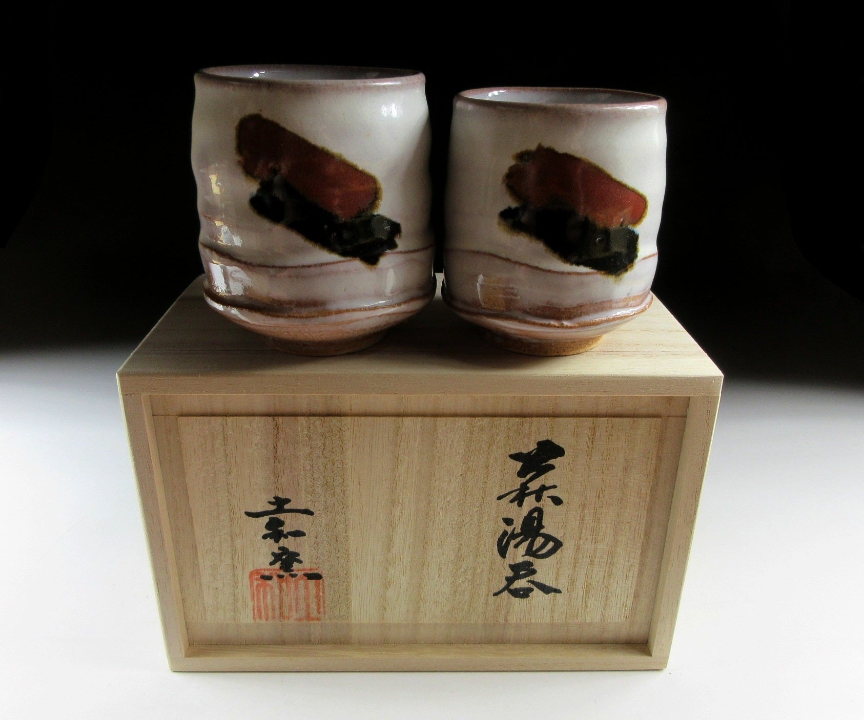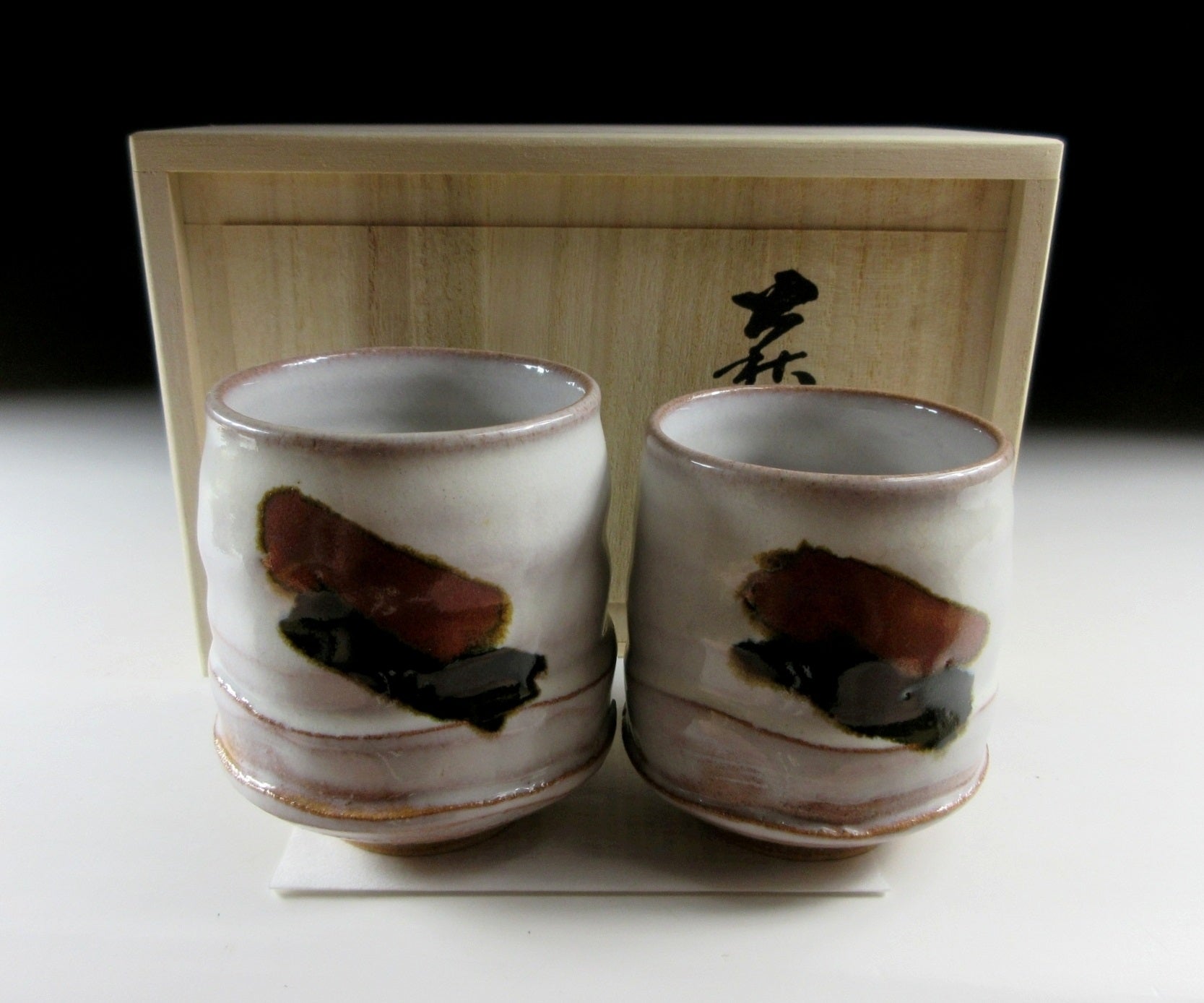 This listing is for a pair of Hagi-ware yunomi style tea cups made by noted potter, Tomehara Nobuo. They are wheel-thrown and coated in white straw ash glaze, and the front features red and black brush markings. The surface consists of horizontal grooves and these cups are what we call meoto style, meaning they are two different sizes and often referred to as a husband and wife pair. The stamp of the potter can be found on the bottom of each cup, and they come with their original signed wooden storage box. They also come with a Japanese language profile about the kiln and potter.