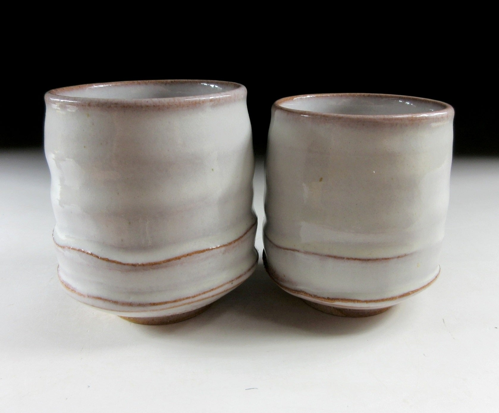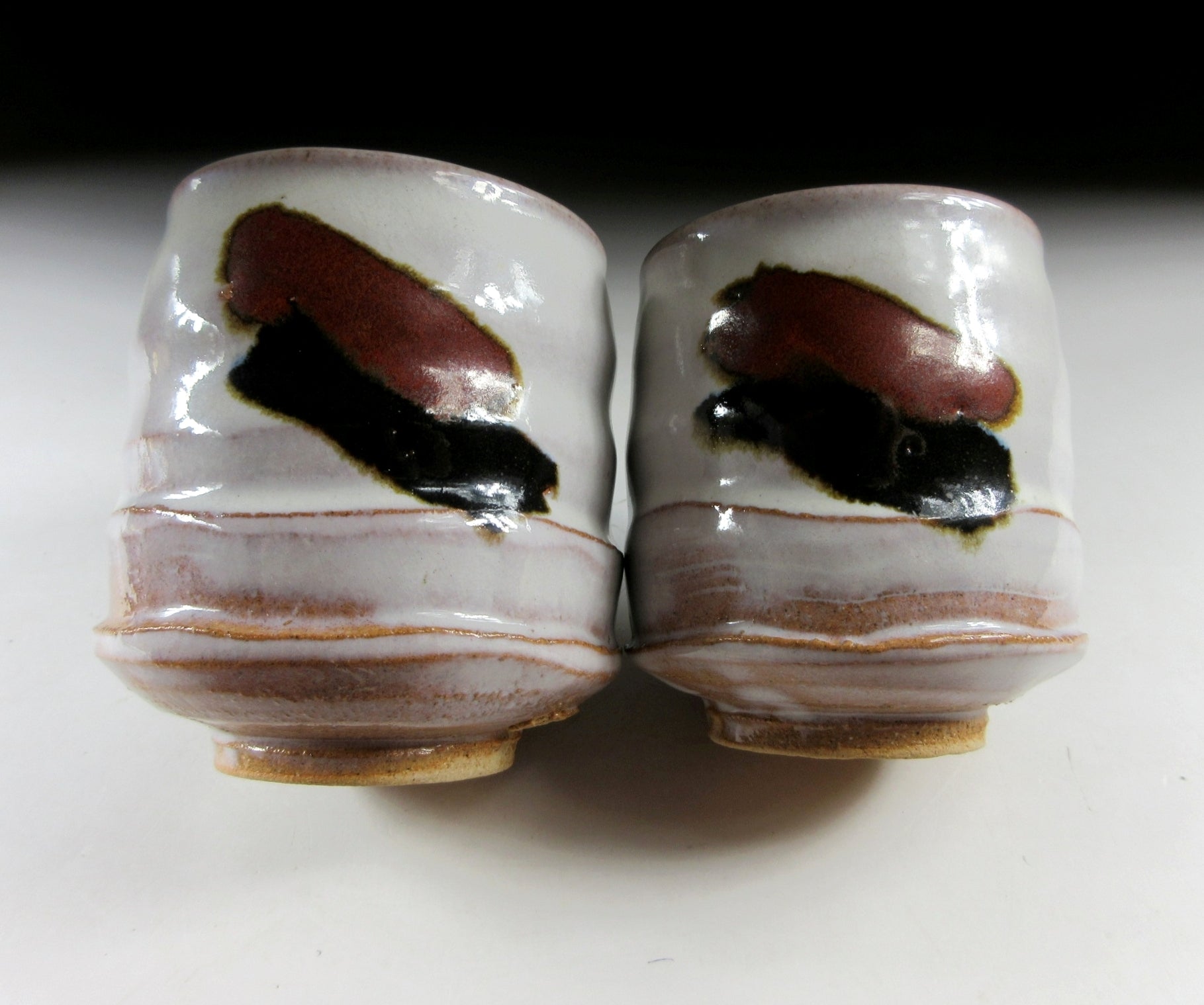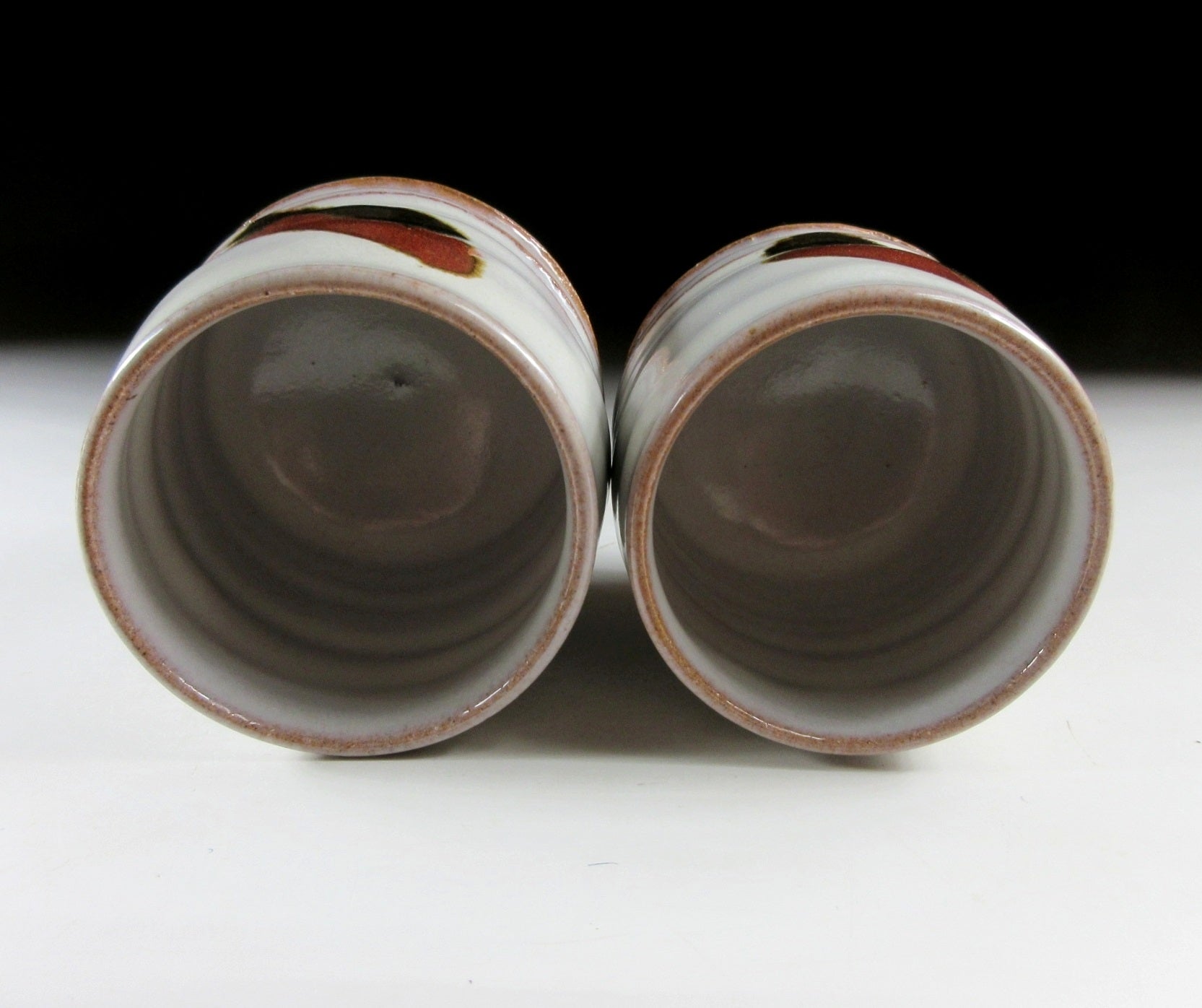 This listing is for a pair of Hagi-ware yunomi style tea cups made by noted potter, Tomehara Nobuo. They are wheel-thrown and coated in white straw ash glaze, and the front features red and black brush markings. The surface consists of horizontal grooves and these cups are what we call meoto style, meaning they are two different sizes and often referred to as a husband and wife pair. The stamp of the potter can be found on the bottom of each cup, and they come with their original signed wooden storage box. They also come with a Japanese language profile about the kiln and potter.