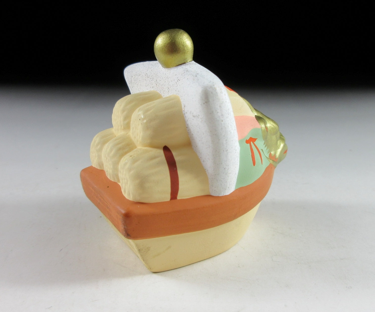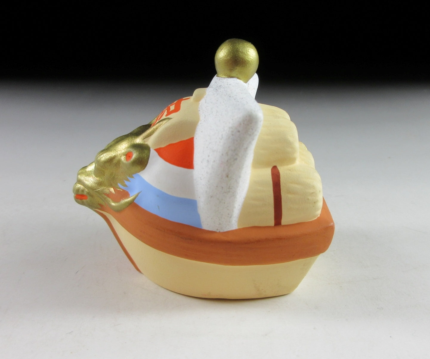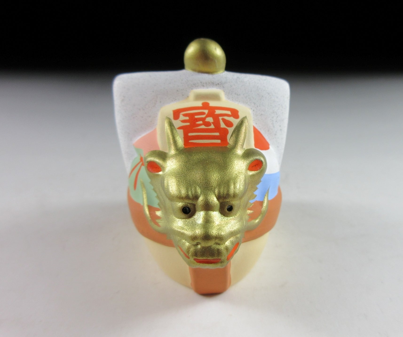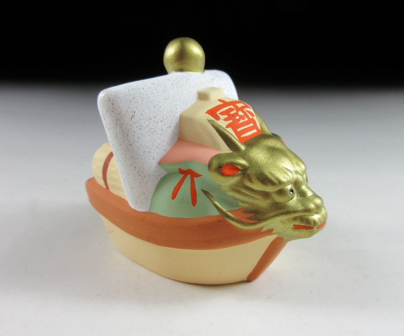 This listing is for a small Kyo-ware bell made around 12 years ago by Tosai in Kyoto. It is made of low fired stoneware and moulded to resemble a dragon ‘takarabune’ treasure ship with a load of rice bales. Takarabune are amulets for good fortune at New Year. It is said that the seven gods of fortune make port on New Year’s Eve to spread good fortune and happiness to everyone. Children should place a picture of the gods aboard their ship under their pillow, and if they have a lucky dream they will be lucky for the whole year. If their dream is bad, they should release the picture in a river so the ill fortune goes back out to sea. The piece was most likely made to commemorate the Year of the Dragon back in 2012. The stamp of the kiln can be found on the bottom, and for those curious, the kanji on the front reads as ‘treasure’.
