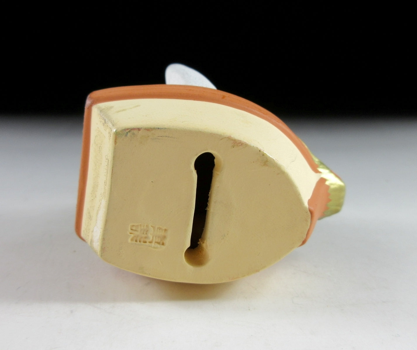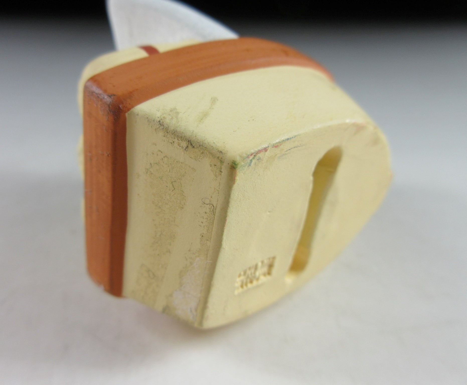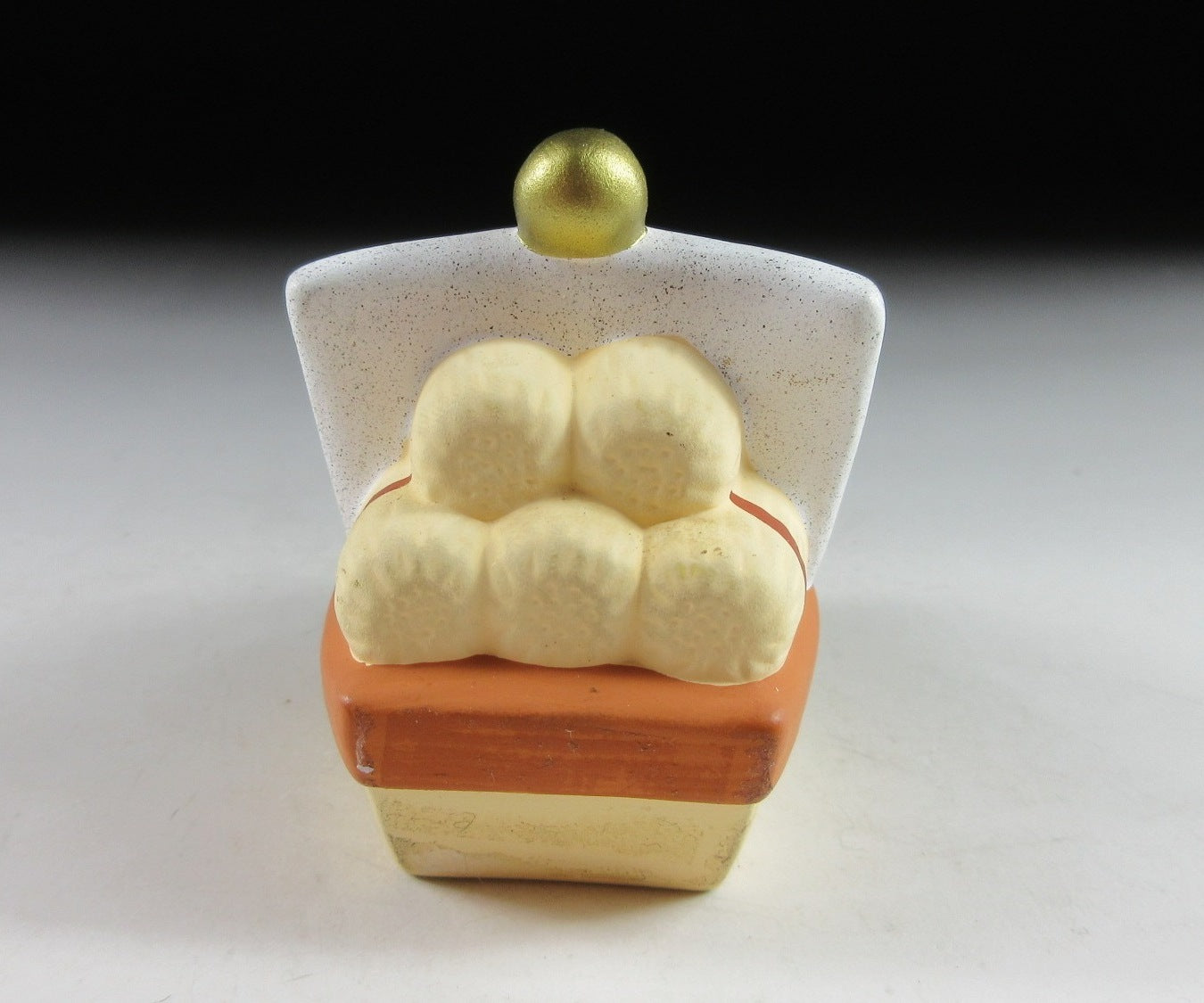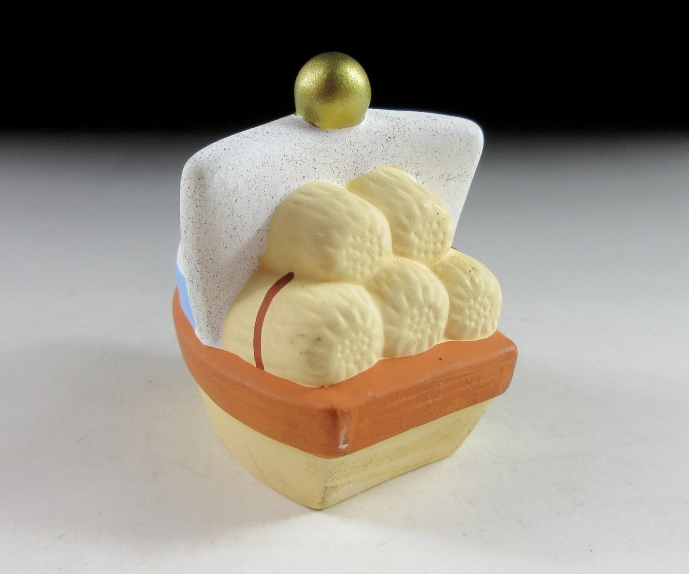 This listing is for a small Kyo-ware bell made around 12 years ago by Tosai in Kyoto. It is made of low fired stoneware and moulded to resemble a dragon ‘takarabune’ treasure ship with a load of rice bales. Takarabune are amulets for good fortune at New Year. It is said that the seven gods of fortune make port on New Year’s Eve to spread good fortune and happiness to everyone. Children should place a picture of the gods aboard their ship under their pillow, and if they have a lucky dream they will be lucky for the whole year. If their dream is bad, they should release the picture in a river so the ill fortune goes back out to sea. The piece was most likely made to commemorate the Year of the Dragon back in 2012. The stamp of the kiln can be found on the bottom, and for those curious, the kanji on the front reads as ‘treasure’.