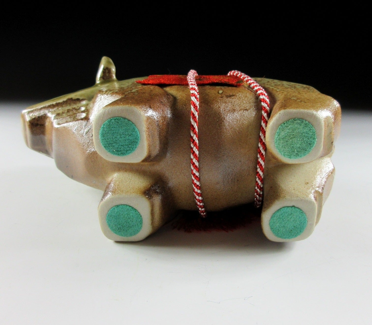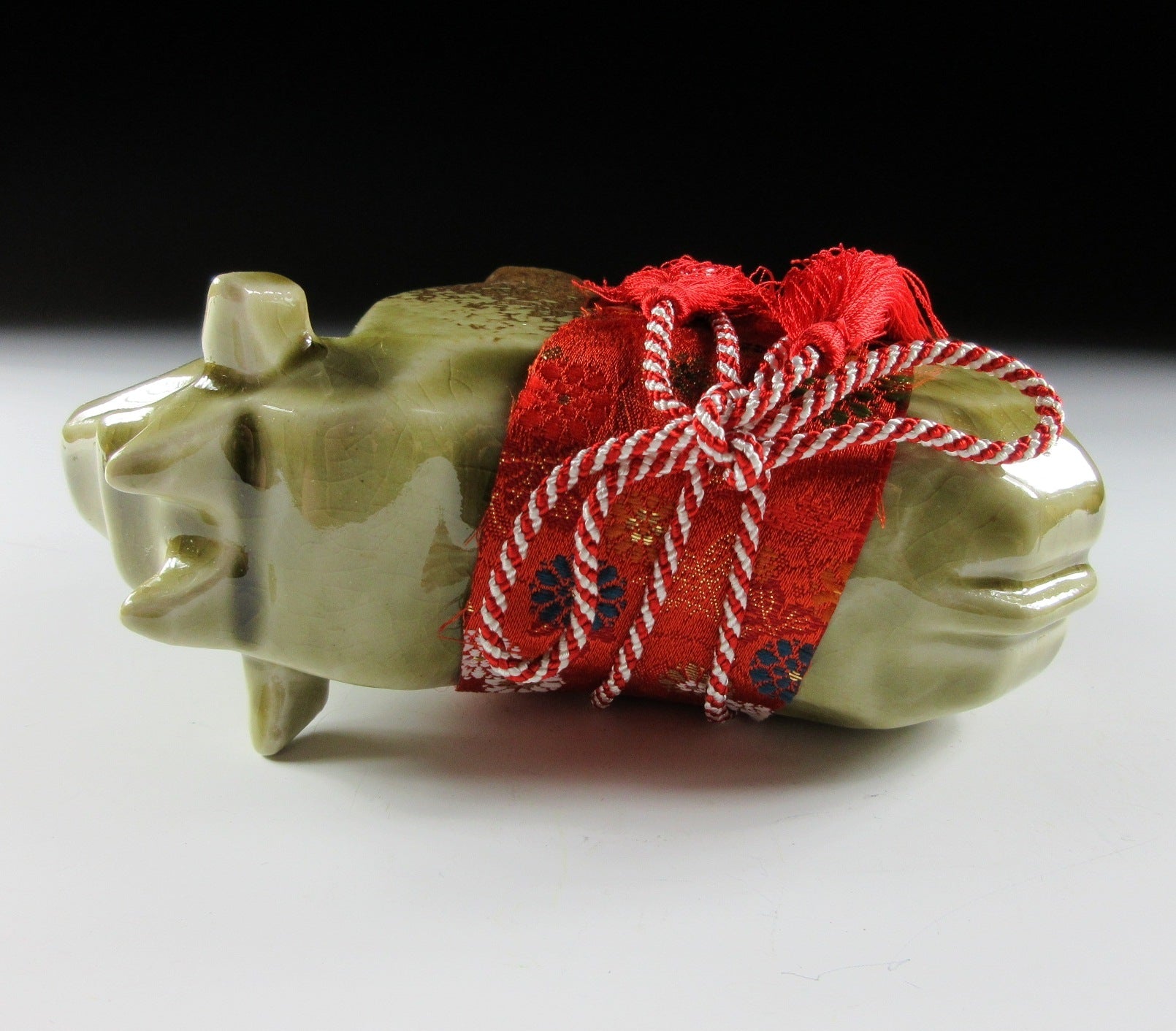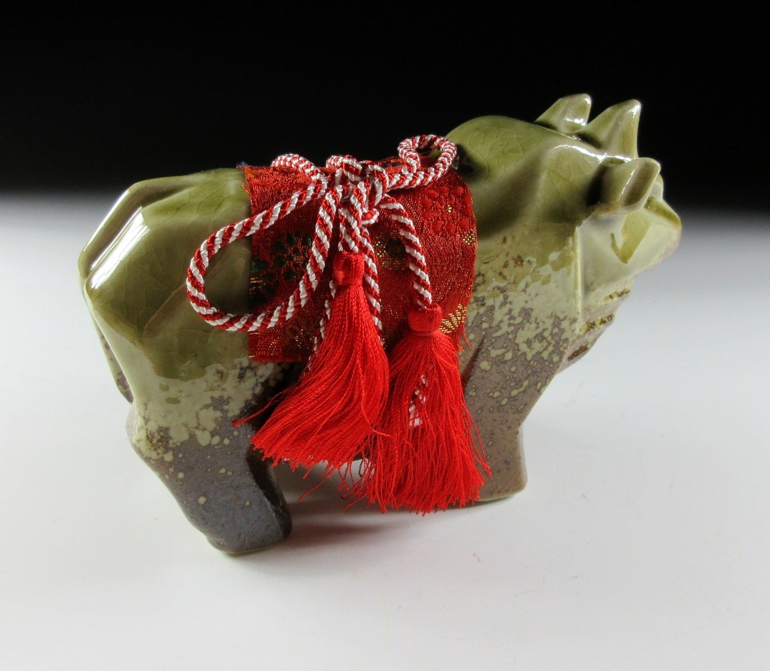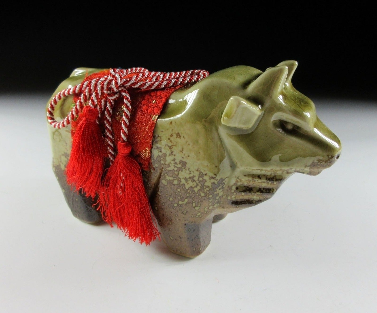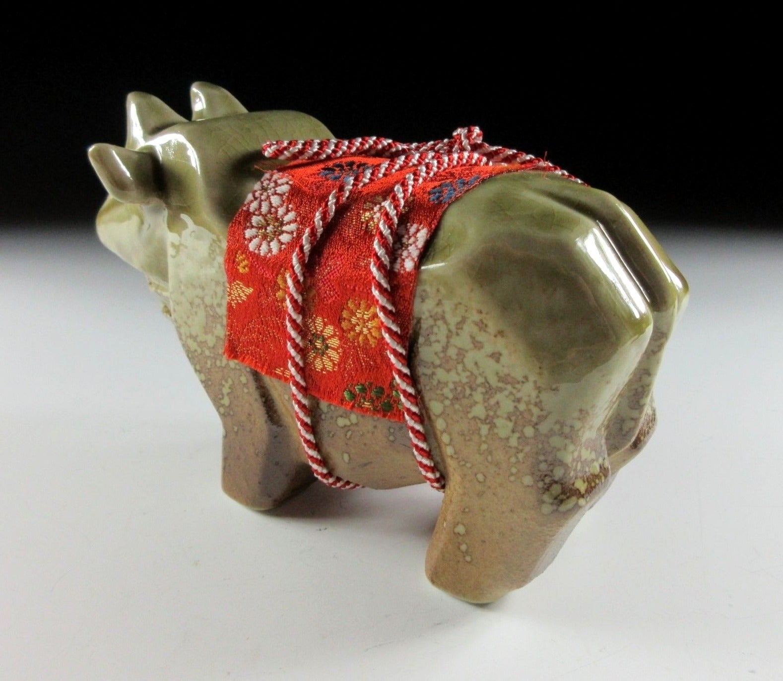 This listing is for a Shigaraki-ware ox okimono made around 20-30 years ago by Tousen Gama. It is made from a mould and was most likely fired in a gas or electric kiln. Its angular shape gives this piece a bulky and strong appearance, and the ox has a red fabric saddle secured by a red and white tassel. Red and white are used for decorations at events like weddings and New Year, and they convey happiness and joy. Please note that this okimono is not wood fired, it was made at a production kiln. It comes with its original paper box, and it also comes with a black plastic display board (not pictured).