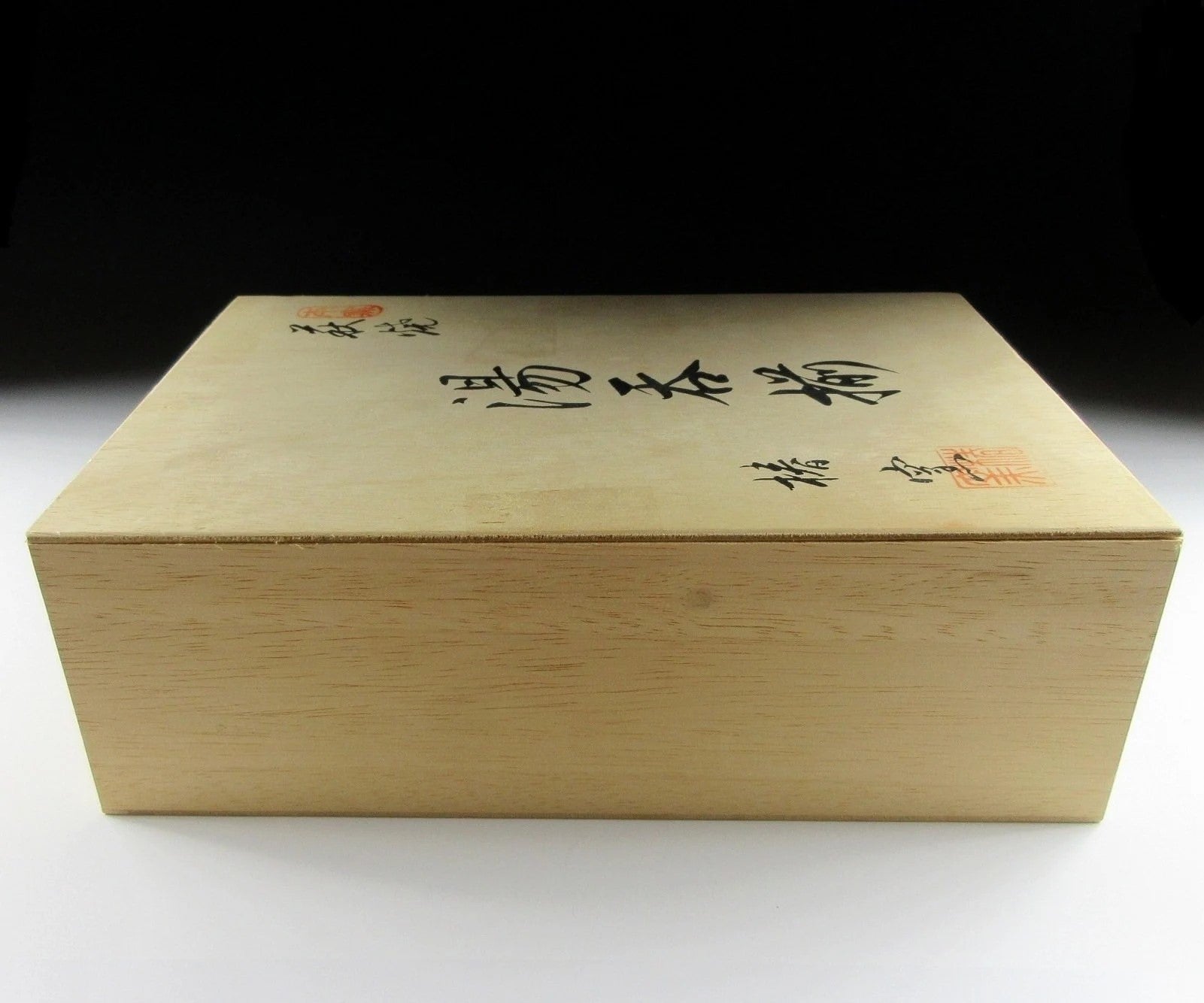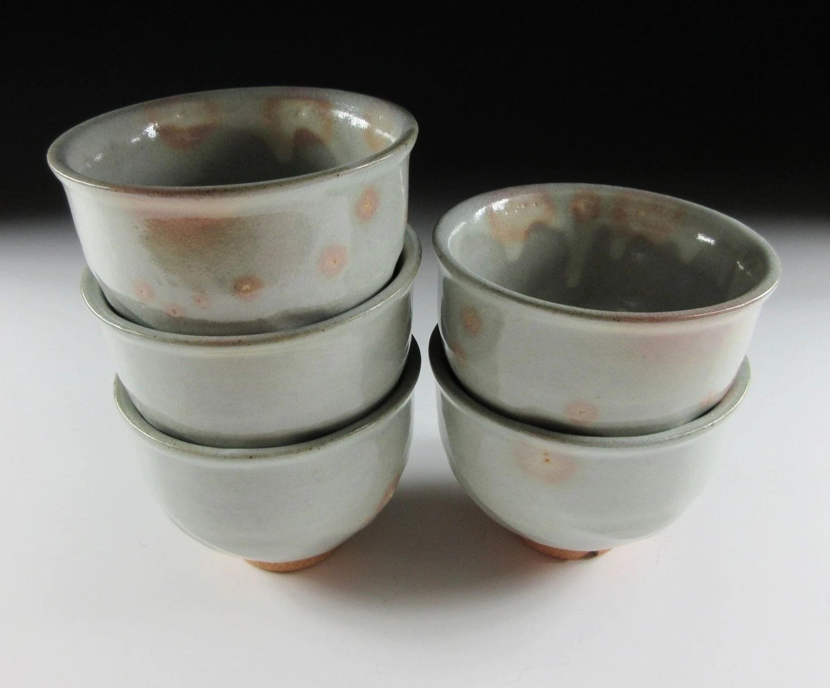This listing is for a set of five Hagi-ware tea cups made around 10 years ago by Tsubaki Gama. They are wheel-thrown and feature gohonte markings. Gohonte refers to the pale spots that appear on the pottery due to the natural reactions from the iron found in the clay when being fired in the kiln. The effect is beautiful and quite unusual, and the colour will change over time. The mark of the kiln can be found on the bottom of each cup, and they come with their original signed wooden storage box.