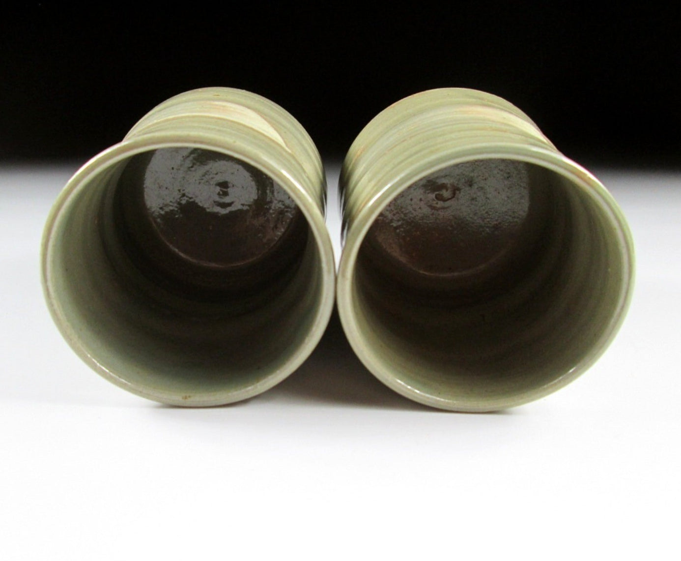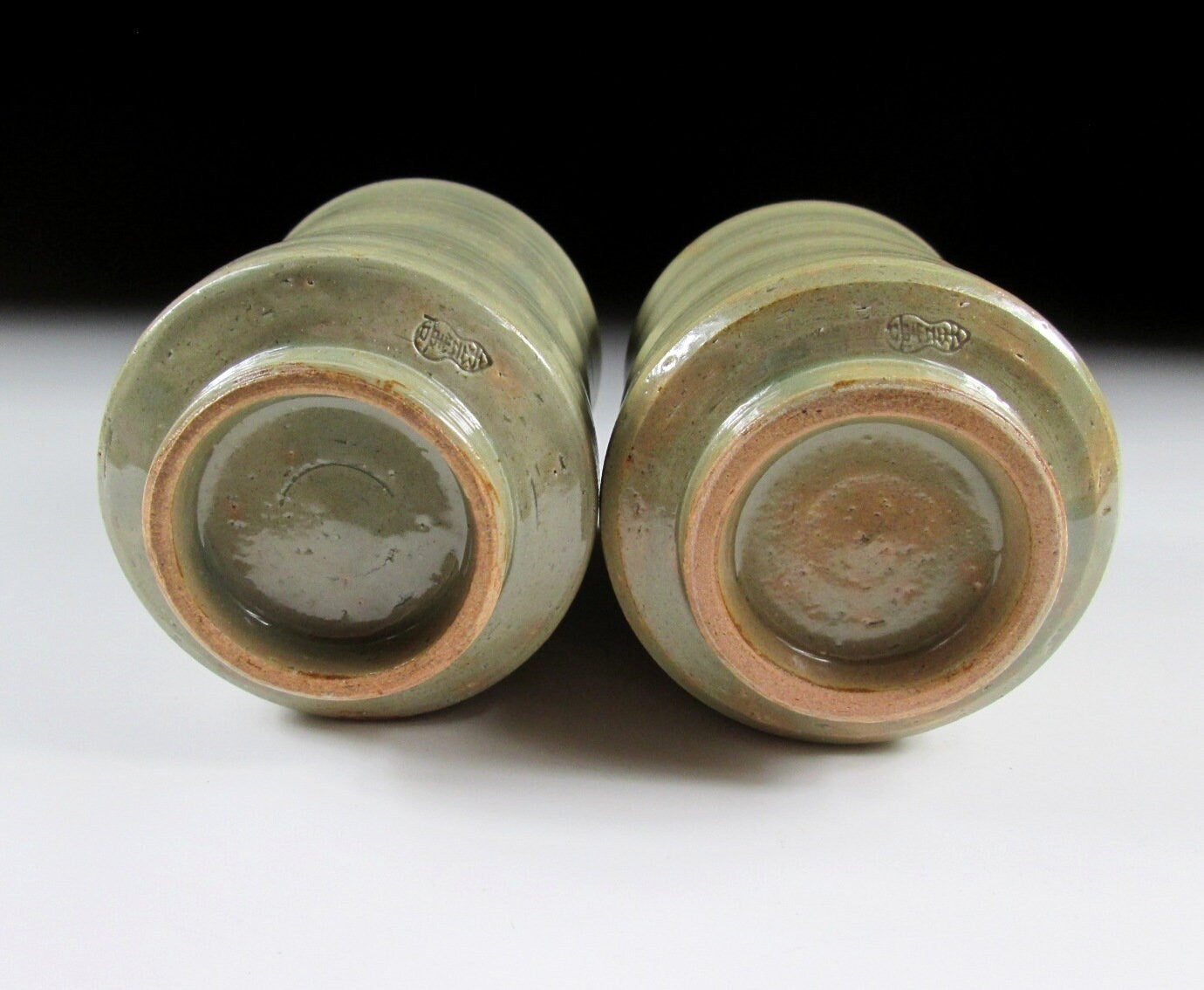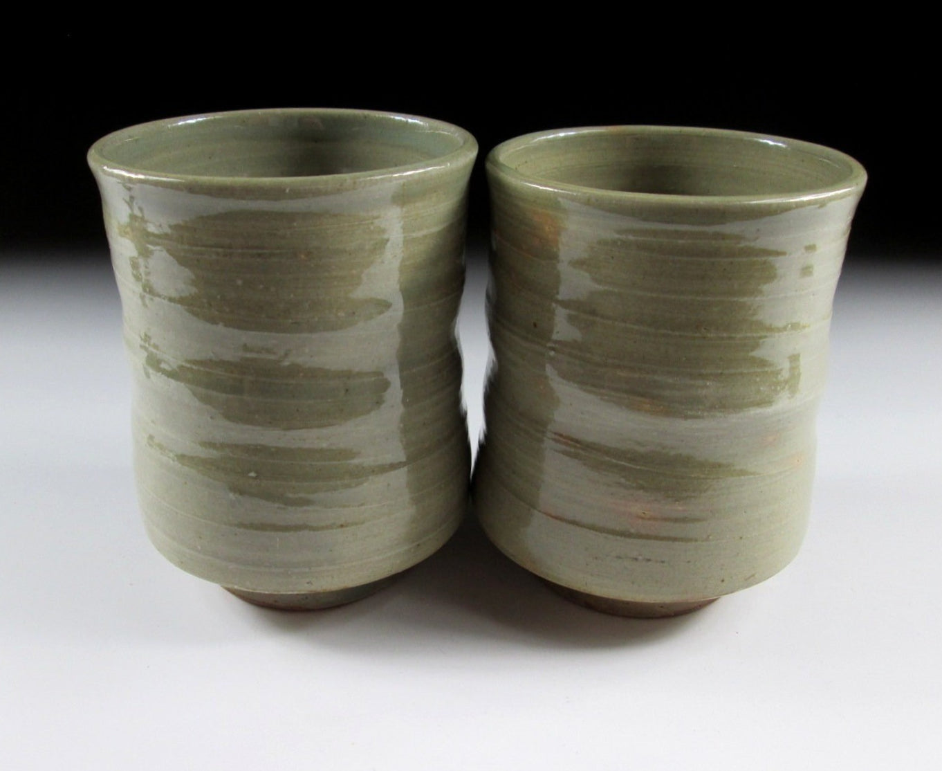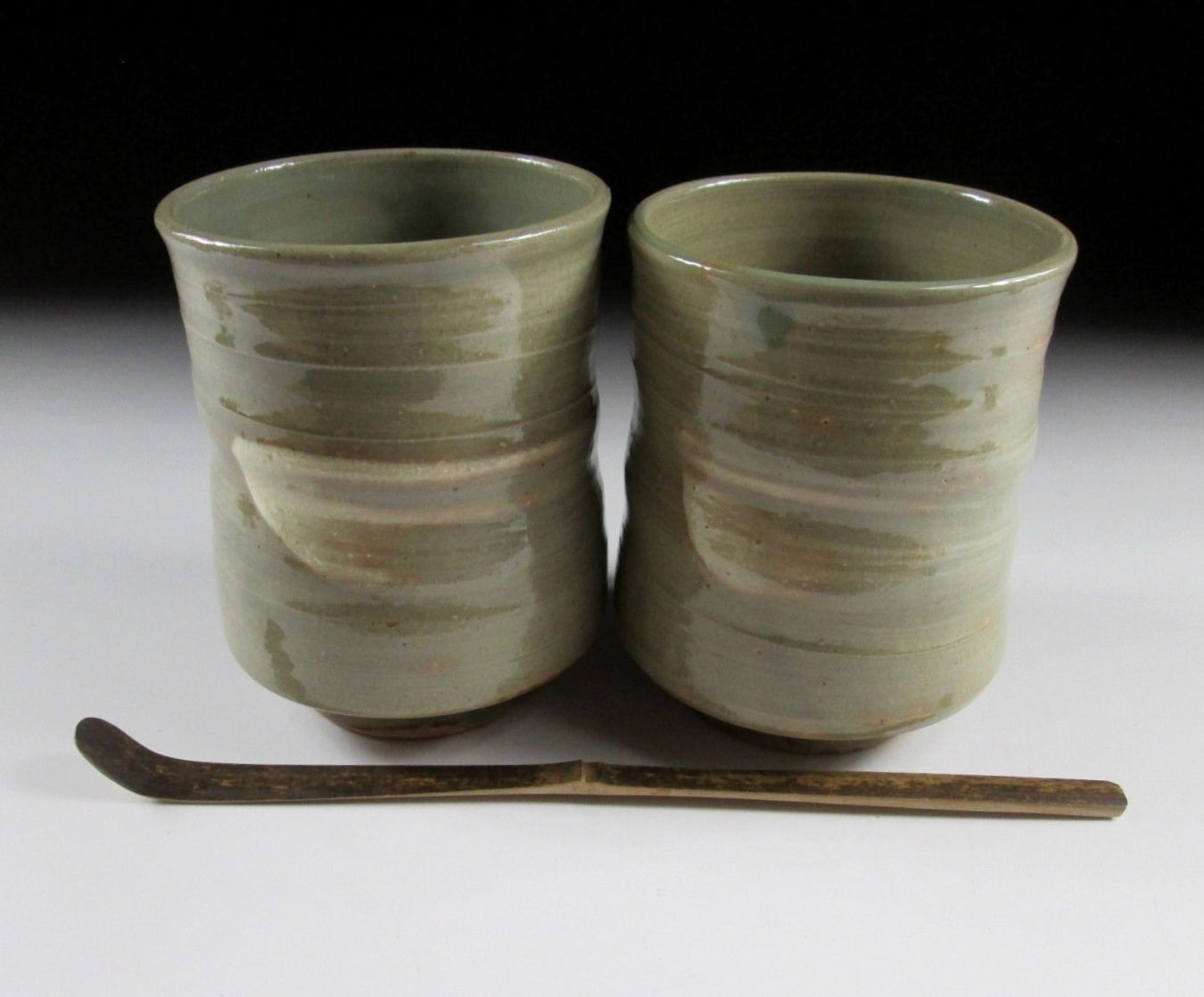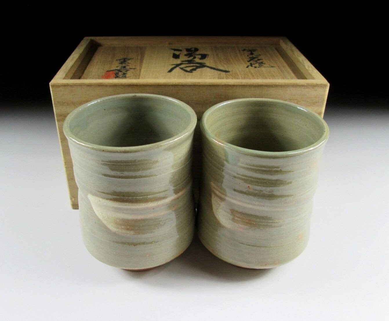 This listing is for a pair of Fujina-ware yunomi tea cups made around 20 years ago by noted potter, Tsuchiya Mikio III. They are wheel-thrown and coated in clear glaze. The front of each piece is decorated with white slip brushwork, and they’re similar in appearance to Hagi-ware. The stamp of the potter can be found on the bottom of each cup, and they come with their original signed wooden storage box. **PLEASE NOTE THAT THE CHASHAKU IS NOT INCLUDED.