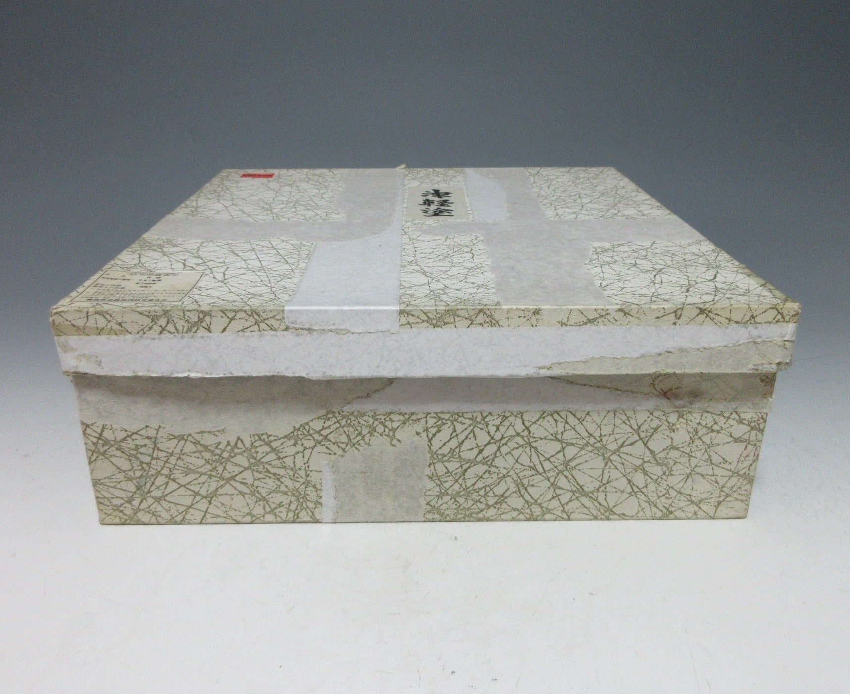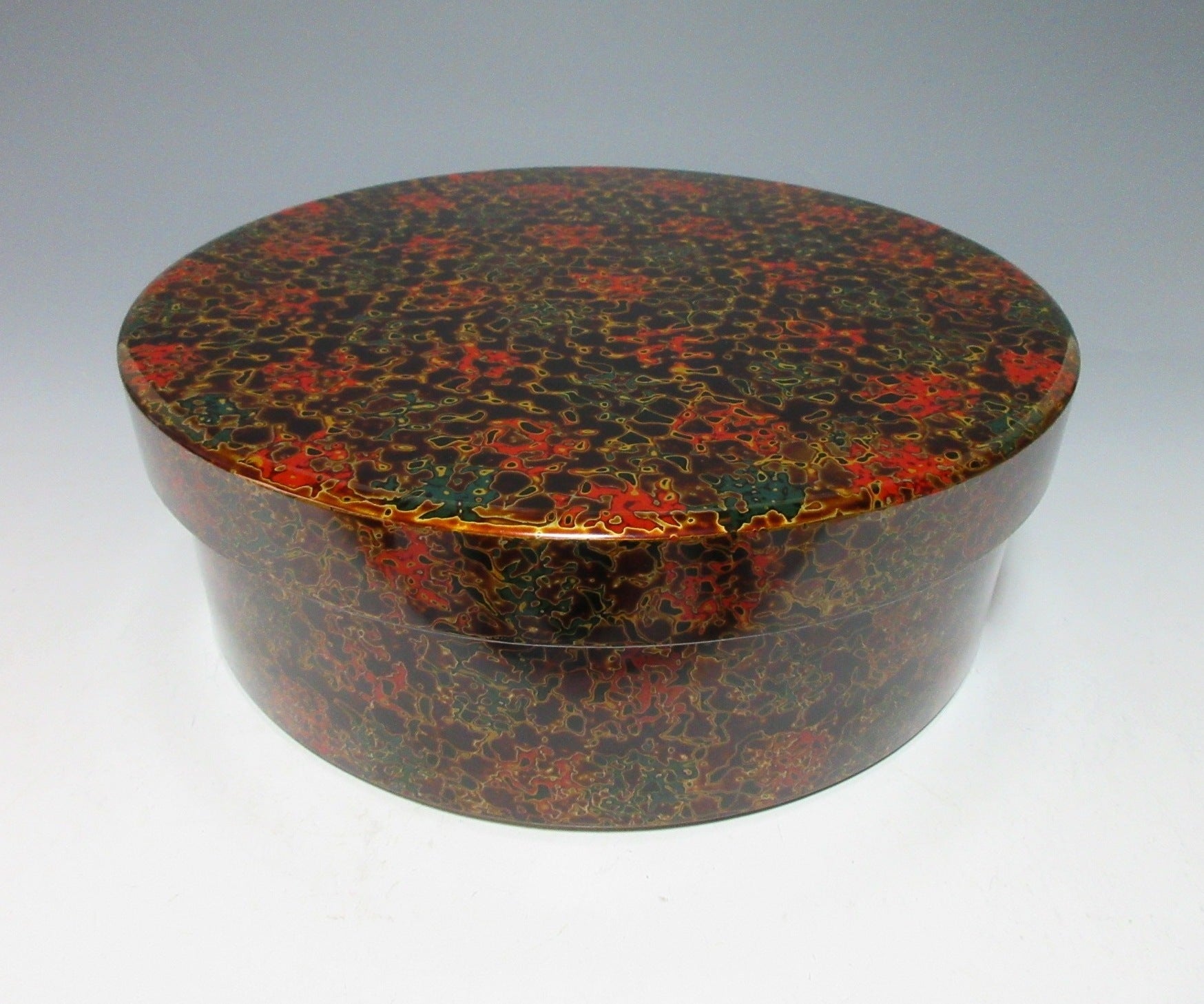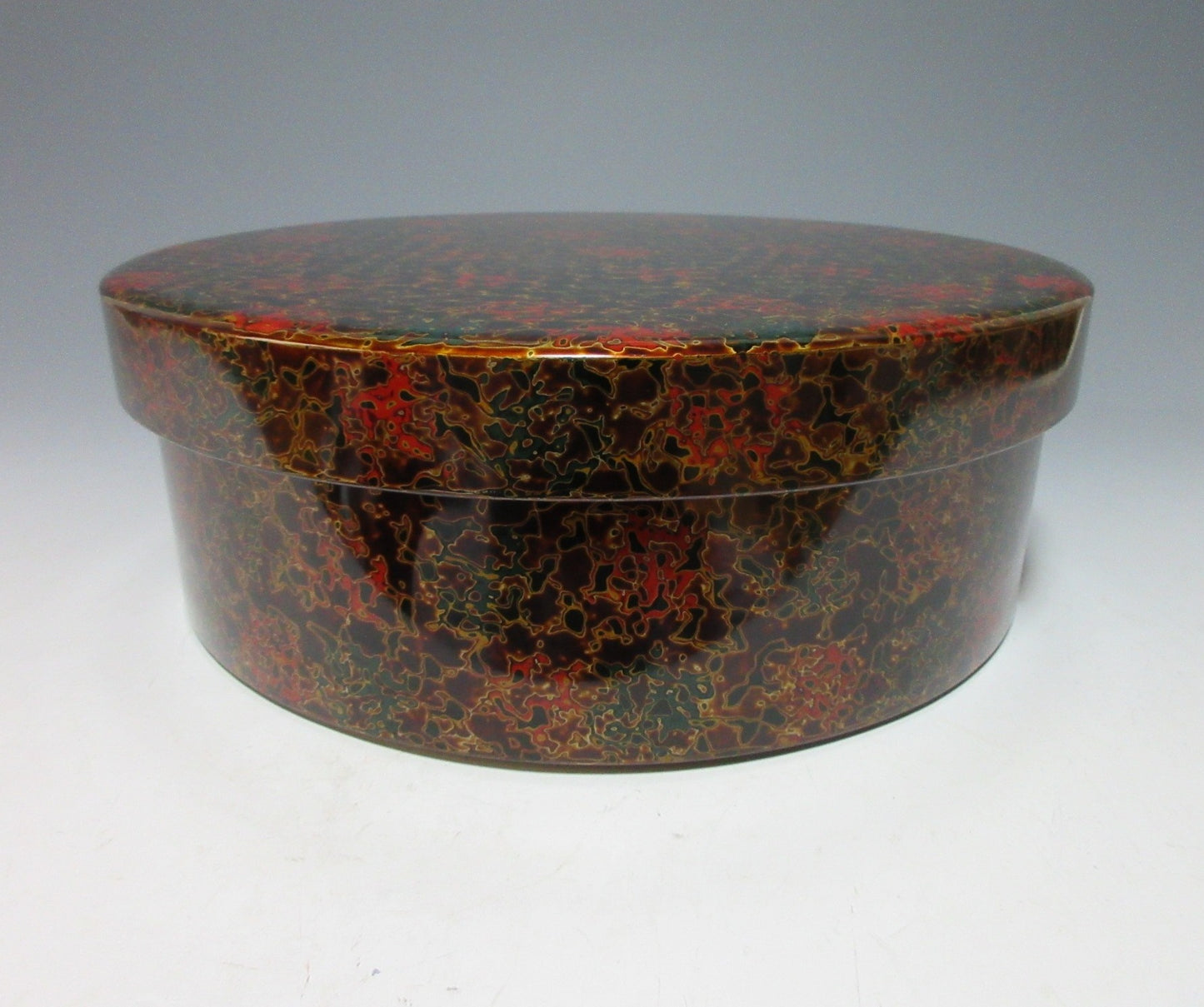 This listing is for a beautiful Tsugaru lacquerware chabitsu made around 10-20 years ago. A chabitsu is a round box for holding tea sets. The chabitsu in this listing is made of wood and this particular type of Tsugaru pattern is known as ‘Kara Nuri”. Kara Nuri is characterized by its smooth speckled appearance made with layers of sanded and polished lacquer. The hardened lacquer exterior forms a highly protective coating that repels water and protects the material underneath from salt and oil. To clean your chabitsu use a damp cloth and don’t allow water to sit inside. It comes with its original paper storage box, as well as a Japanese language profile paper.