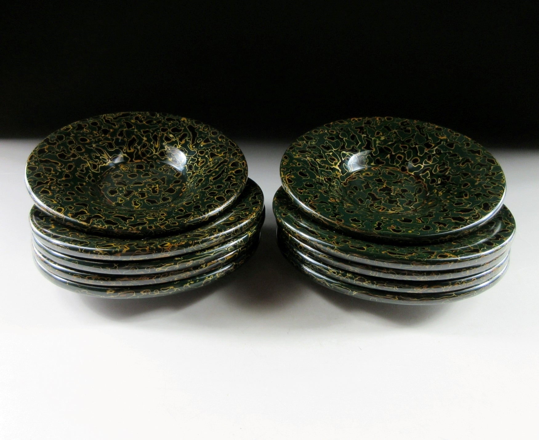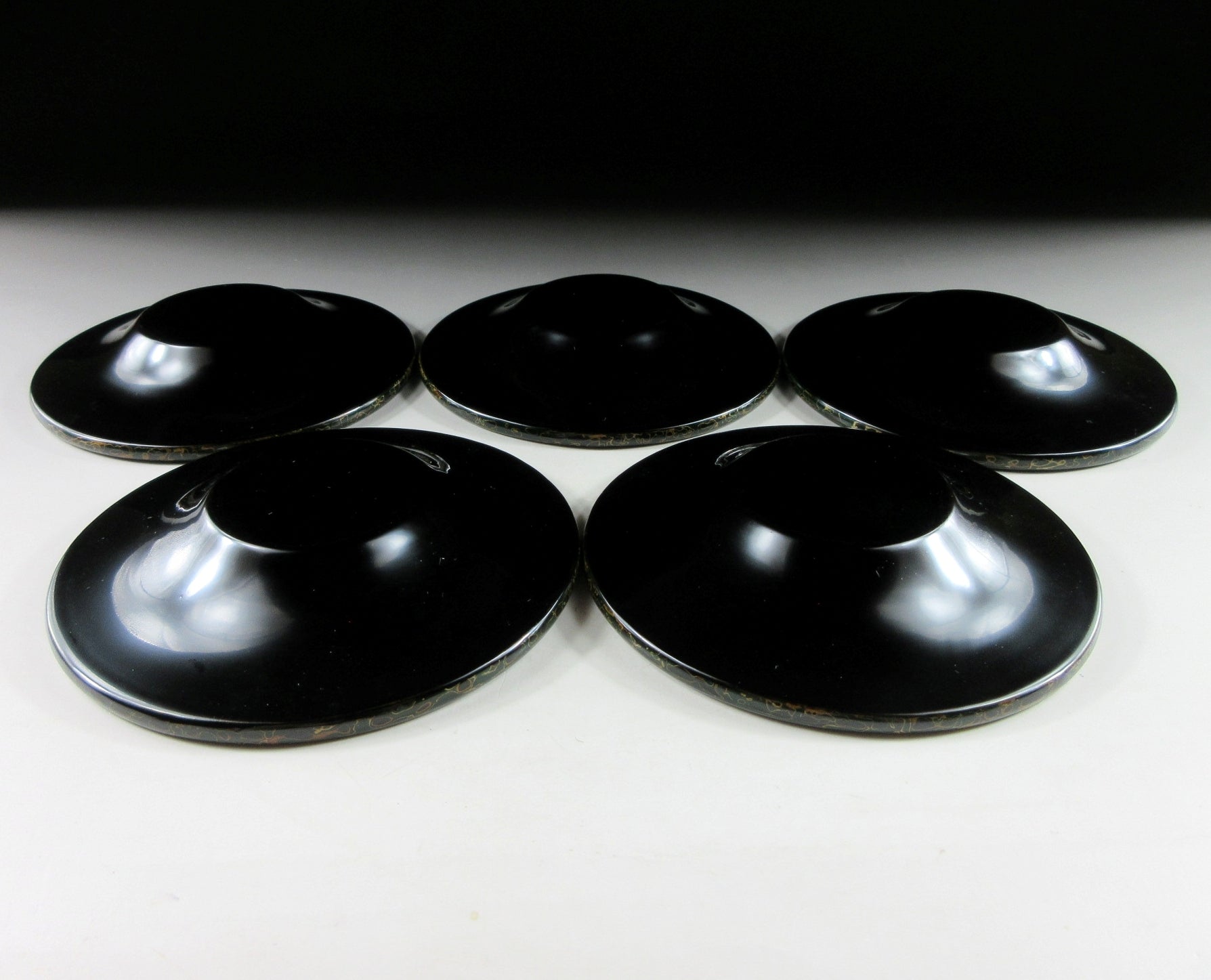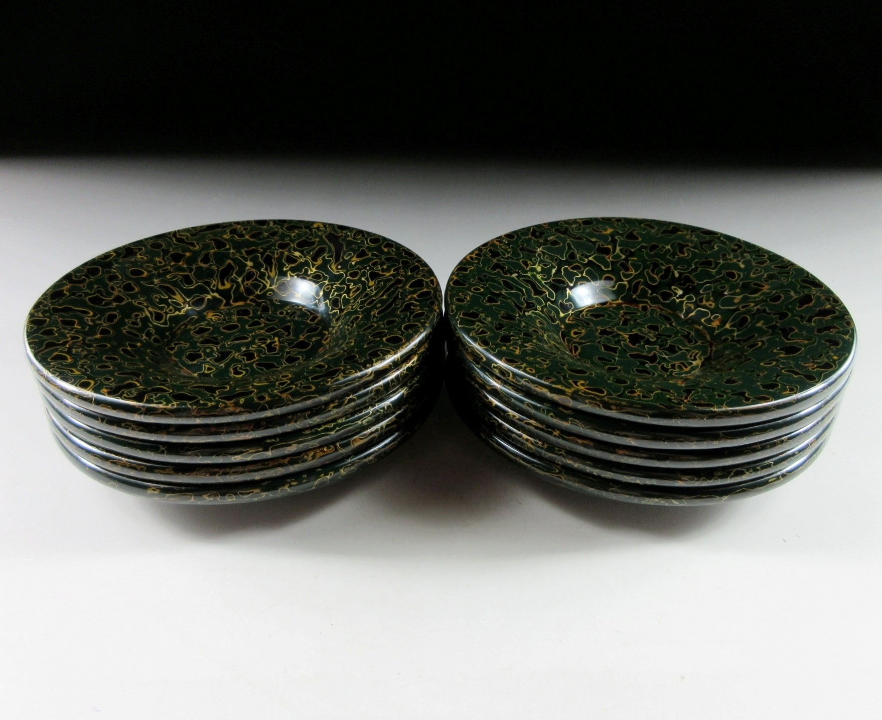 This listing is for a set of ten Tsugaru lacquerware chataku from Aomori. This particular type of Tsugaru pattern is known as ‘Kara Nuri”. Kara Nuri is characterized by its smooth speckled appearance made with layers of sanded and polished lacquer. The chataku in this listing are made of wood and they feature dark green and black lacquer. Green tsugaru pieces are generally harder to come by, especially in near perfect condition and as a set of ten. They come with their original paper storage box as well as a Japanese language profile paper.