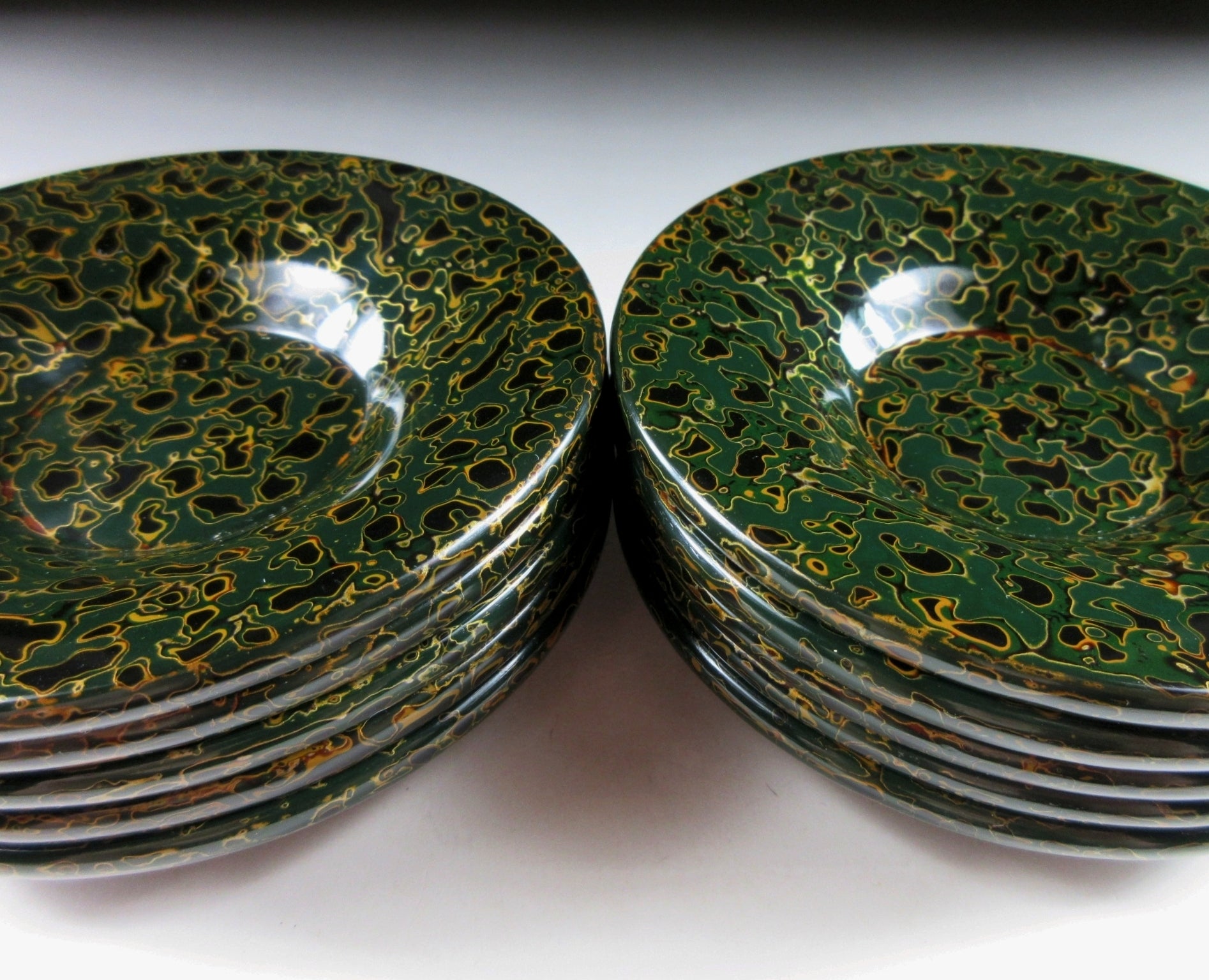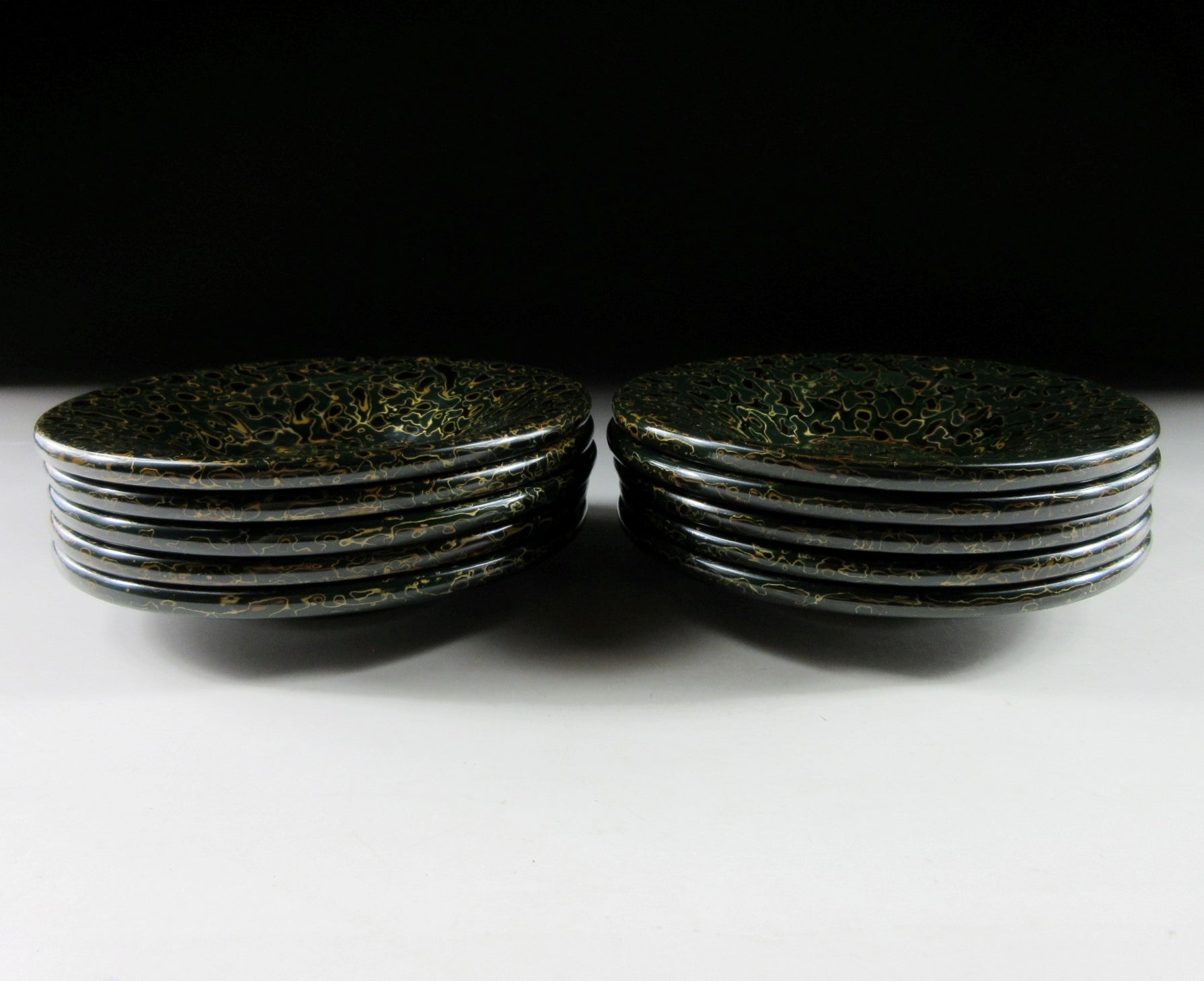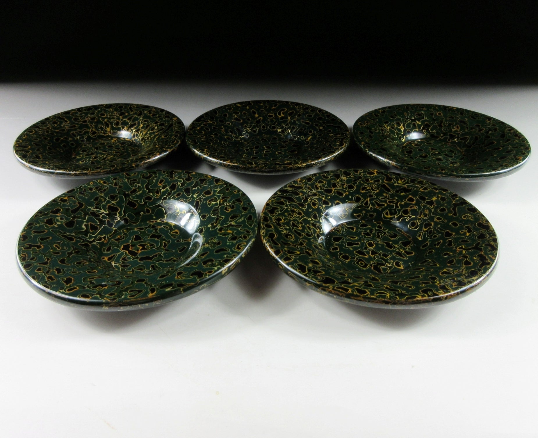 This listing is for a set of ten Tsugaru lacquerware chataku from Aomori. This particular type of Tsugaru pattern is known as ‘Kara Nuri”. Kara Nuri is characterized by its smooth speckled appearance made with layers of sanded and polished lacquer. The chataku in this listing are made of wood and they feature dark green and black lacquer. Green tsugaru pieces are generally harder to come by, especially in near perfect condition and as a set of ten. They come with their original paper storage box as well as a Japanese language profile paper.