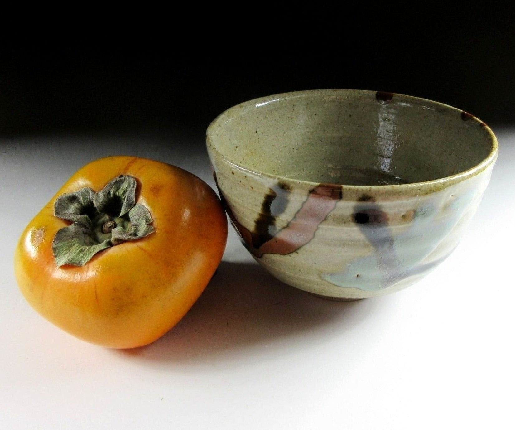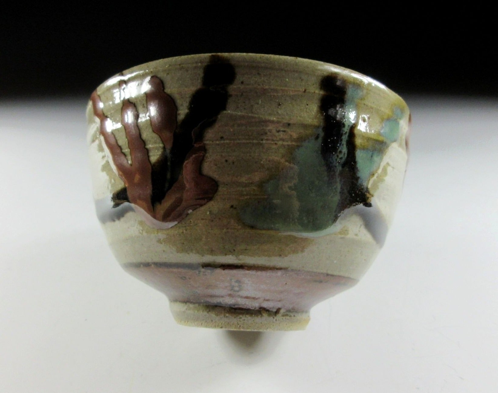 This listing is for a Mashiko-ware chawan made around 40 years ago by Tsukamoto Gama. It is wheel-thrown and the glaze work consists of three Mashiko staples – brown kakigusuri persimmon glaze, black Mashiko guro glaze, and Shiogusuri salt glaze combined with cobalt. It has a nice clean interior and a nice deep wan-nuri shape for whisking. It comes with its original signed wooden storage box as well as a Japanese language profile paper about the kiln.