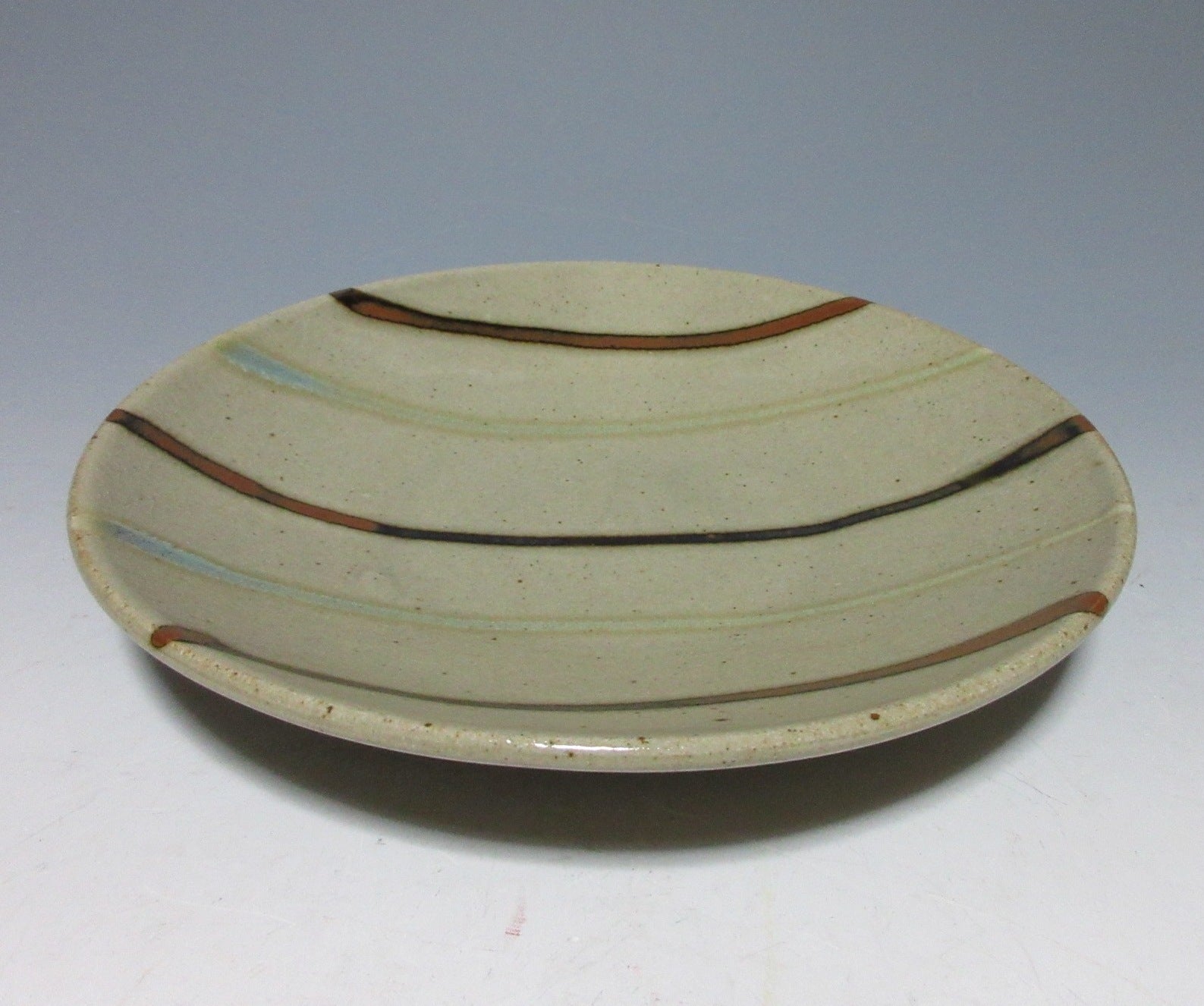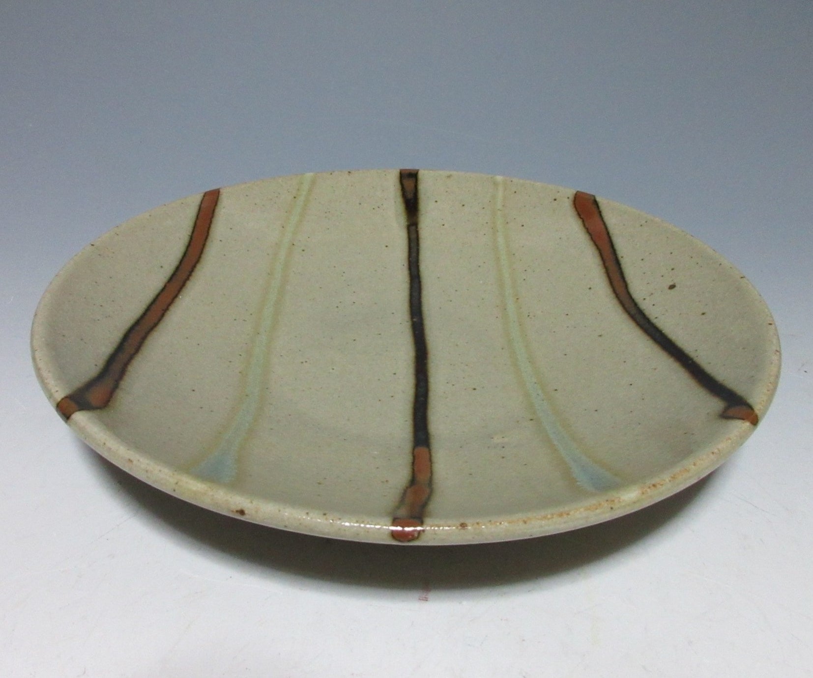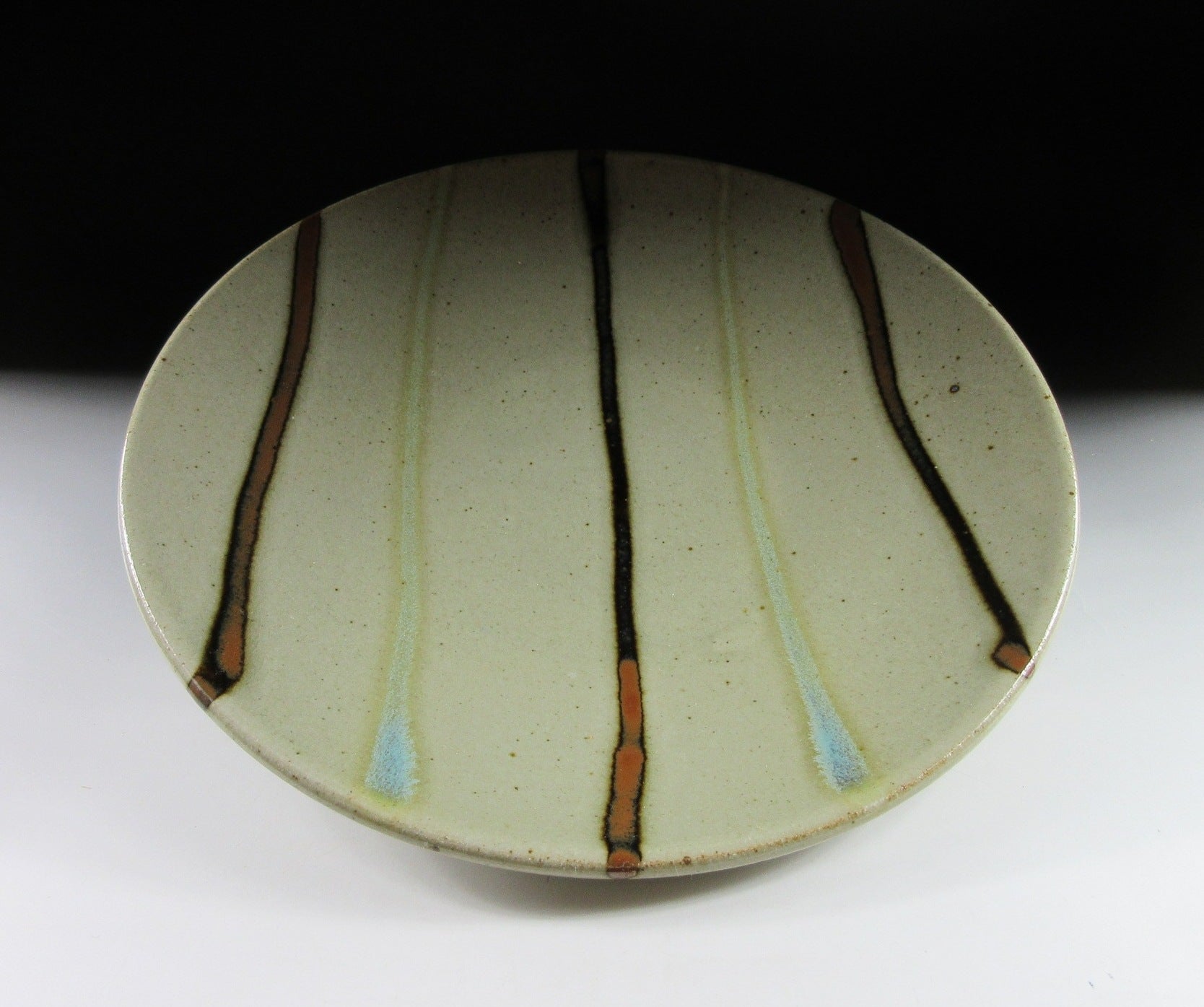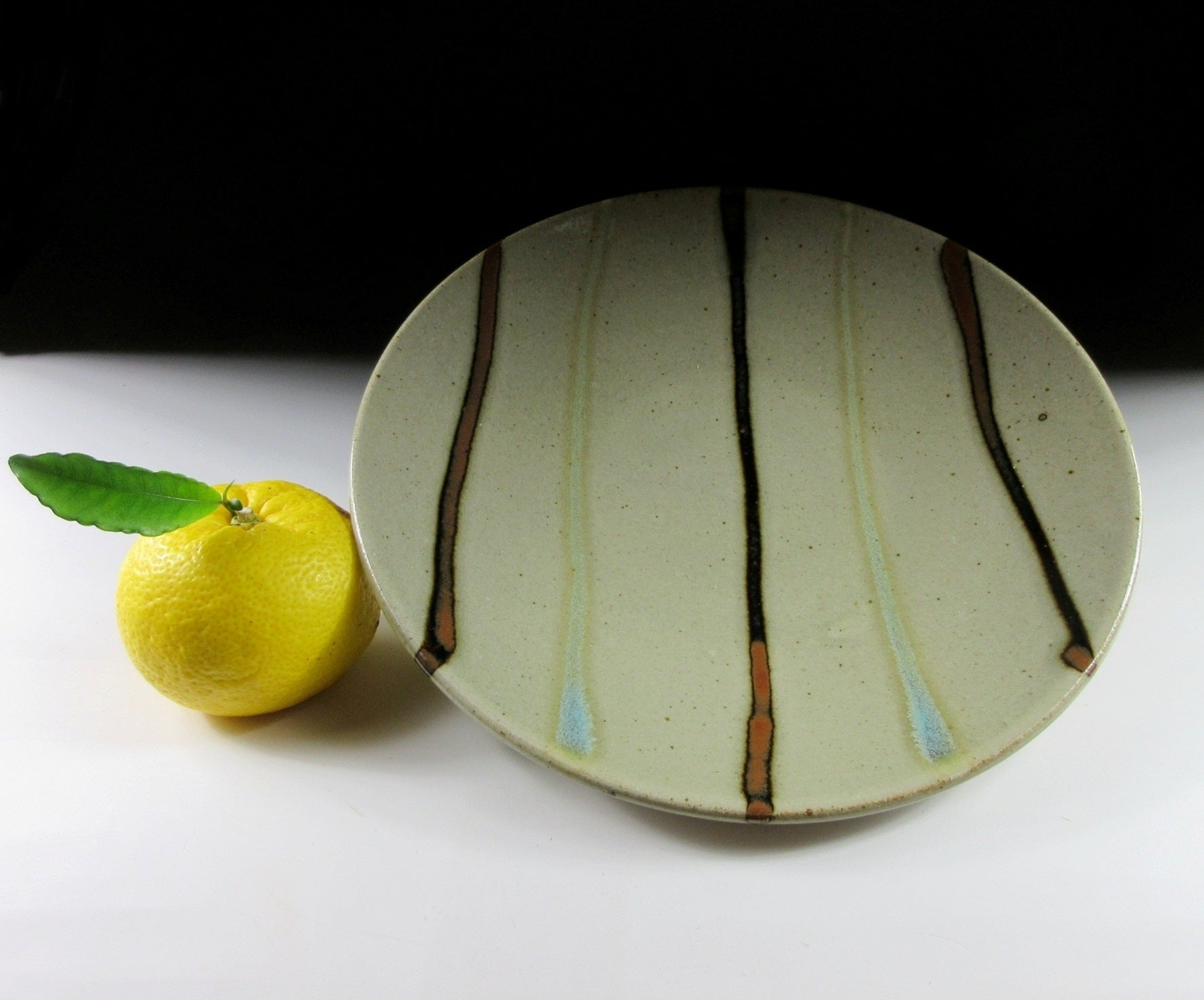 This listing is for a reasonably large Mashiko-ware plate made around 30 years ago by Tsukamoto Gama. It is wheel-thrown and decorated with celadon and persimmon kaki glaze stripes over a high-fired stoneware base. This piece would function well as a fruit bowl and it would make a lovely display item. Please note that it is unsigned on the back which is quite common for Mashiko pieces since the Mingei Folk Art Movement.