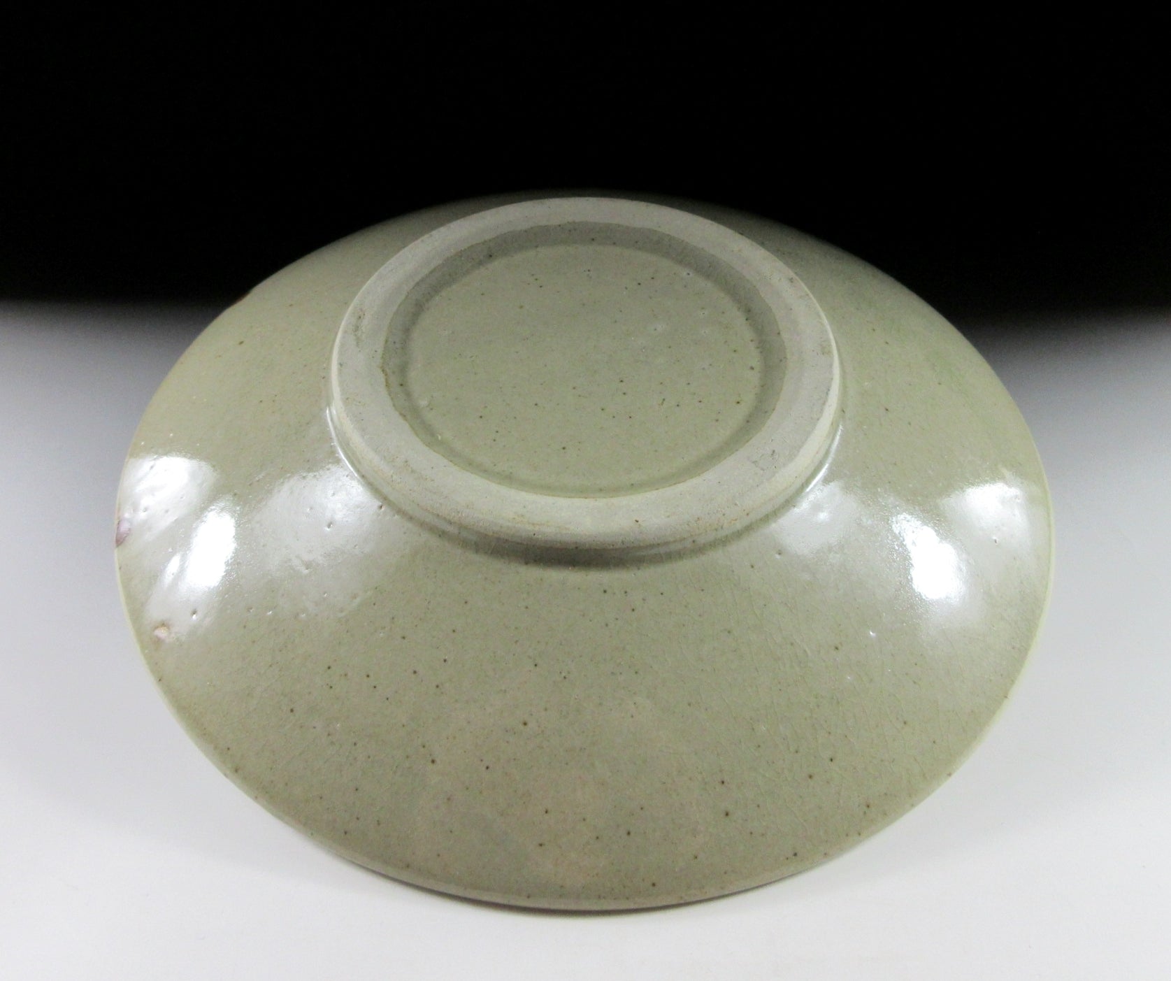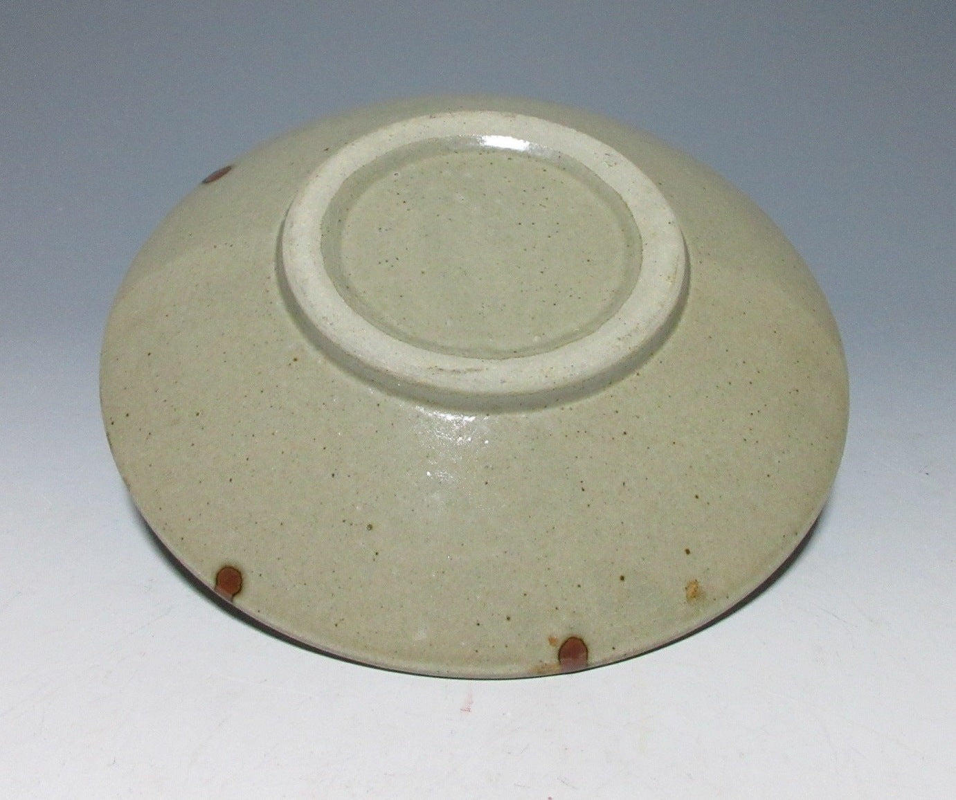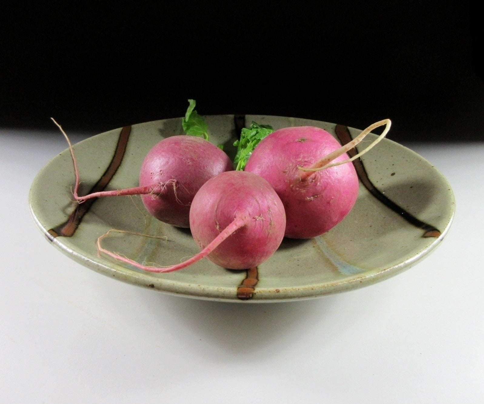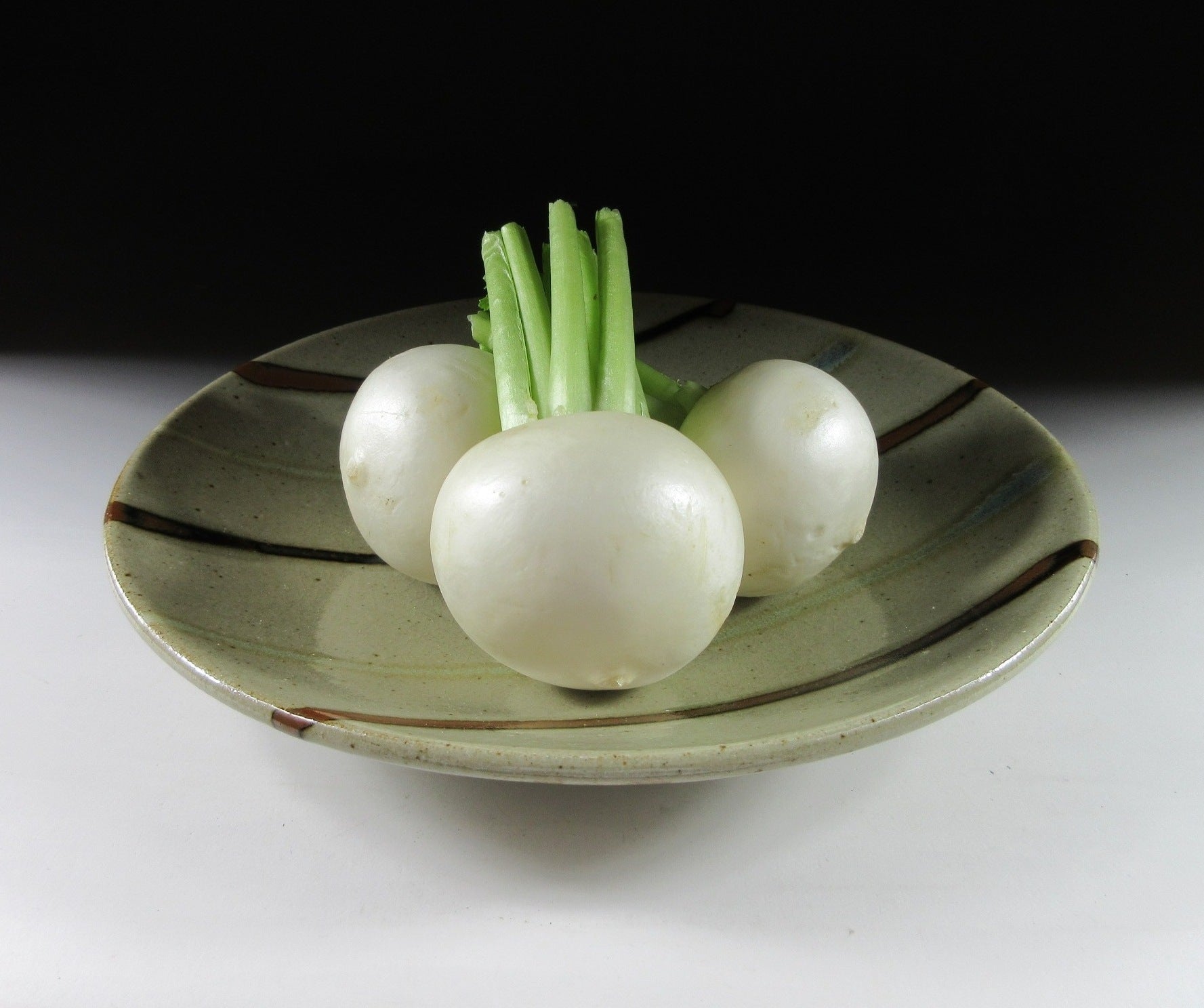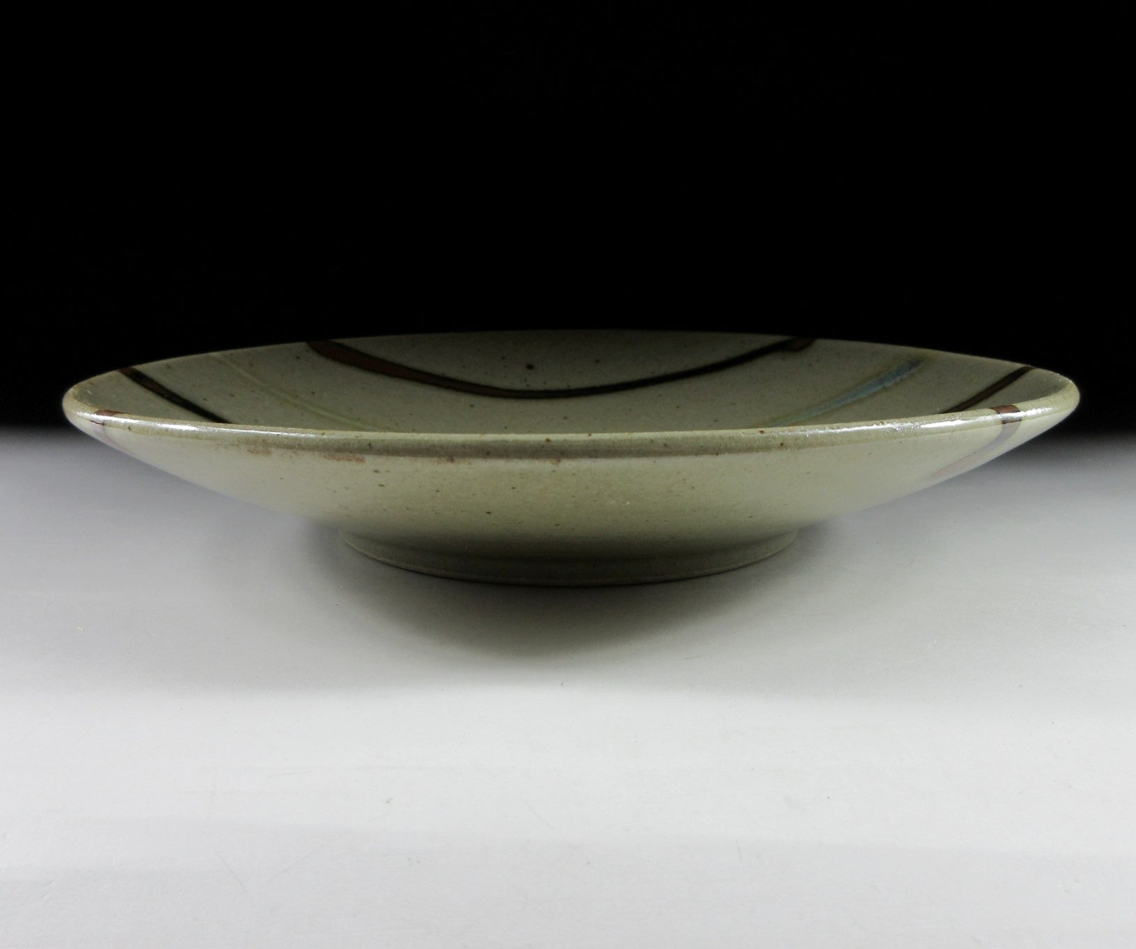This listing is for a reasonably large Mashiko-ware plate made around 30 years ago by Tsukamoto Gama. It is wheel-thrown and decorated with celadon and persimmon kaki glaze stripes over a high-fired stoneware base. This piece would function well as a fruit bowl and it would make a lovely display item. Please note that it is unsigned on the back which is quite common for Mashiko pieces since the Mingei Folk Art Movement.
