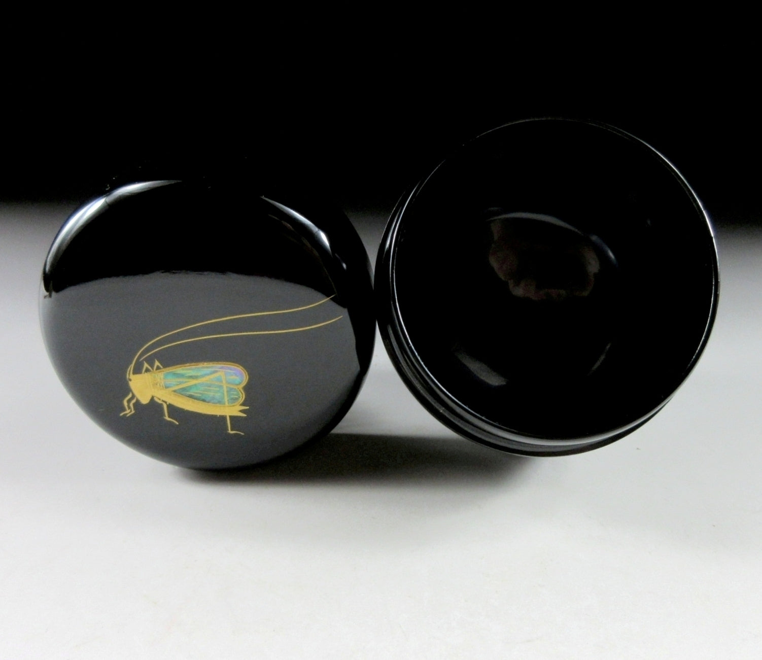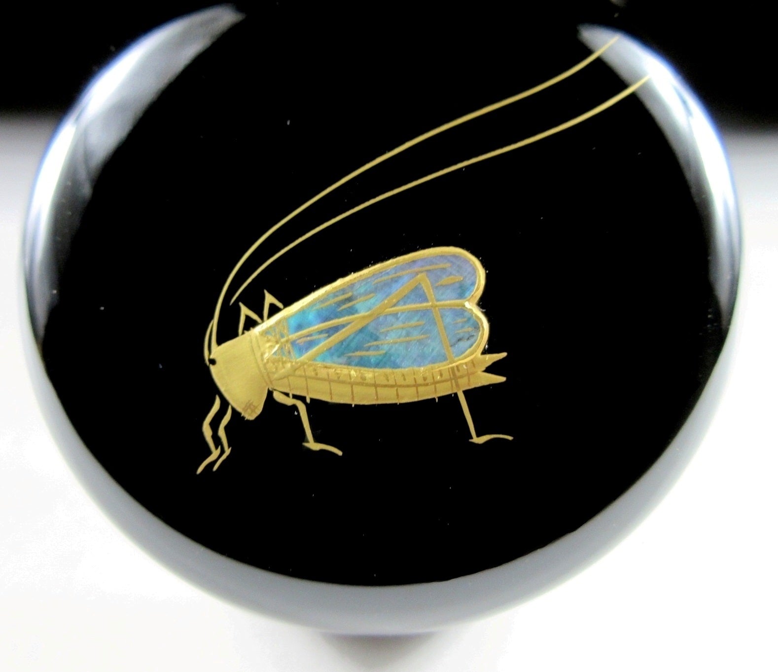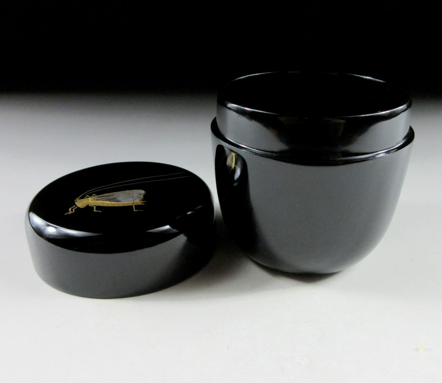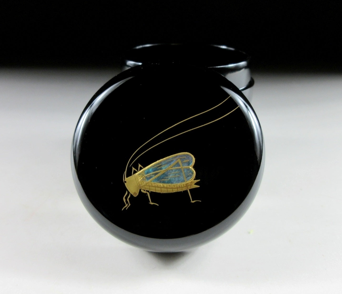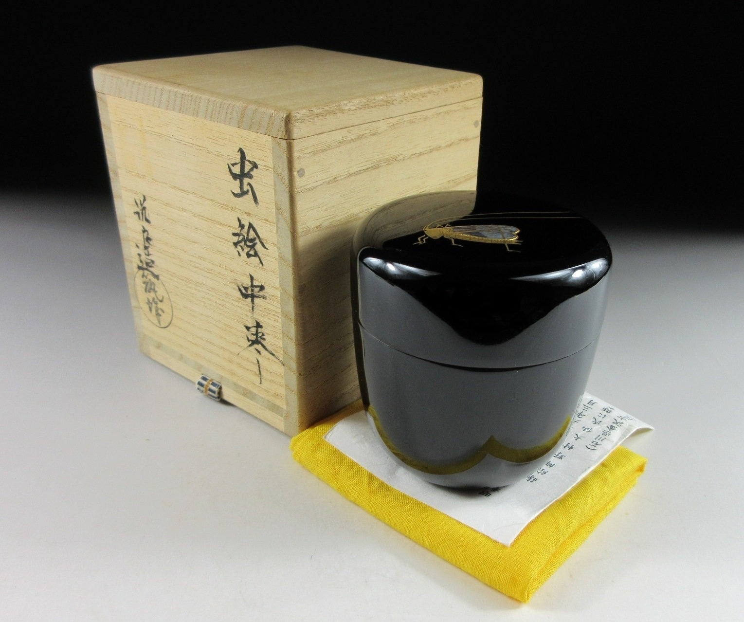 This listing is for an attractive natsume made around 10-20 years ago by Tsukushiro Tsukuryo. It is made of wood and decorated with a makie and mother of pearl depiction of a bell cricket. Bell crickets, or suzumushi as they are known in Japanese, signify the change in seasons from summer to autumn. From the end of summer to autumn, suzumushi make a pleasant chirping sound like a bell. Bell crickets are often viewed with a sense of nostalgia during quiet autumn nights. It comes with its original signed wooden storage box, as well as a yellow wrapping cloth for when the item is not in use. It also comes with a Japanese language profile paper about the craftsperson.