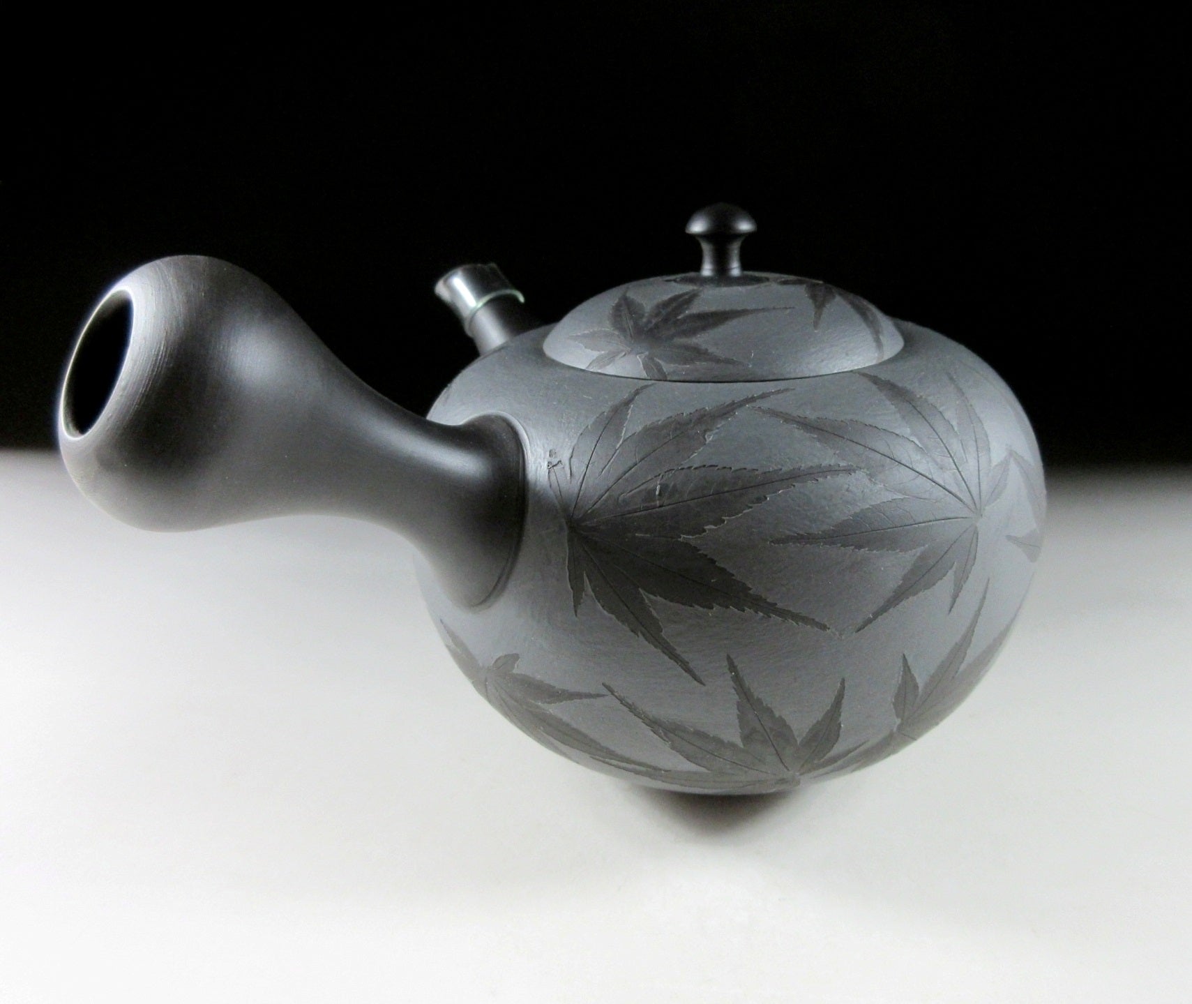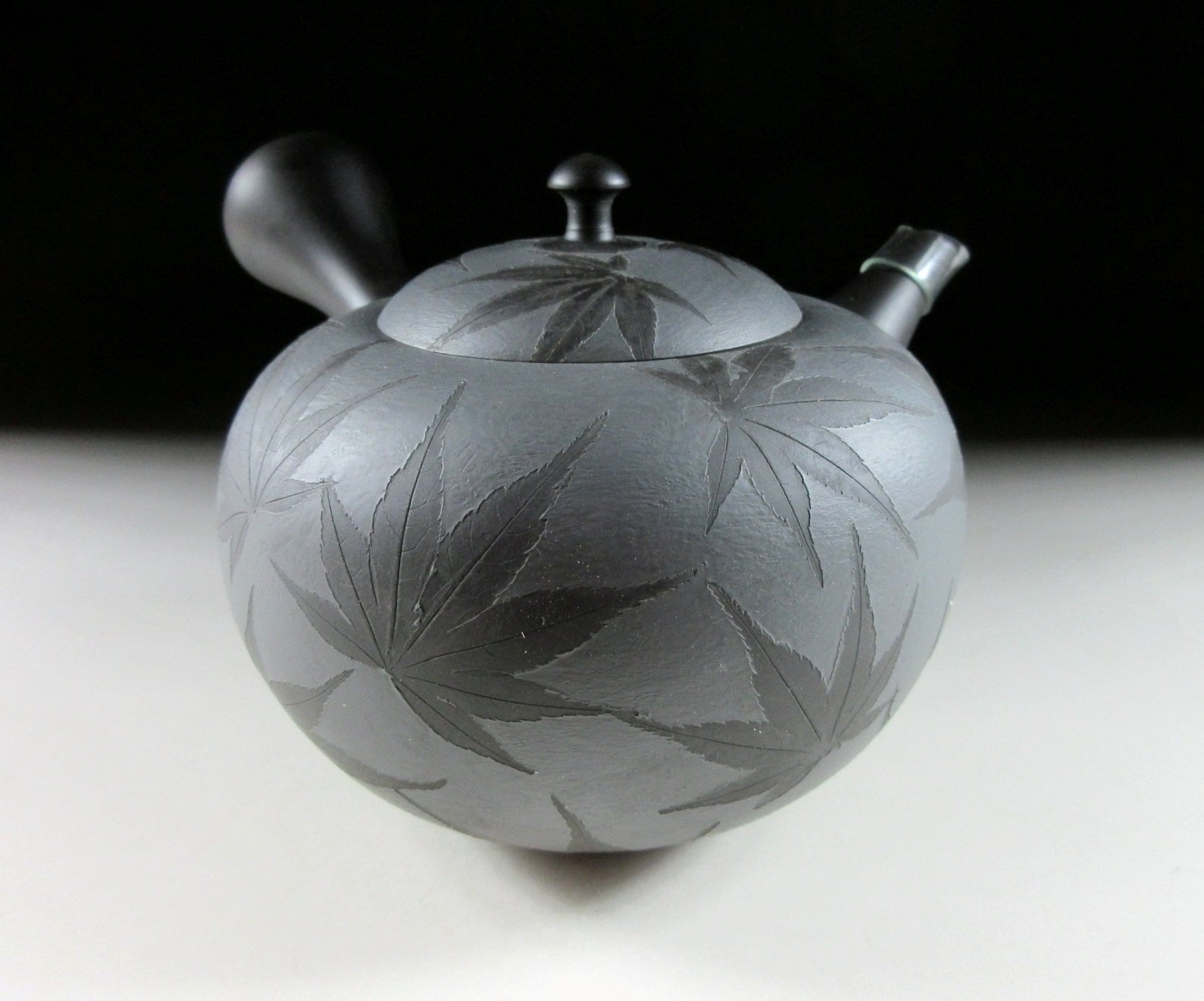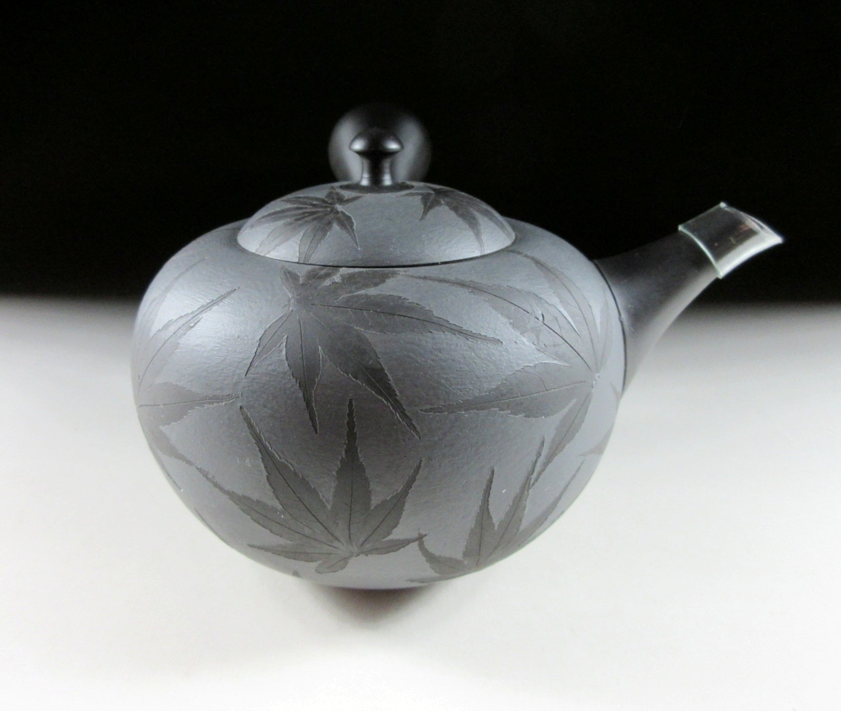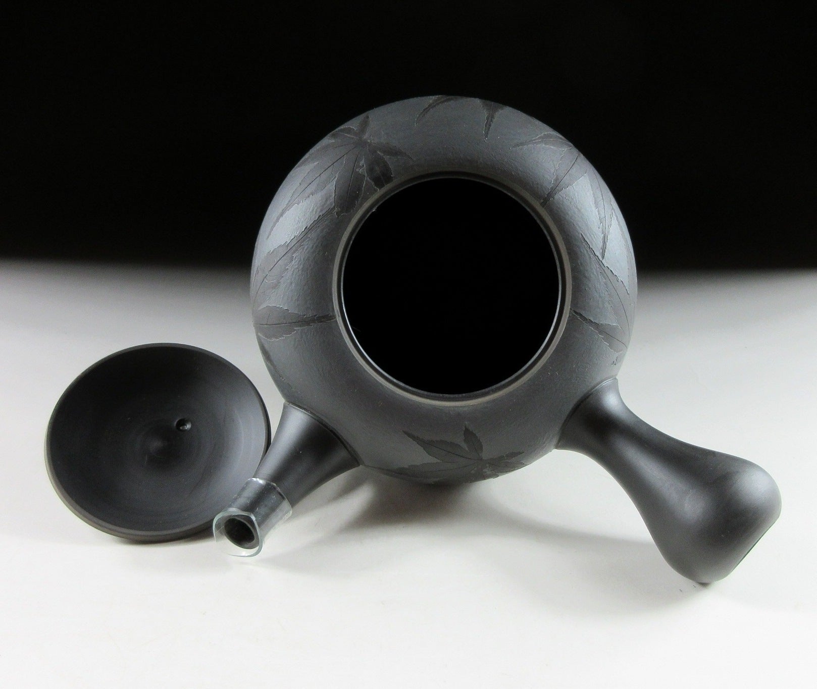 This listing is for a Tokoname-ware kyusu made around 10 years ago by noted potter Tsuzuki Seiho. It is wheel-thrown and the exterior is decorated with the imprints of real momiji maples leaves over a slightly textured background. This particular kyusu has a capacity of 500ml, and there’s a built-in strainer over the spout area to prevent tea leaves from pouring with the tea. The signature of the potter can be found on the bottom. It comes with its original signed wooden storage box, as well as a stamped turmeric coloured wrapping cloth for when the item is not in use. It also comes with a Japanese language profile paper about the potter.