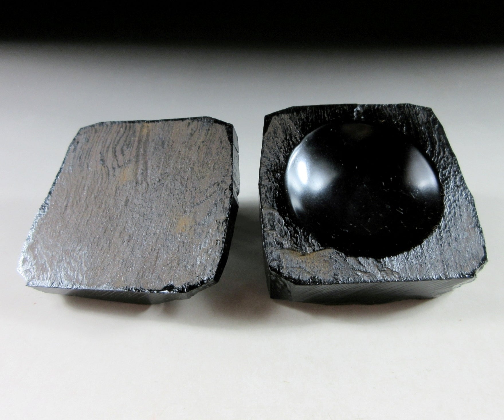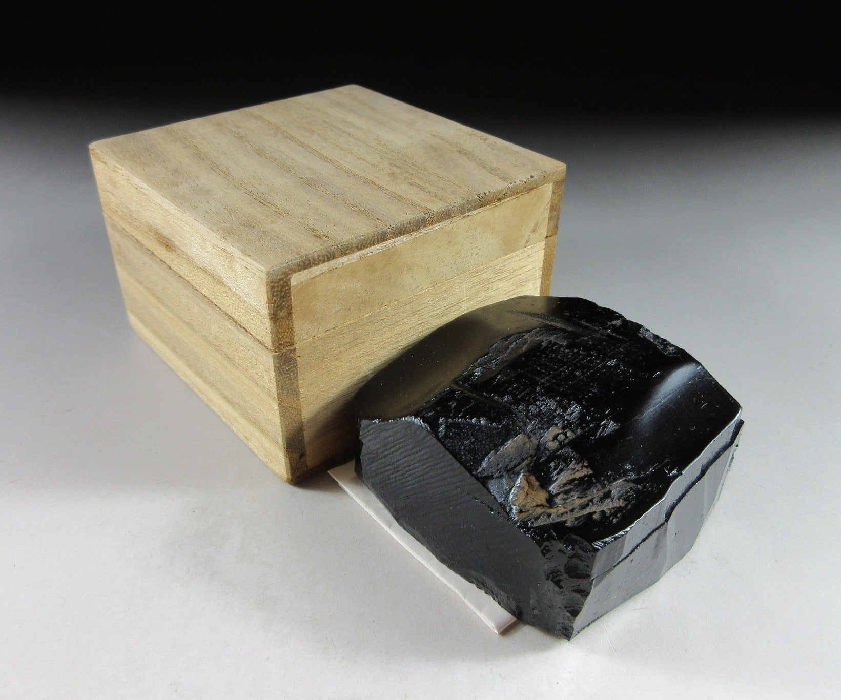 This listing is for an Umoregi-zaiku kogo made around 30-40 years ago by veteran umoregi artisan, Kotake Takashi. Umoregi translates as bogwood, a carbonised version of pine, yew and cypress trees that have been buried for many thousands of years. Bogwood occurs during the early stages of fossilisation, and it has been used to craft wares since the Edo period. Vast amounts of bogwood found in the Sendai area led to a boom in bogwood crafts. Eventually production declined and now only one workshop produces bogwood crafts. This workshop is operated by Kotake Takashi and his apprentice Suzuki Ayano. The kogo is this listing was handcrafted by Kotake and consists of rough textures combined with smooth lacquered parts. Its size and shape is suitable for holding woodchip incense, and wooden kogo are typically reserved for use the warmer months. It comes with its original UNSIGNED wooden storage box, as well as a Japanese language profile paper umoregi-zaiku, and another from a store named Senshin-an. Senshin-an is located nearby Zuiganji temple, they offer a wide range of souvenirs handcrafted by artisans from the Matsushima Bay area, most likely this kogo was purchased from there.