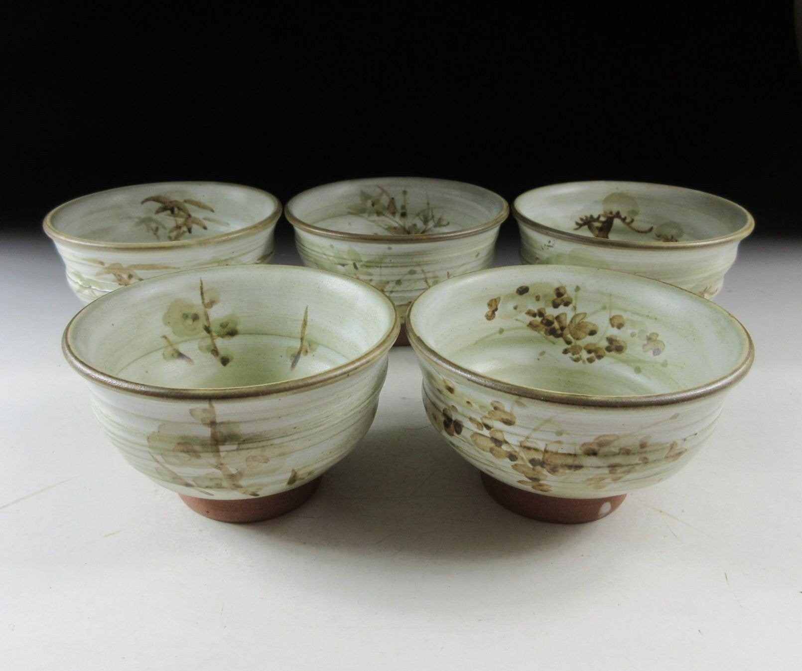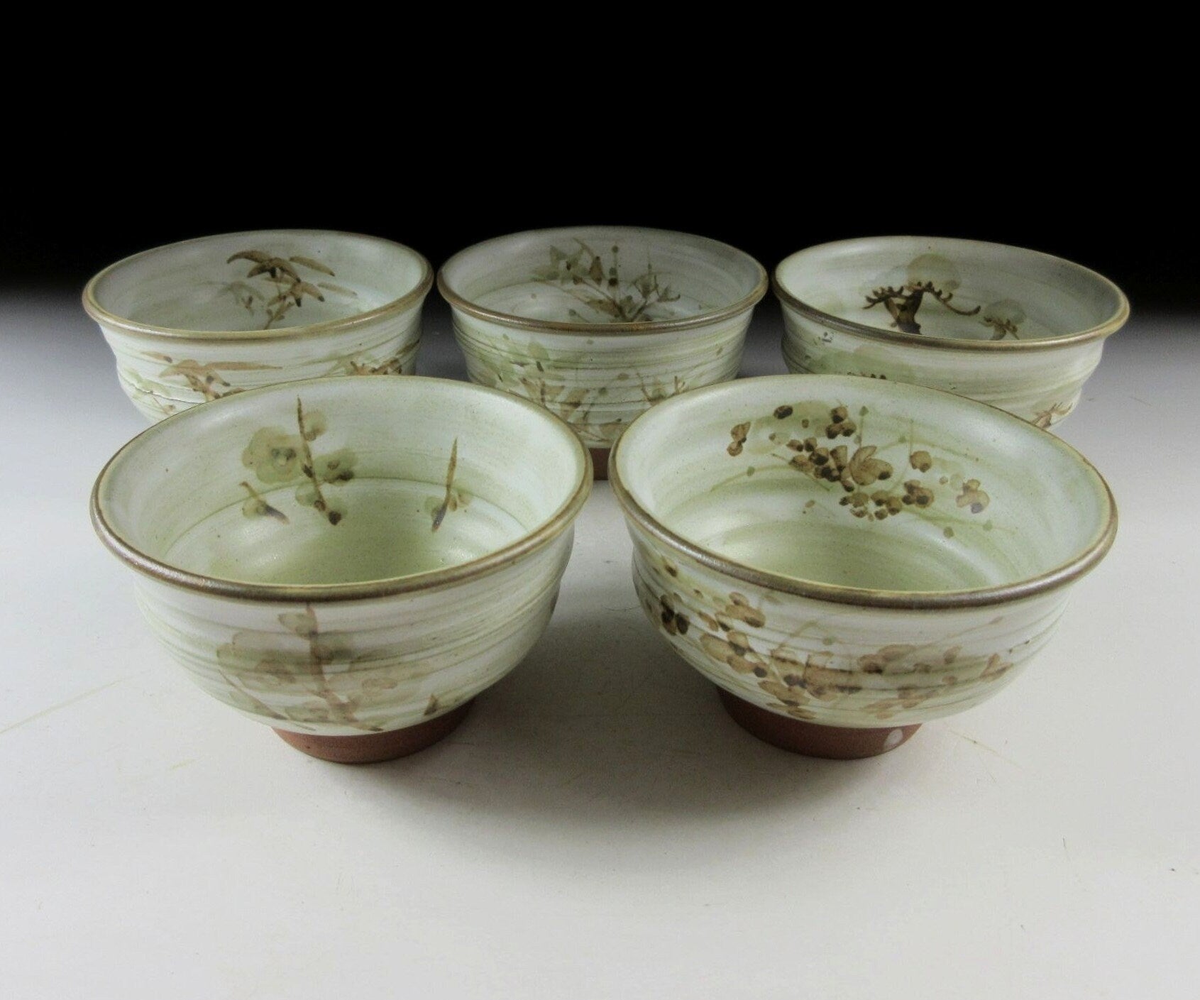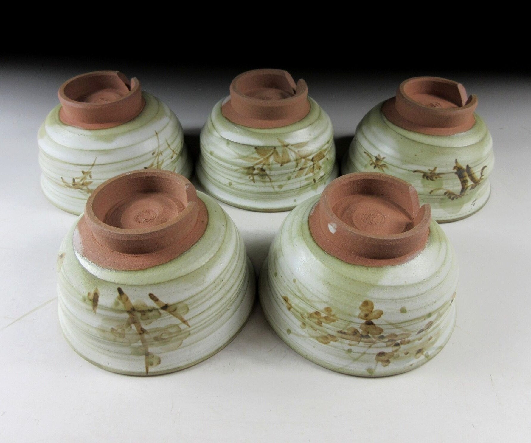 This listing is for a set of Kiyomizu-ware five tea cups made around 10-20 years ago by Unraku Gama. They are wheel-thrown and decorated with five different plant motifs over a light coloured background. This set is made of high-fired stoneware and is suitable for daily use. The stamp of the kiln can be found on the bottom of each cup and they come with their original paper storage box.