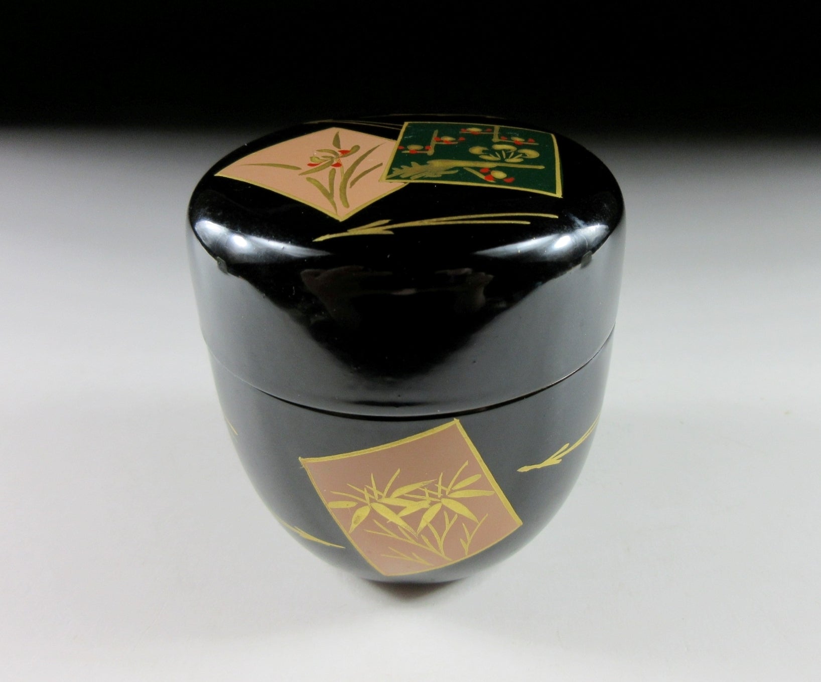 This listing is for an urushi lacquerware ‘shochikubai’ natsume made around 20 years ago. It is made of wood and decorated with an auspicious makie shochikubai pattern over a black lacquered base. Shochikubai is the combination of pine, bamboo and plum blossoms, and typically associated with the New Year in Japan. All three are admired in both Japan and China as they do not wither against the cold of winter. The interior is lacquered black and this piece has a nice clean interior.