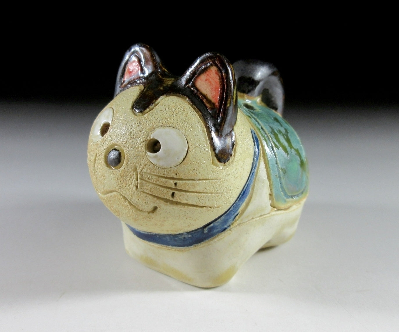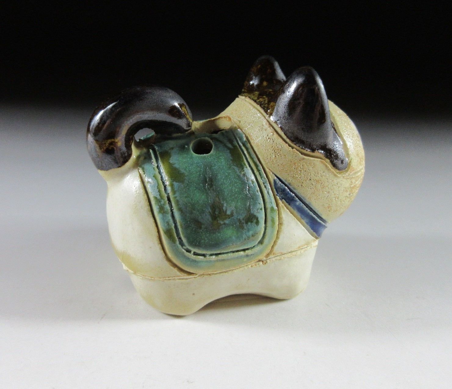 This listing is for a VERY SMALL Mino-ware joss stick incense burner. It is made of stoneware and moulded to resemble a hariko inu. A hariko inu is a traditional folk toy that’s actually a dog, not a cat. Dogs have long been considered guardians of the home, so hariko inu are thought to protect children and are also given to pregnant women as a talisman for easy childbirth. The burner in this listing has four vents in the back and a small pottery stick holder on the interior. To burn long incense sticks simply leave the top off. This little burner is also suitable for burning incense cones. It comes with its original paper storage box.