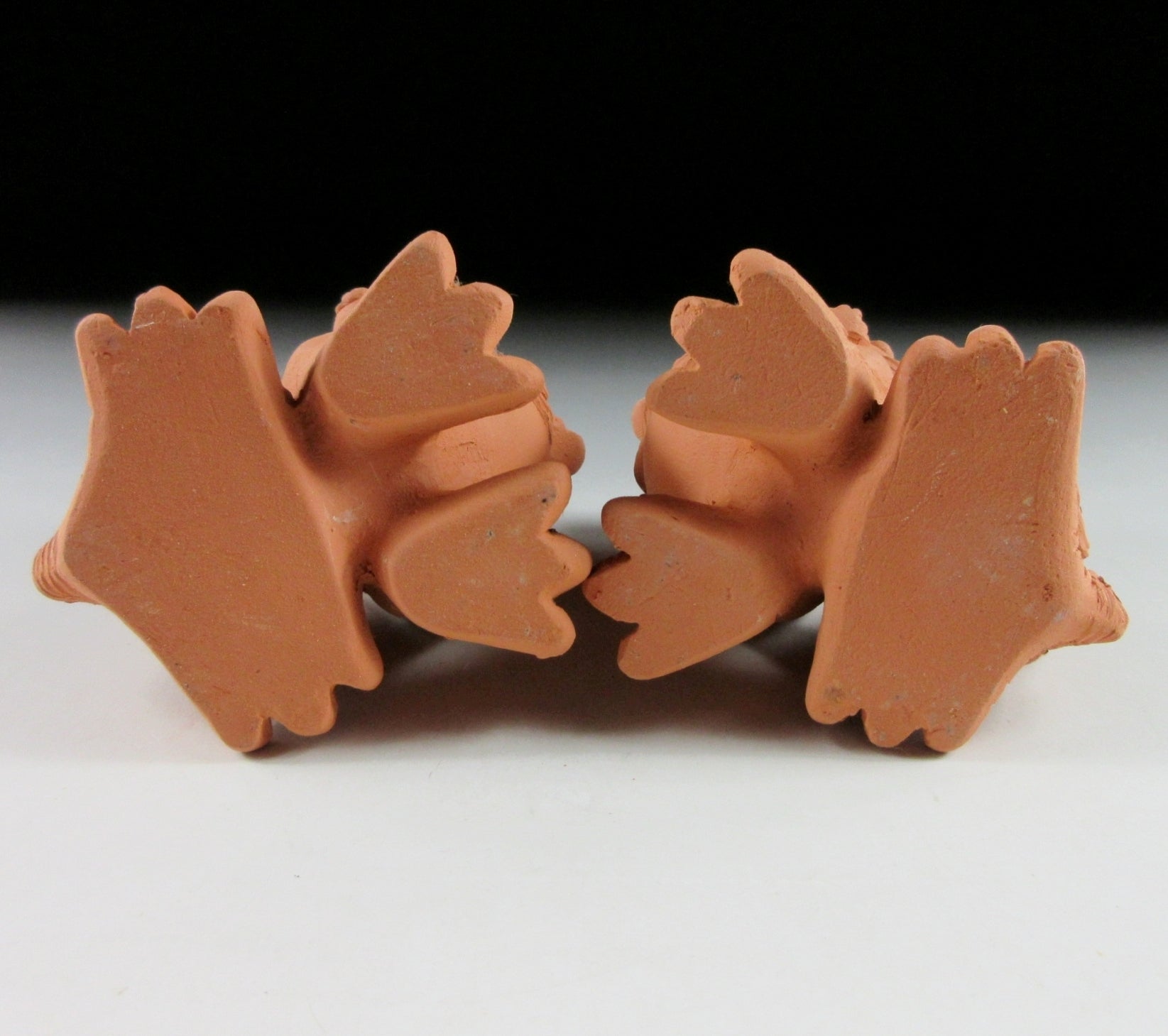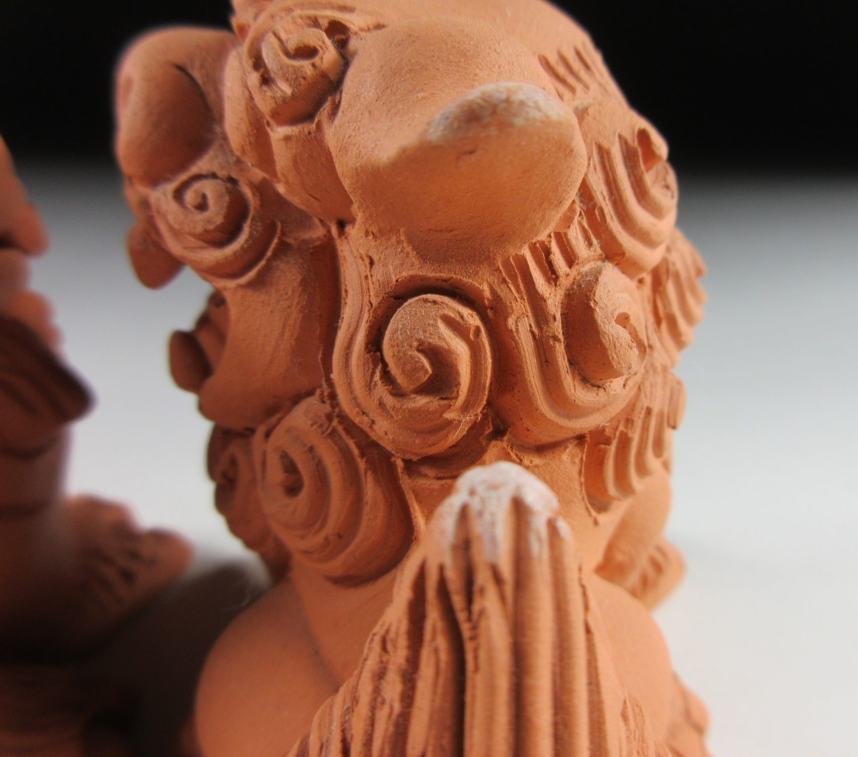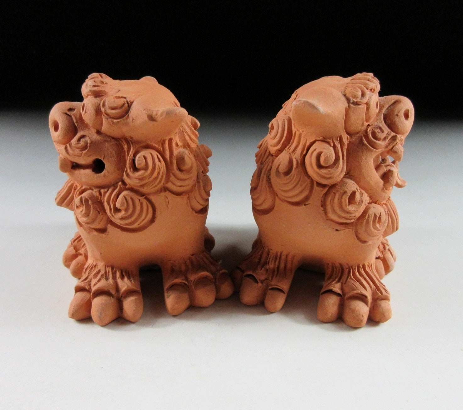 This listing is for a pair of VERY SMALL sized Ryukyu-ware shisa made around 20-30 years ago. They are made of red earthenware clay and made with a mould. This unglazed type of Ryukyu-ware is known as the ‘arayachi’ type, unglazed arayachi wares may be red, brown or white in colour. This particular pair of shisa is compact in size and perfect for popping on a shelf.