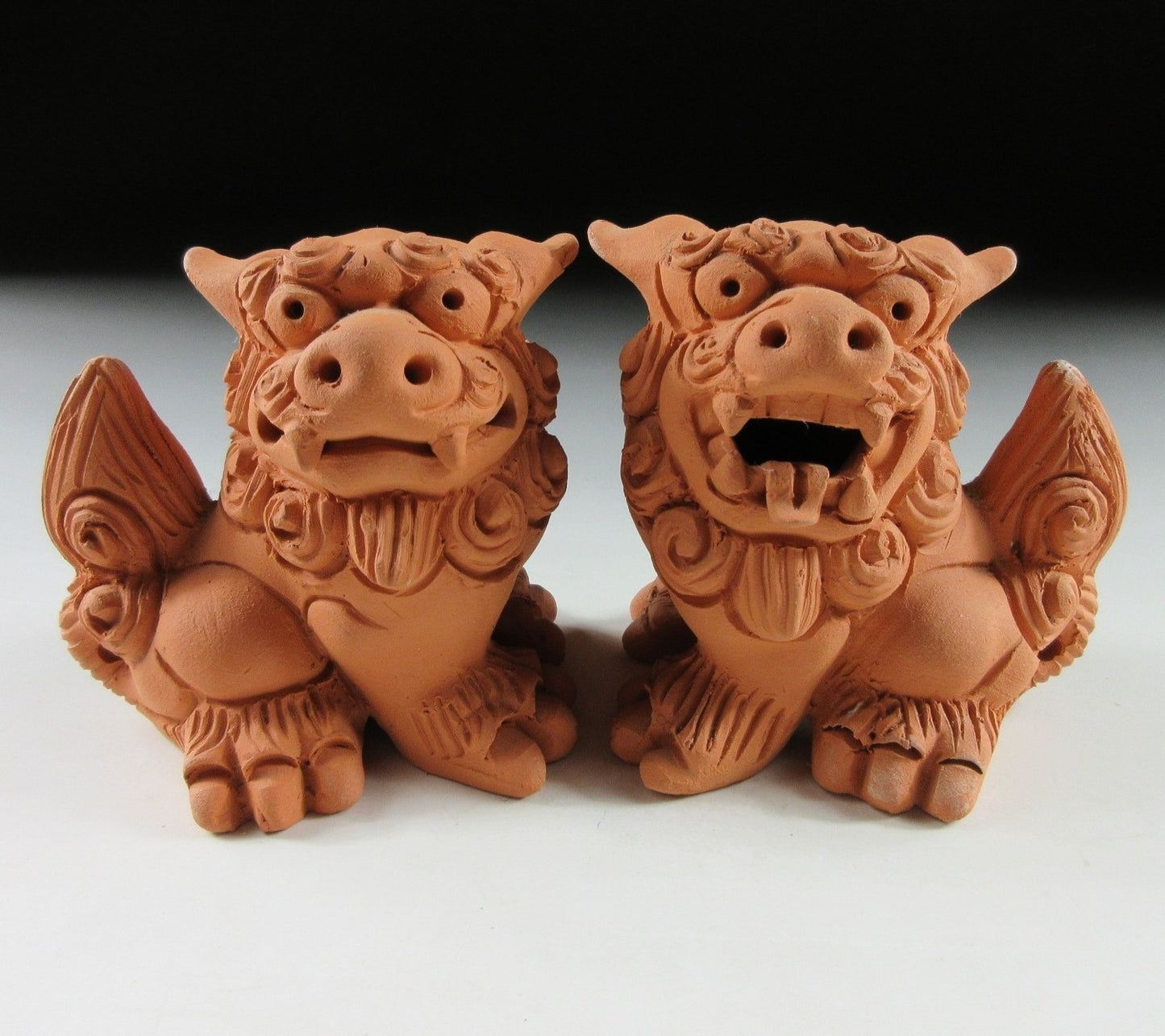 Shisa are a traditional Ryukyuan decoration, often in pairs, resembling a cross between a lion and a dog, from Okinawan mythology. People place pairs of shisa on their rooftops or flanking the gates to their houses. Shisa are believed to protect from homes from various types of evils. When in pairs, the left shisa traditionally has a closed mouth, the right one an open mouth. The open mouth wards off evil spirits, and the closed mouth keeps good spirits in.