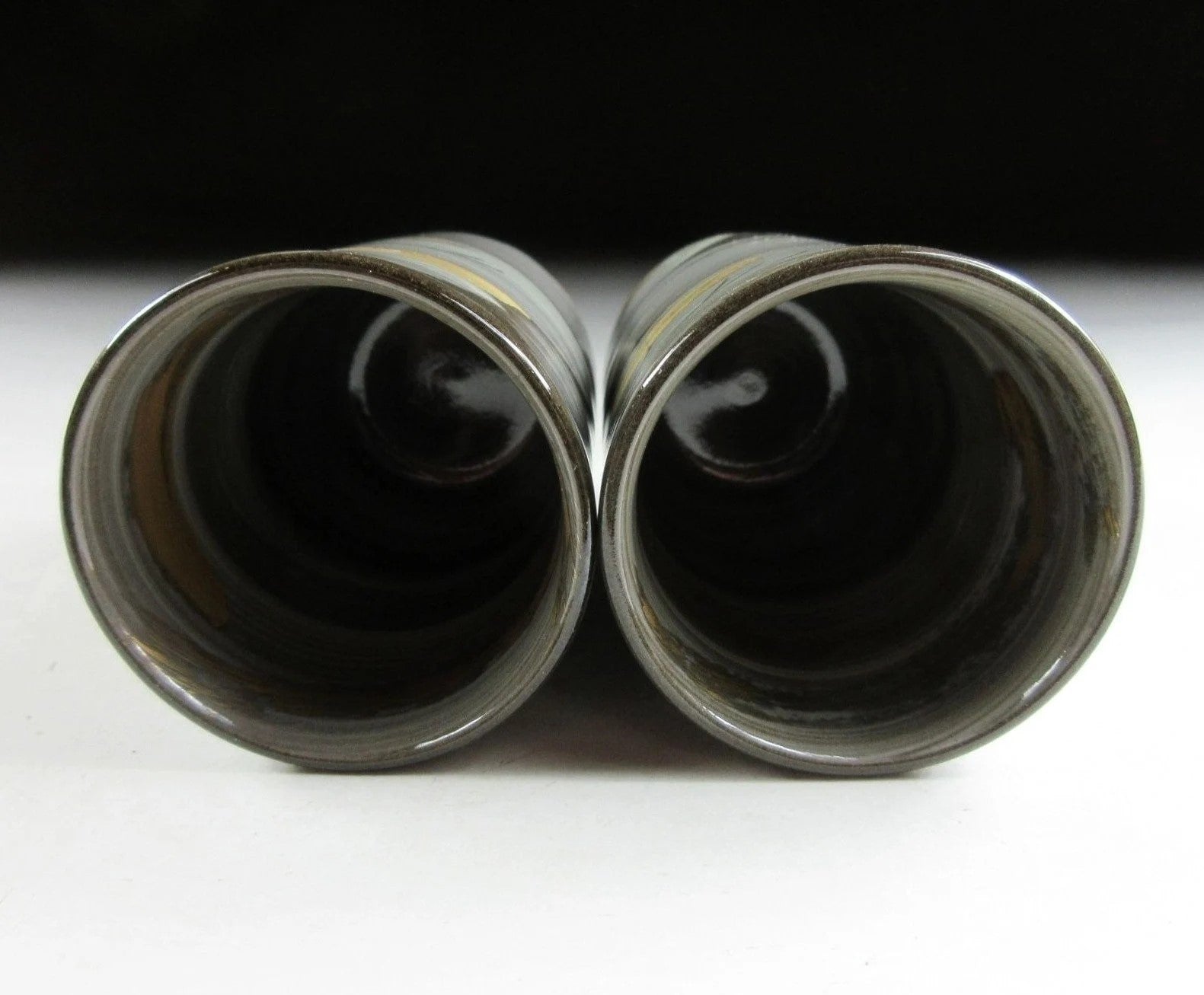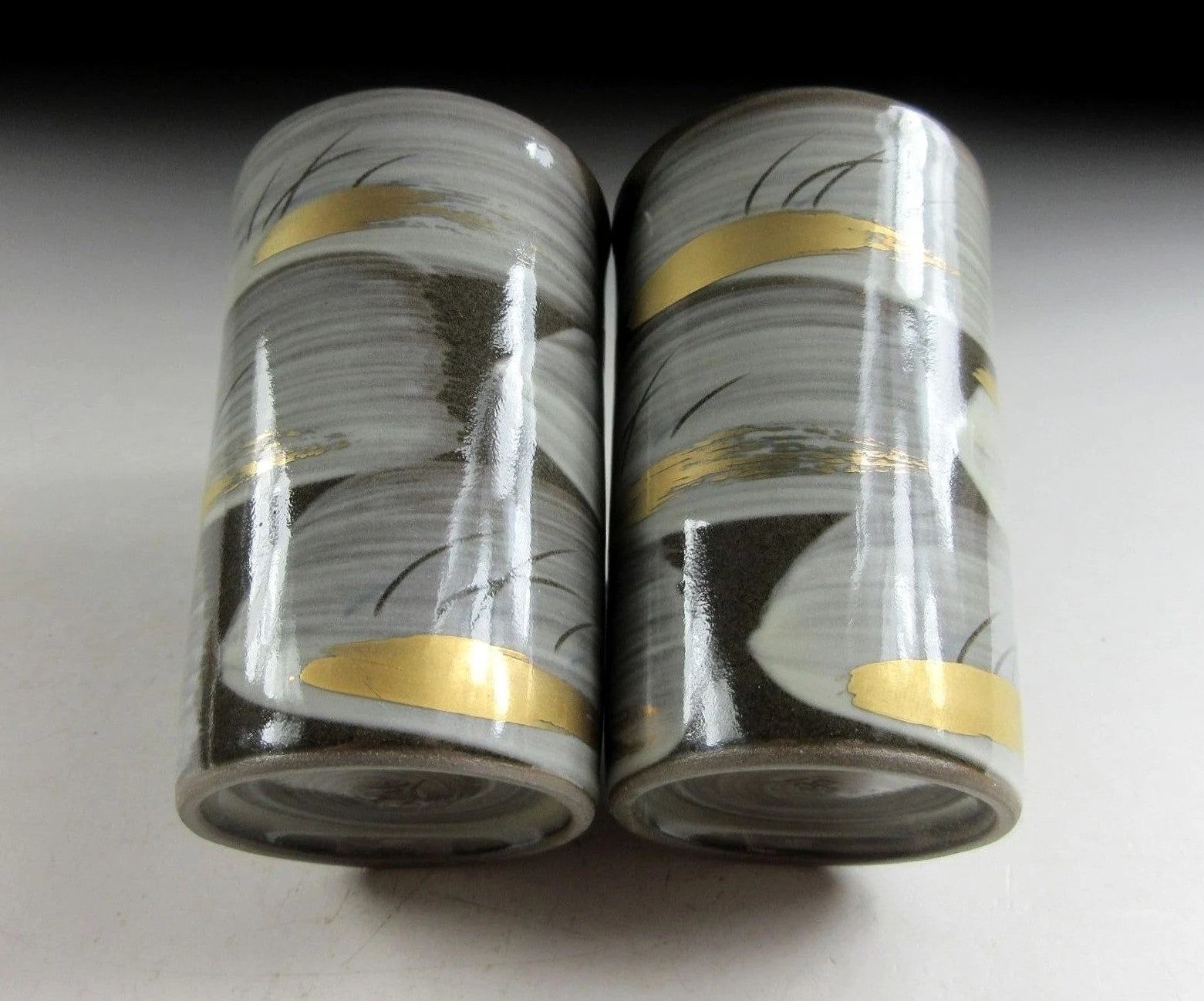 This listing is for a pair of VERY SMALL Utsutsugawa-ware yunomi tea cups made around 20 years ago by Yokoishi Gagyu XIII. They are wheel-thrown and decorated with white slip and gold enamel brushwork over a high-fired stoneware base. The exterior also features a simple pattern of lines suggestive of autumn grass swaying in the breeze. The signature of the potter can be found on the bottom of each cup, and they come with their original signed wooden storage box. THESE CUPS ARE VERY SMALL, PLEASE CHECK THE MEASUREMENTS CAREFULLY BEFORE ORDERING. ALSO PLEASE NOTE THAT THE CHASEN TEA WHISK IS NOT INCLUDED.