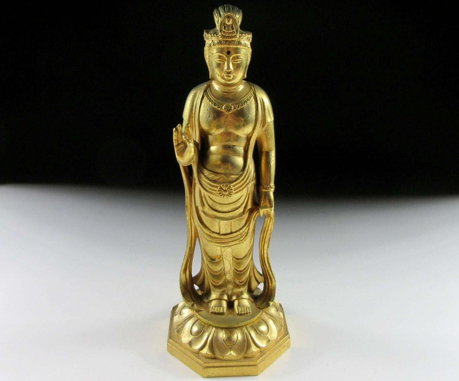 Amida Nyorai is the Japanese translation of the Sanskrit name ‘Amitabha Tathagata’. According to legend Amida Nyorai was once a king who rejected his throne and then became a Buddha by committing to forty eight vows. He is known as the Buddha of infinite light, because it is thought that his radiance is infinite and can illuminate in ten directions without obstruction. He is also referred to as the Buddha of infinite life, because his lifespan is without limit. He is often seated in lotus position on a jewel lotus. The lotus is significant as it is a symbol of purity.