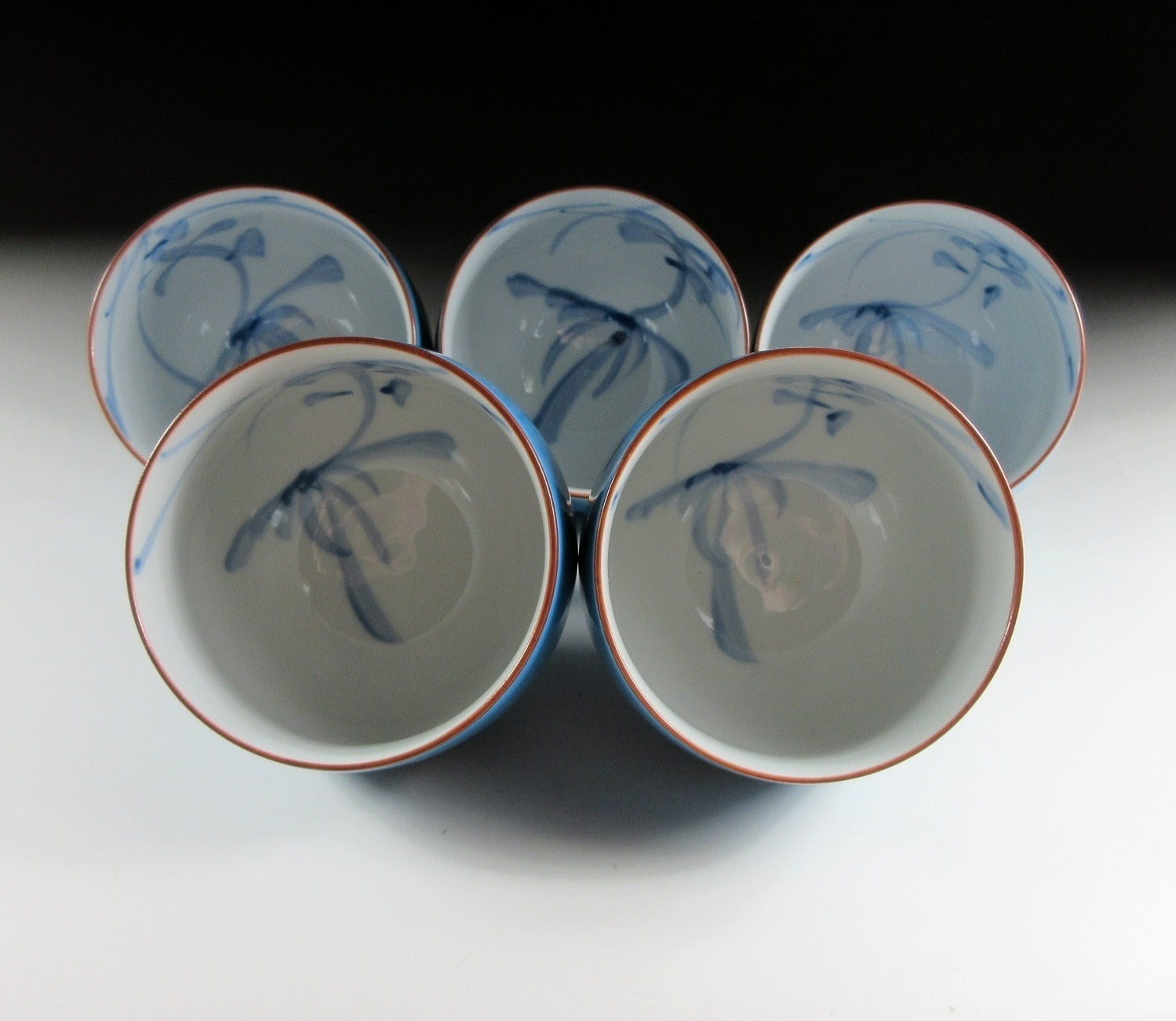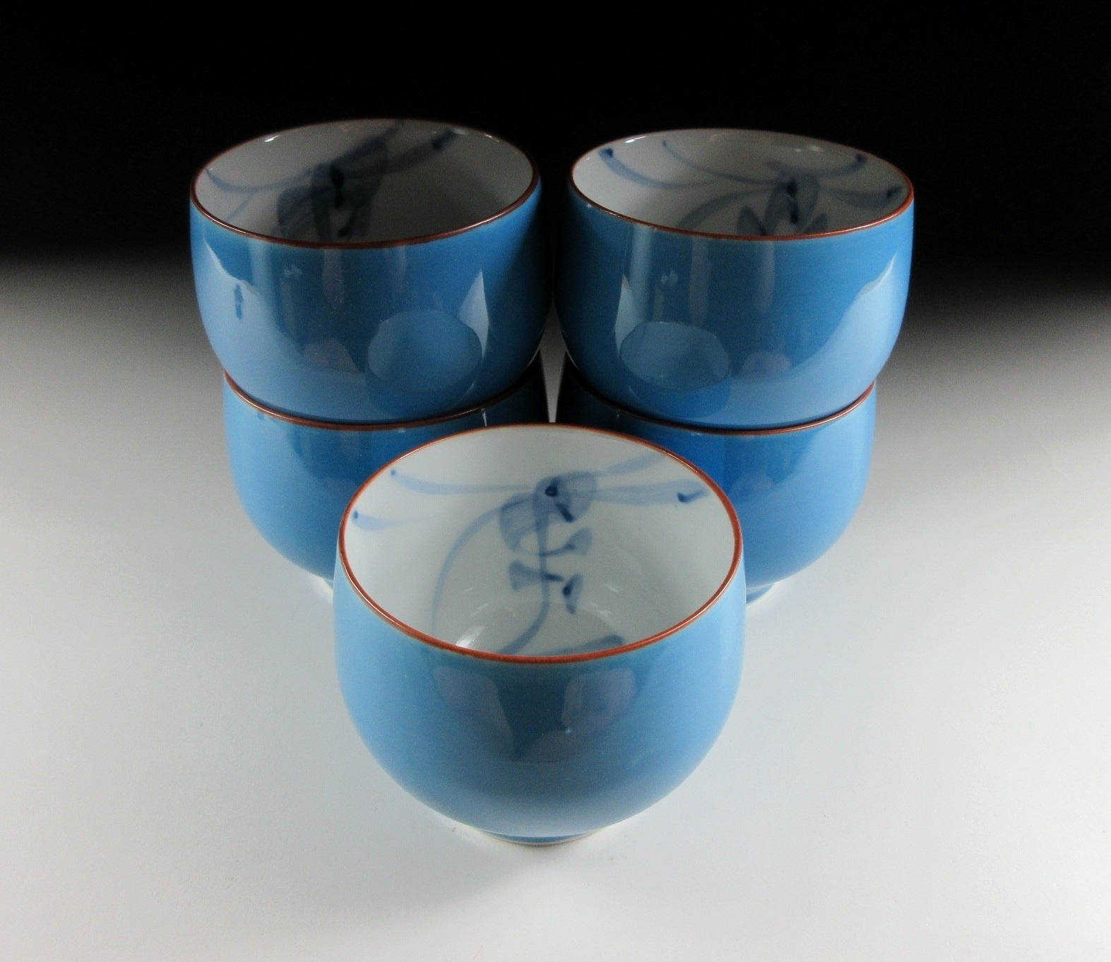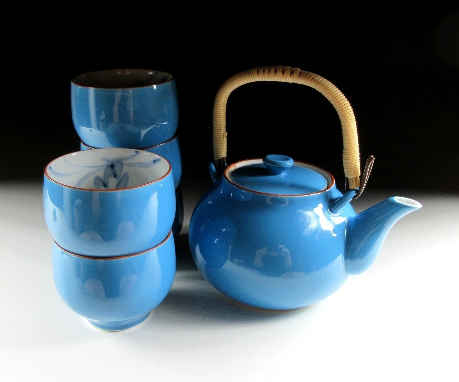 This listing is for an Arita-ware tea set made around 20 years ago and signed ‘Shozan’. Each piece is wheel-thrown and the exterior is coated in azure blue glaze. The interior of the teacups is decorated with blue brushwork, and the rims are trimmed with brown. The handle of the teapot is made of bamboo and wrapped in a durable type of synthetic material, and it can be easily taken on and off for cleaning. The pot has a capacity of 500ml. This set is ideal for daily use, and the signature of the potter/kiln can be found on the bottom of each piece.