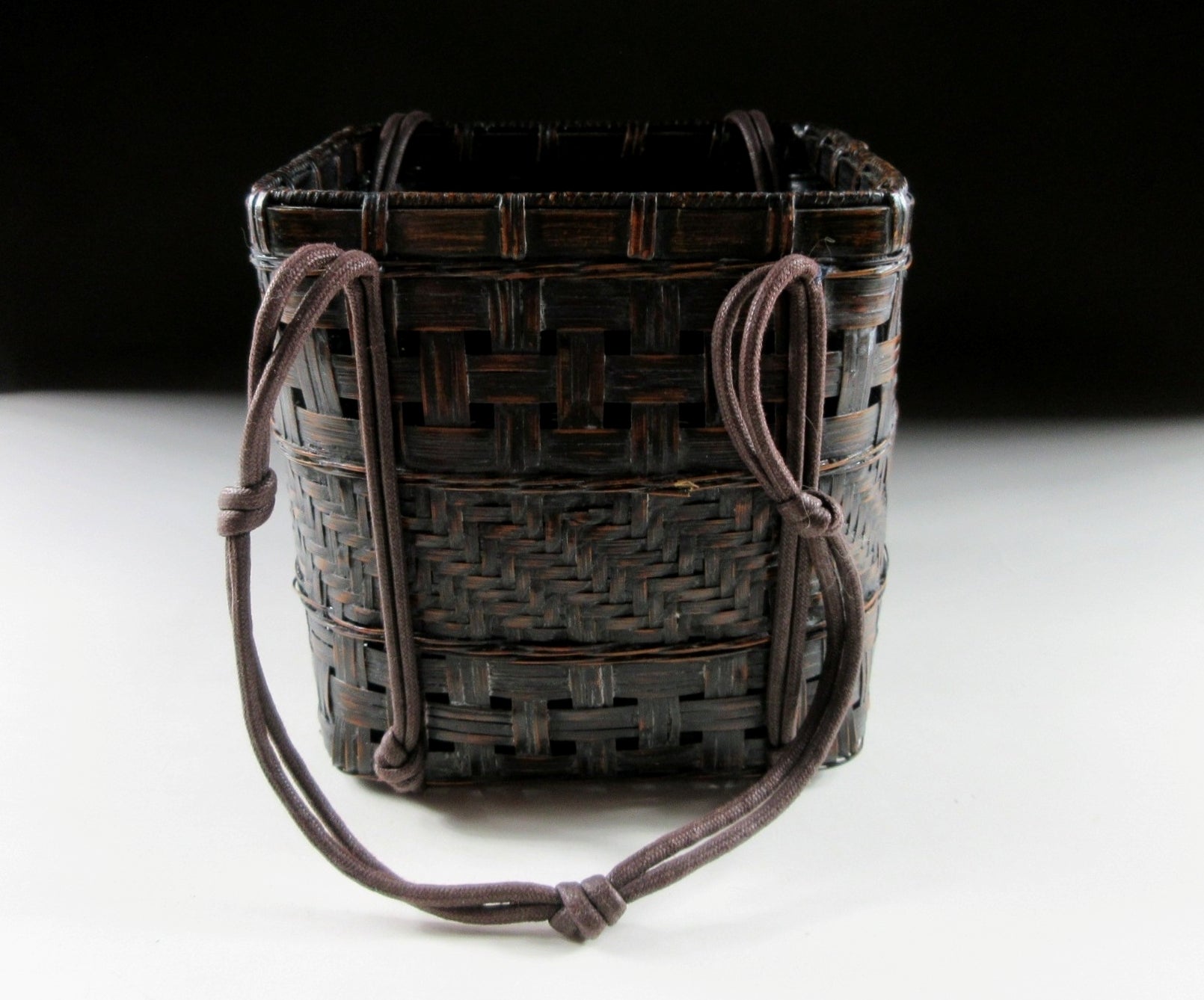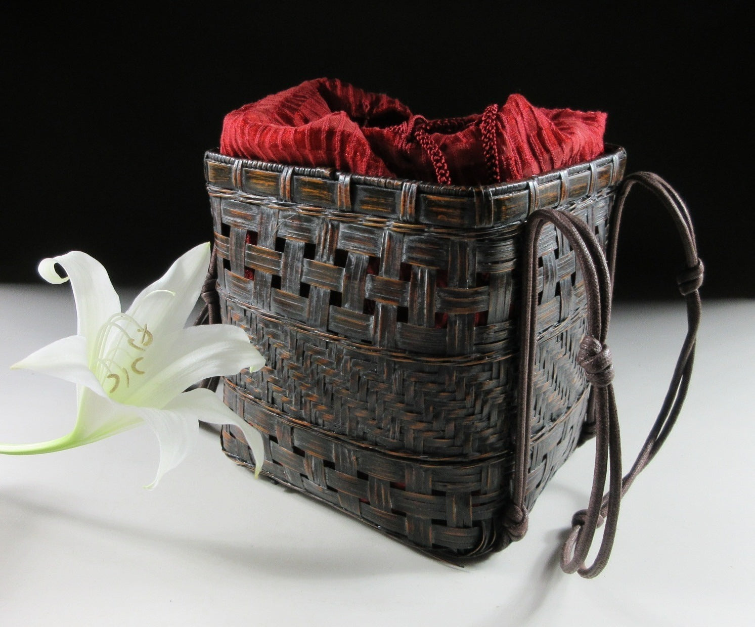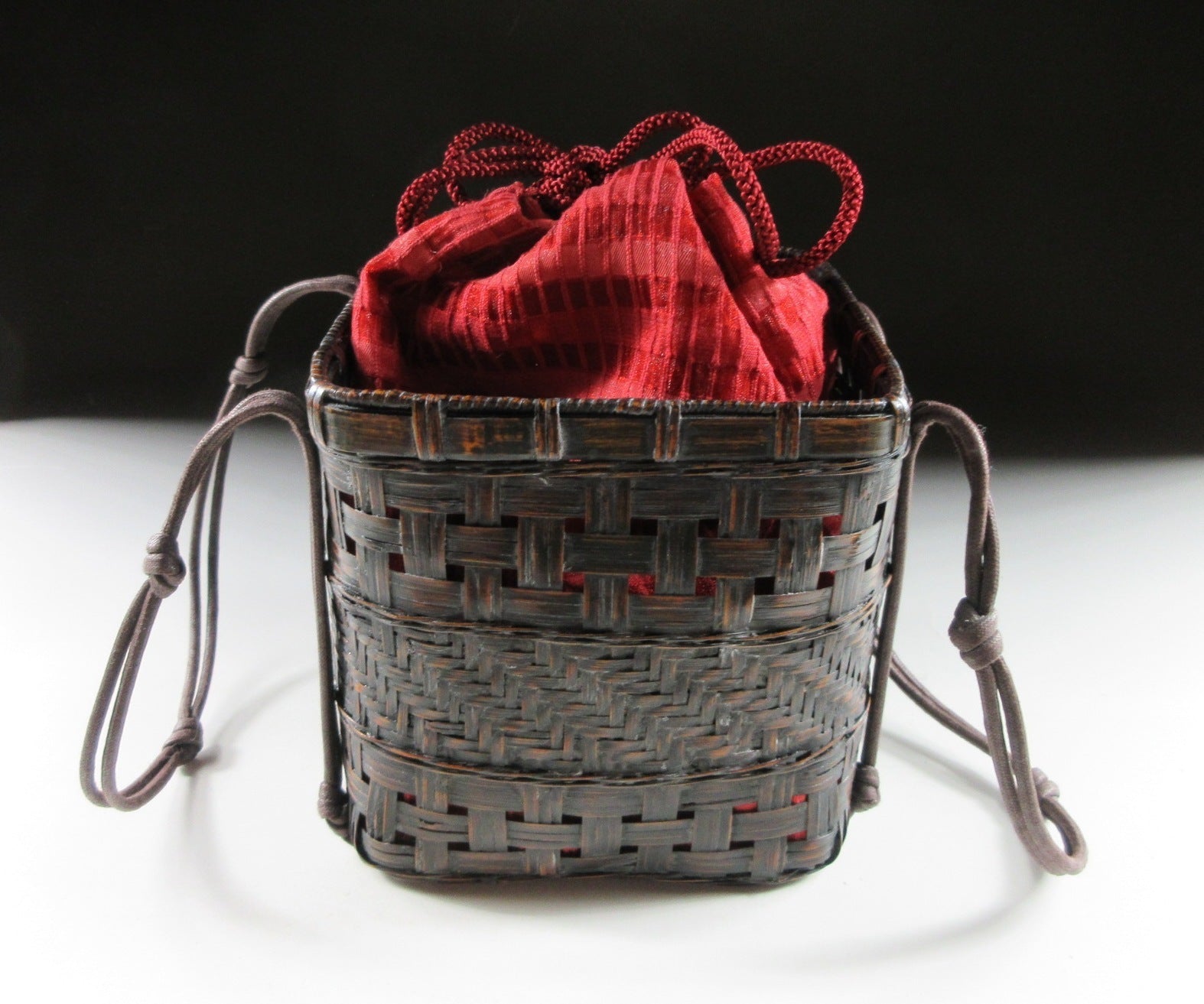This listing is for a vintage bamboo basket accessory made around 10 years ago by Bushoan. The basket is made of lacquered bamboo and it has a removable red drawstring bag on the interior. The handle of the bag has cotton straps, and this particular type of bag is carried by ladies when wearing yukata.