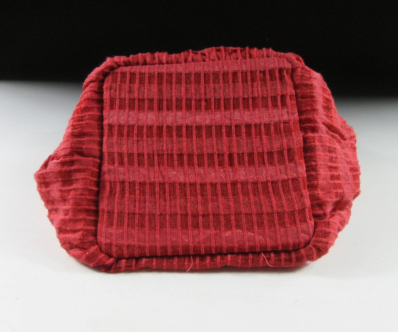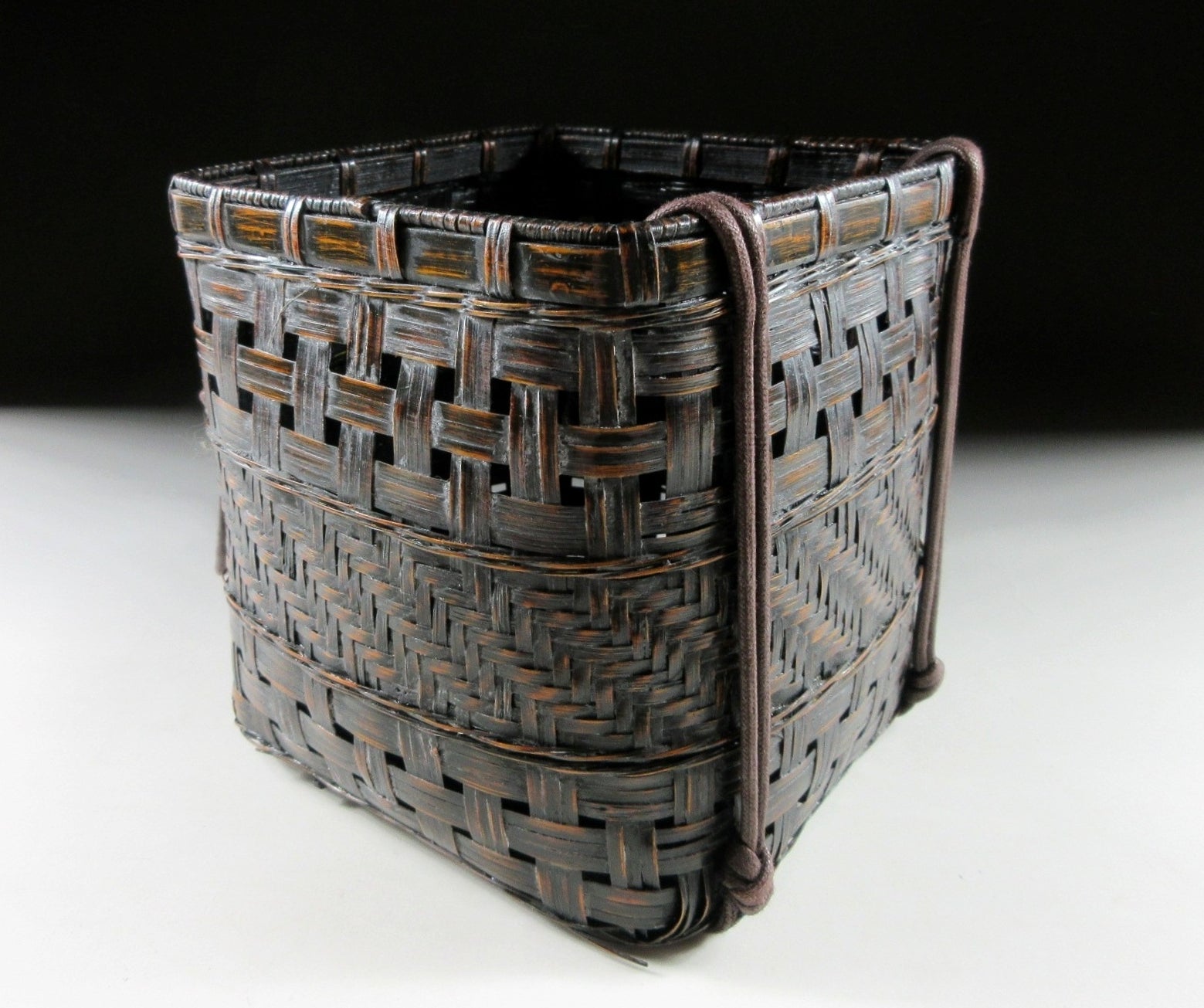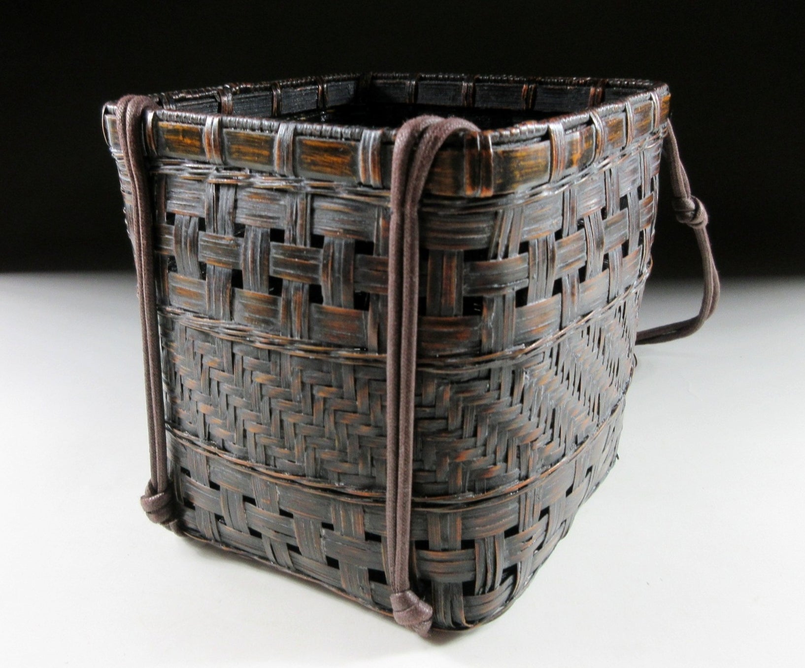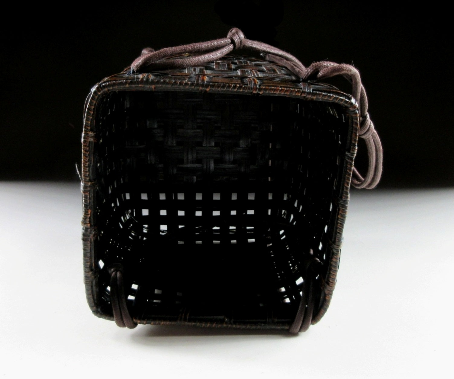 This listing is for a vintage bamboo basket accessory made around 10 years ago by Bushoan. The basket is made of lacquered bamboo and it has a removable red drawstring bag on the interior. The handle of the bag has cotton straps, and this particular type of bag is carried by ladies when wearing yukata.