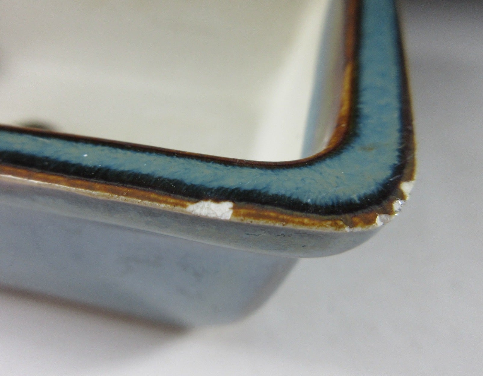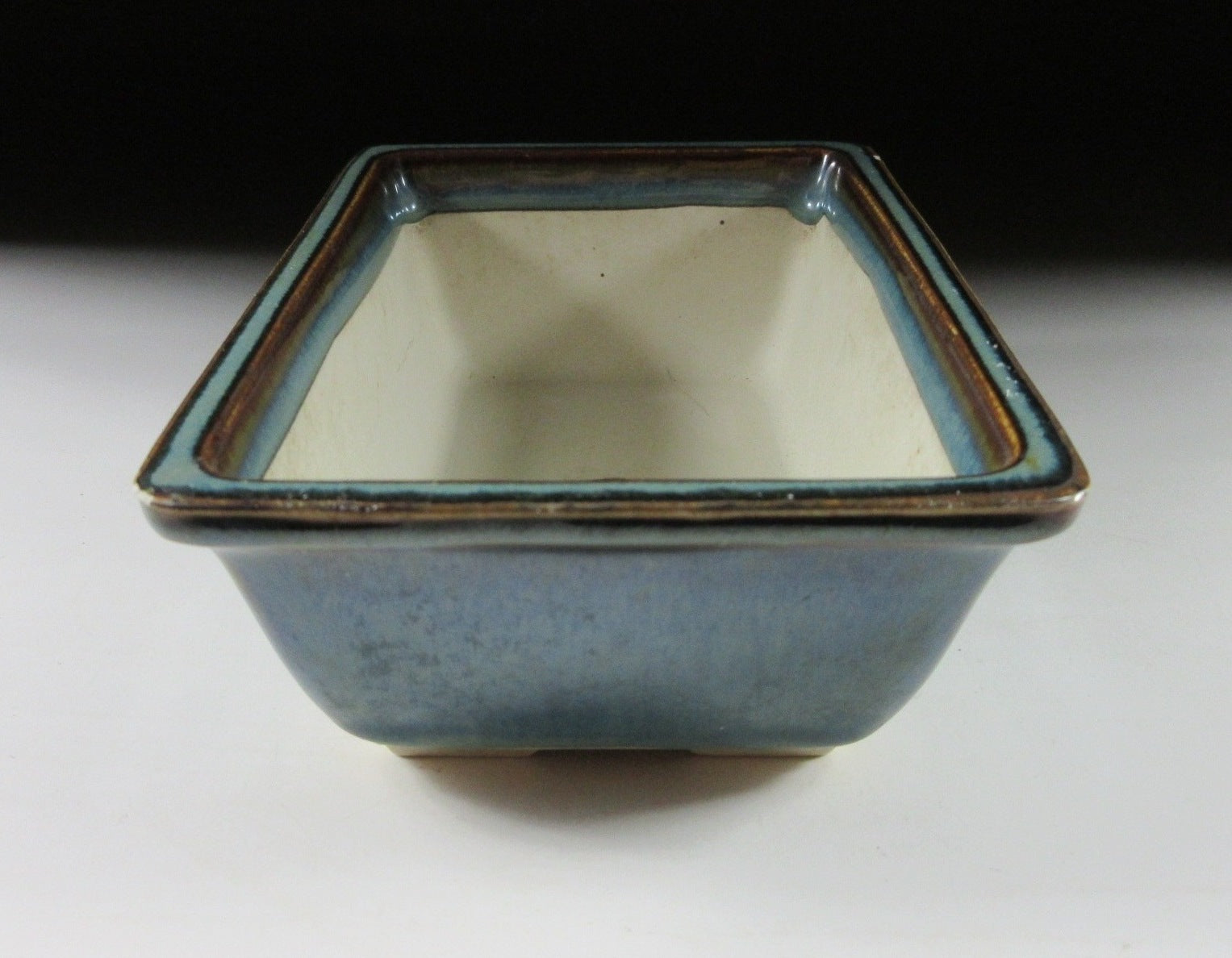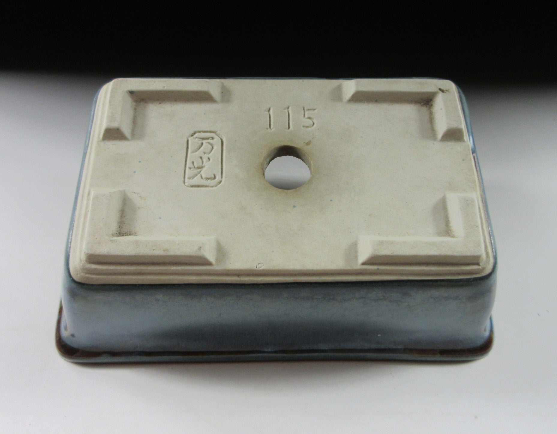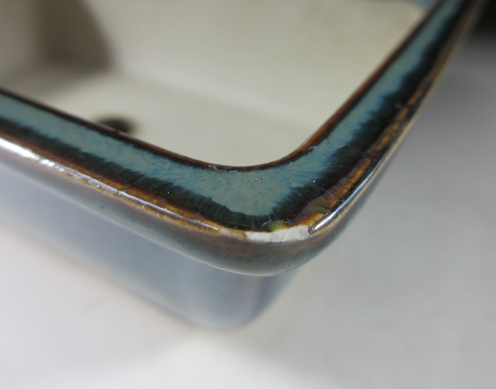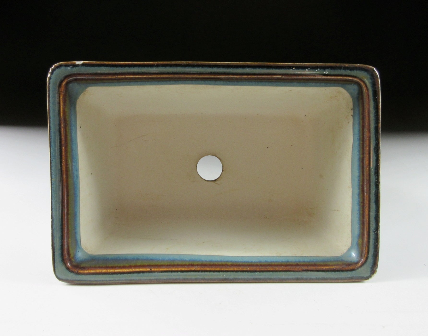 This listing is for a vintage bonsai planter made around 30 years ago. It is made of low-fired stoneware slip, and coated in bluish coloured glaze. These types of pots are made from press moulds and fired in production grade kilns. The size is big enough for growing small types of trees such as junipers.