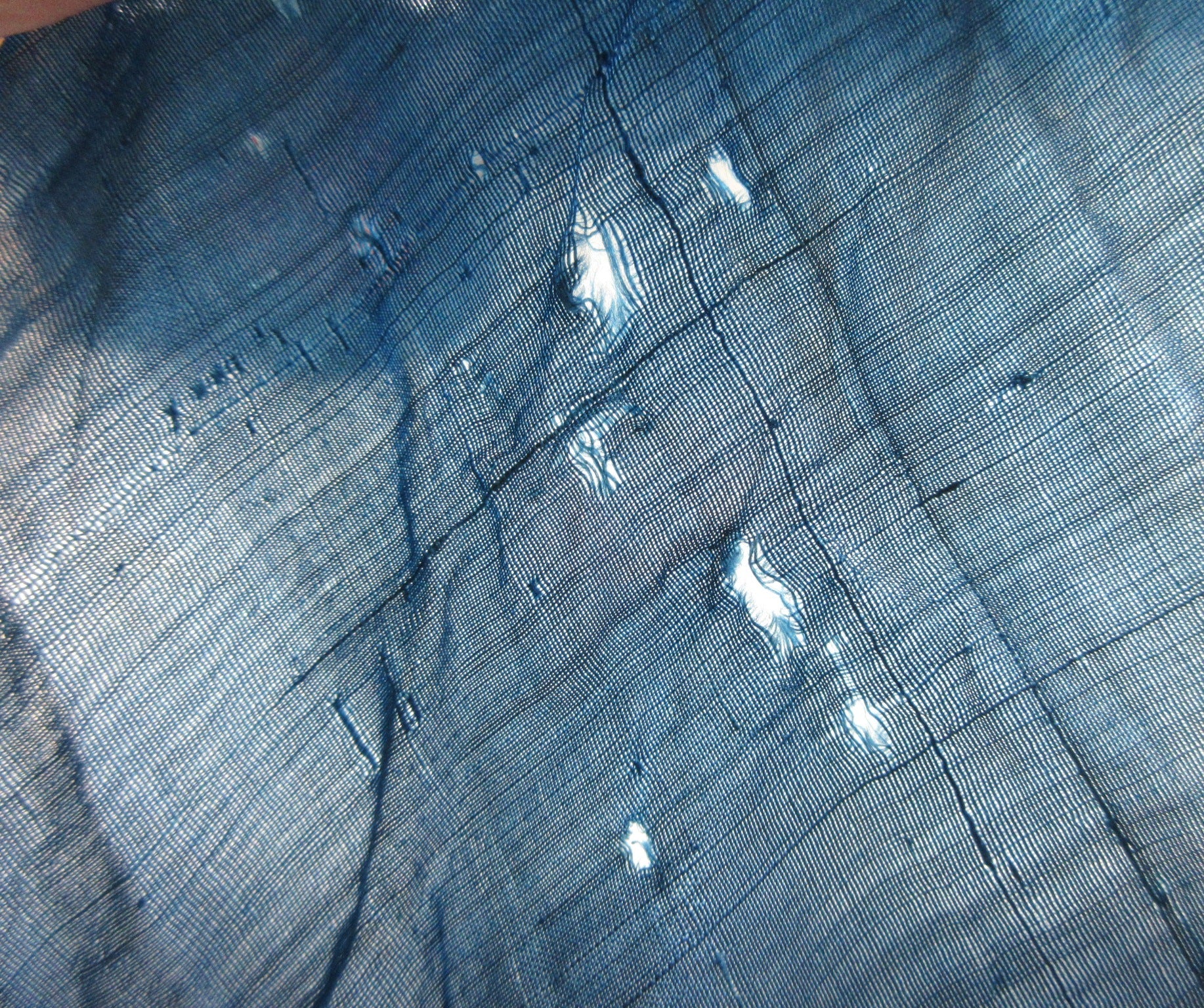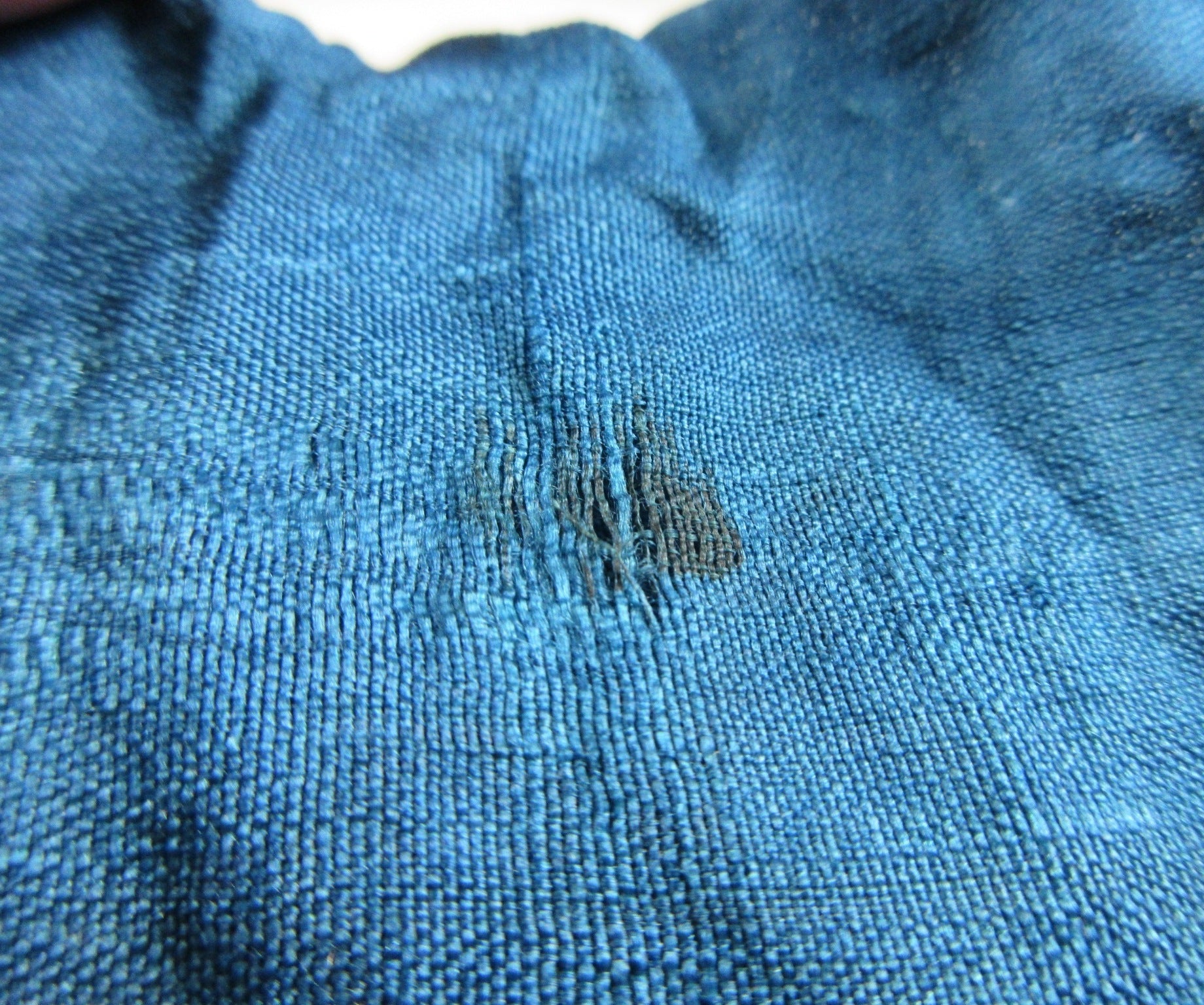 It’s in very good condition aside from slightly dull lacquer, some light scratches (especially on the lid), and slight wear on the bottom. There are holes in the blue wrapping cloth, and there’s a wood borer hole in the box.