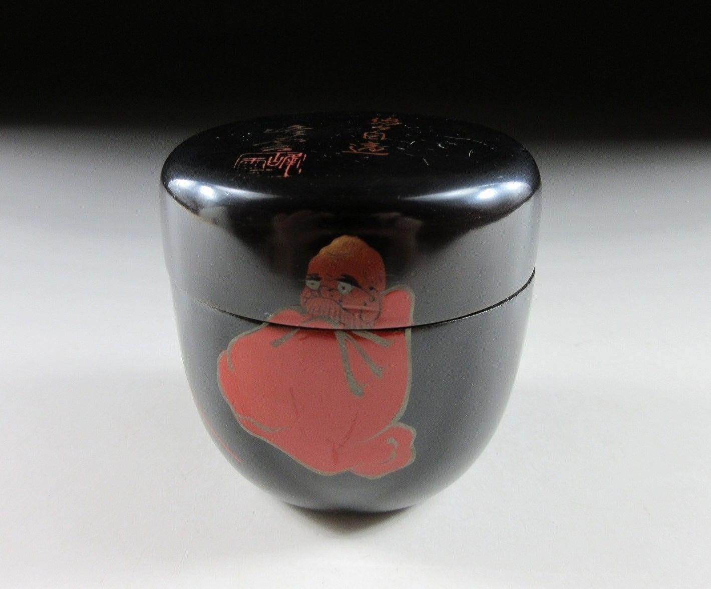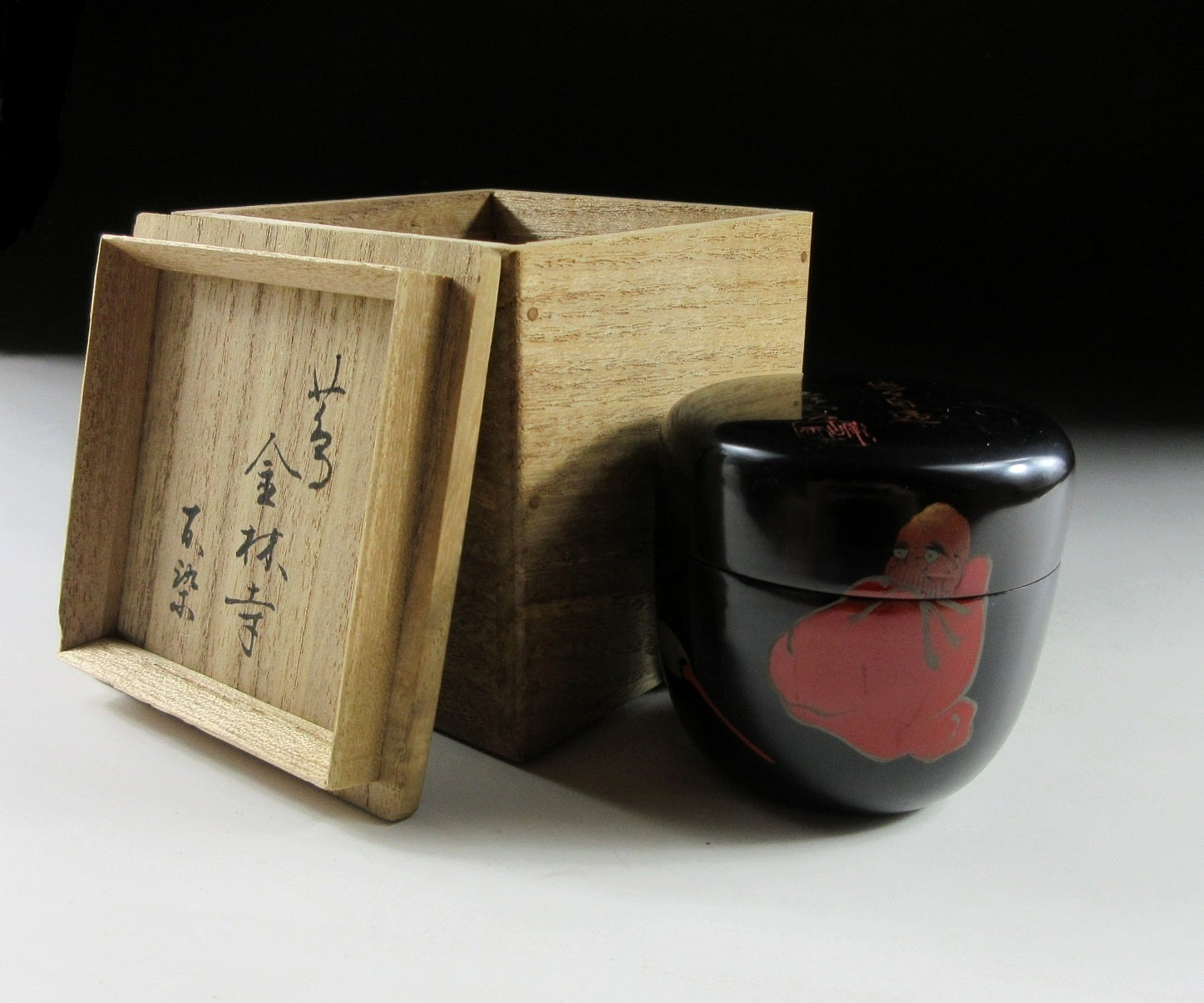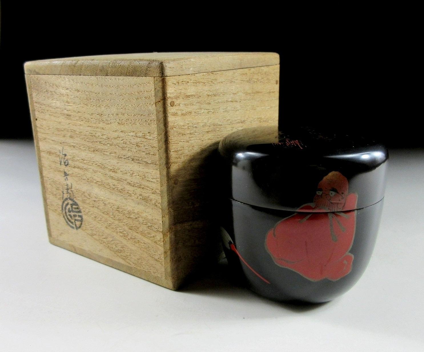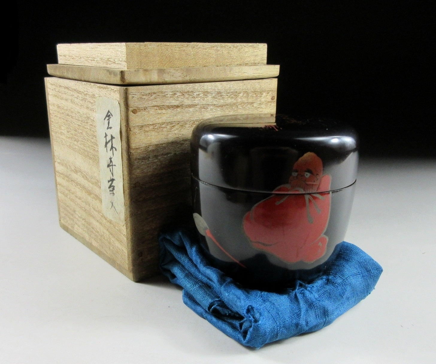 This listing is for an urushi lacquerware natsume made around 50-60 years ago. It is made of wood and the front is decorated with a makie image of Daruma and a flywhisk. The flywhisk has a double meaning, not only is it a practical tool for swatting away mosquitoes, but it has also come to symbolize the swishing away of delusive thoughts in Zen Buddhism. The writing on the right side of the lid reads as ‘yuyu jiteki’. ‘Yuyu’ means to be relaxed and calm, and ‘jiteki’ means to live as you please. Together this phrase can mean to withdraw from the secular world and live a leisurely life, or to live as one pleases without being bothered by worldly things. It can also be used to refer to a calm life after retirement. The underside of the lid is inscribed ‘Konrinji Temple’, a Shingon Buddhist temple of the Koya-san lineage located in the mountains of eastern Kochi Prefecture. The exact date of construction is unknown, but it dates back as far as the late Heian period. According to legend it was built in a single night by the priest Kobo Daishi. Kobo Daishi (774-835CE) was a Buddhist monk and the founder of Shingo Esoteric Buddhism. He is known posthumously as Kukai, and he was responsible for the establishment of the Koya-san temple settlement in Wakayama Prefecture. This piece comes with its original signed wooden storage box, as well as a blue wrapping cloth for when it’s not in use.