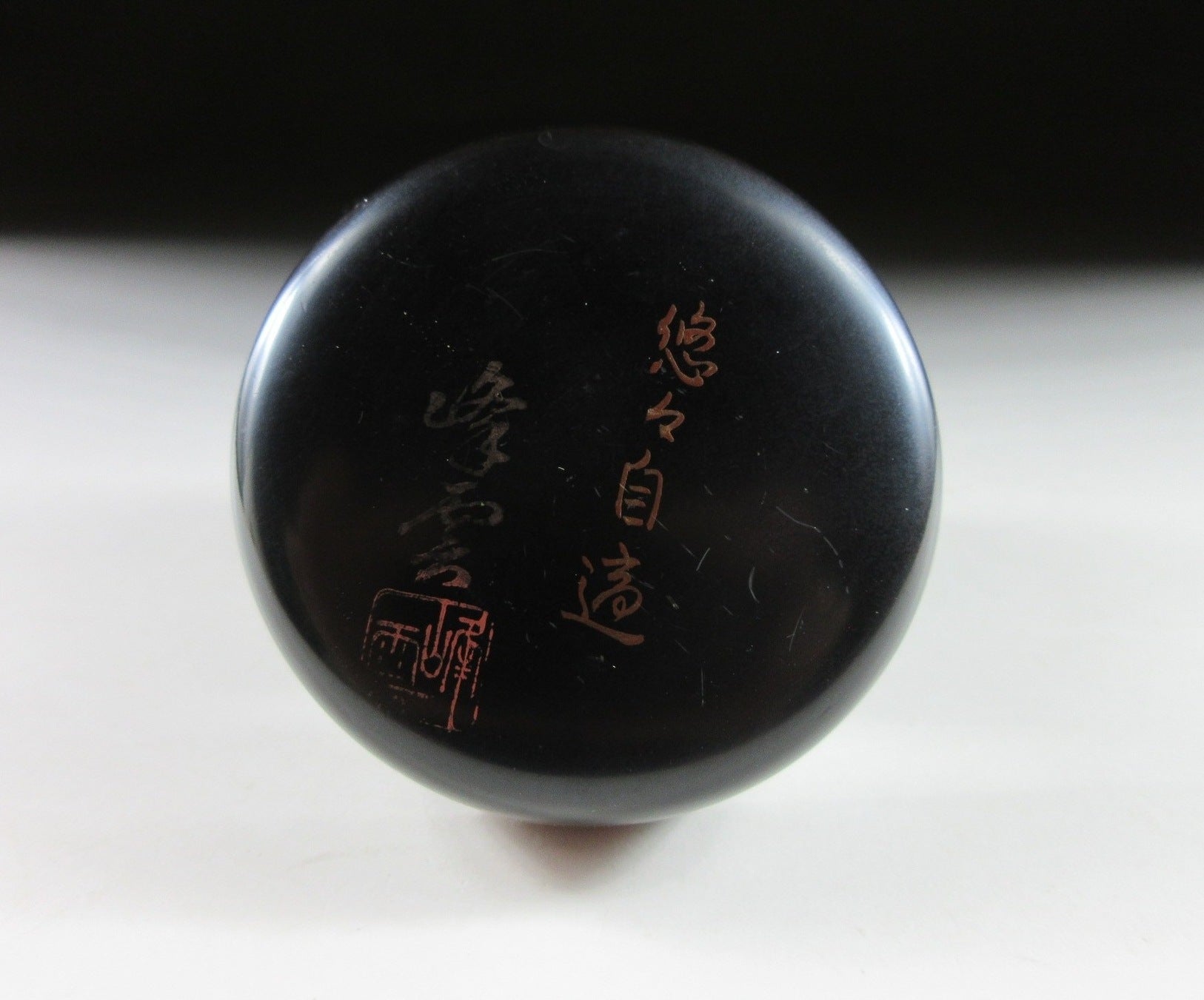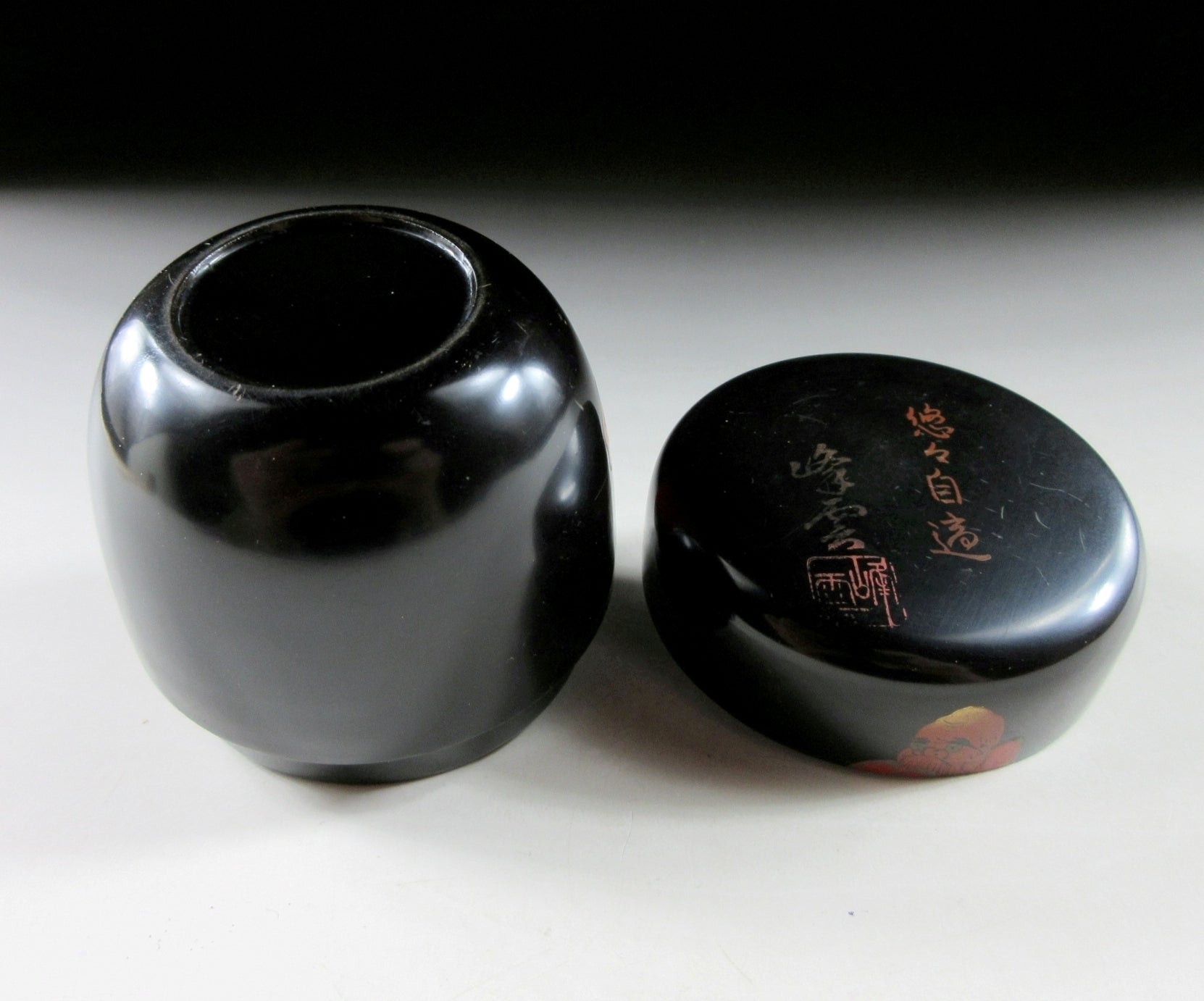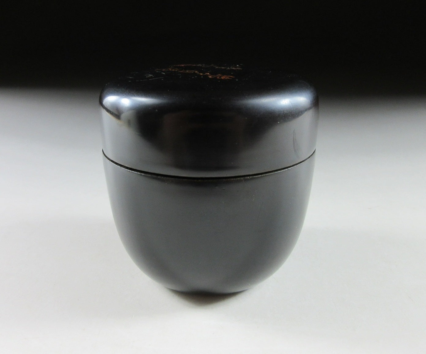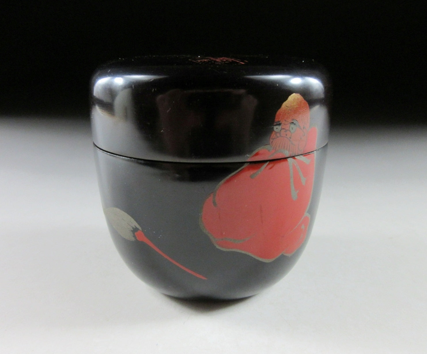 This listing is for an urushi lacquerware natsume made around 50-60 years ago. It is made of wood and the front is decorated with a makie image of Daruma and a flywhisk. The flywhisk has a double meaning, not only is it a practical tool for swatting away mosquitoes, but it has also come to symbolize the swishing away of delusive thoughts in Zen Buddhism. The writing on the right side of the lid reads as ‘yuyu jiteki’. ‘Yuyu’ means to be relaxed and calm, and ‘jiteki’ means to live as you please. Together this phrase can mean to withdraw from the secular world and live a leisurely life, or to live as one pleases without being bothered by worldly things. It can also be used to refer to a calm life after retirement. The underside of the lid is inscribed ‘Konrinji Temple’, a Shingon Buddhist temple of the Koya-san lineage located in the mountains of eastern Kochi Prefecture. The exact date of construction is unknown, but it dates back as far as the late Heian period. According to legend it was built in a single night by the priest Kobo Daishi. Kobo Daishi (774-835CE) was a Buddhist monk and the founder of Shingo Esoteric Buddhism. He is known posthumously as Kukai, and he was responsible for the establishment of the Koya-san temple settlement in Wakayama Prefecture. This piece comes with its original signed wooden storage box, as well as a blue wrapping cloth for when it’s not in use.